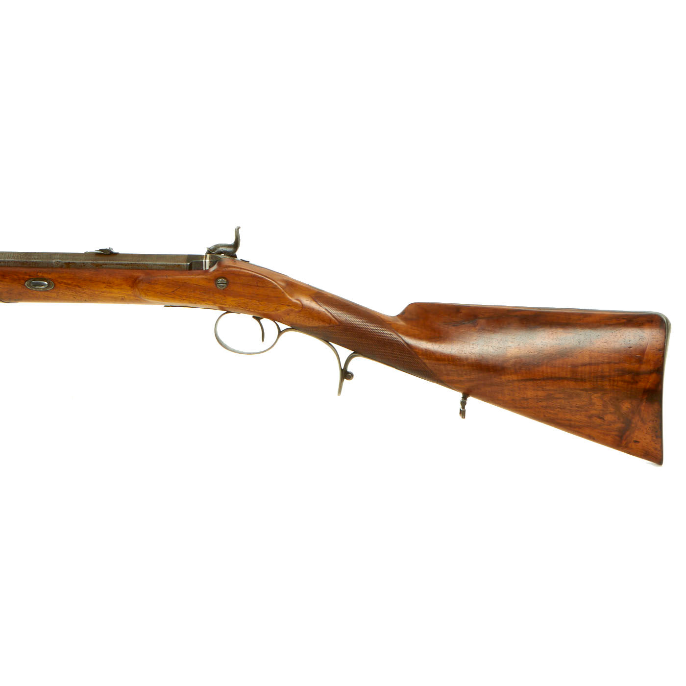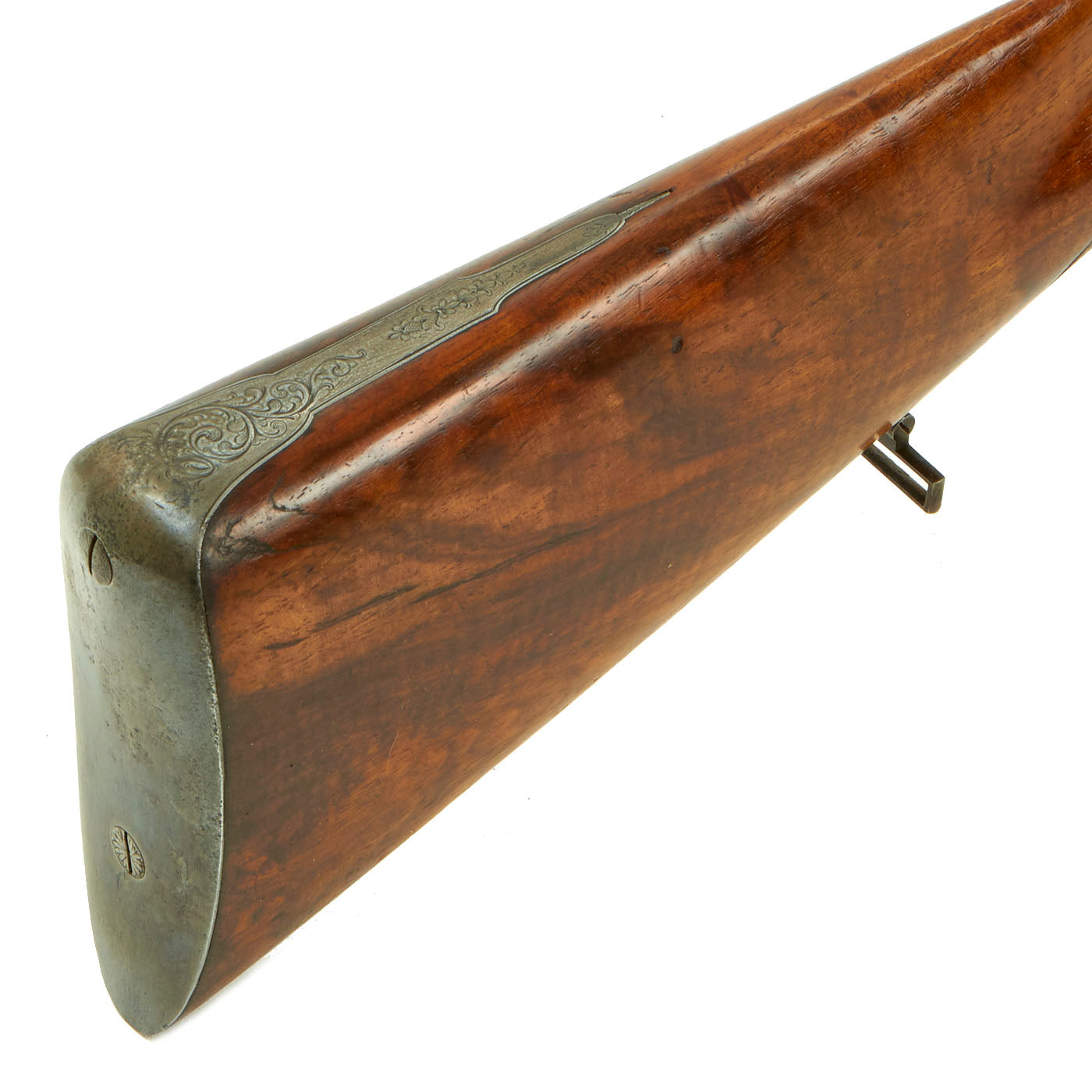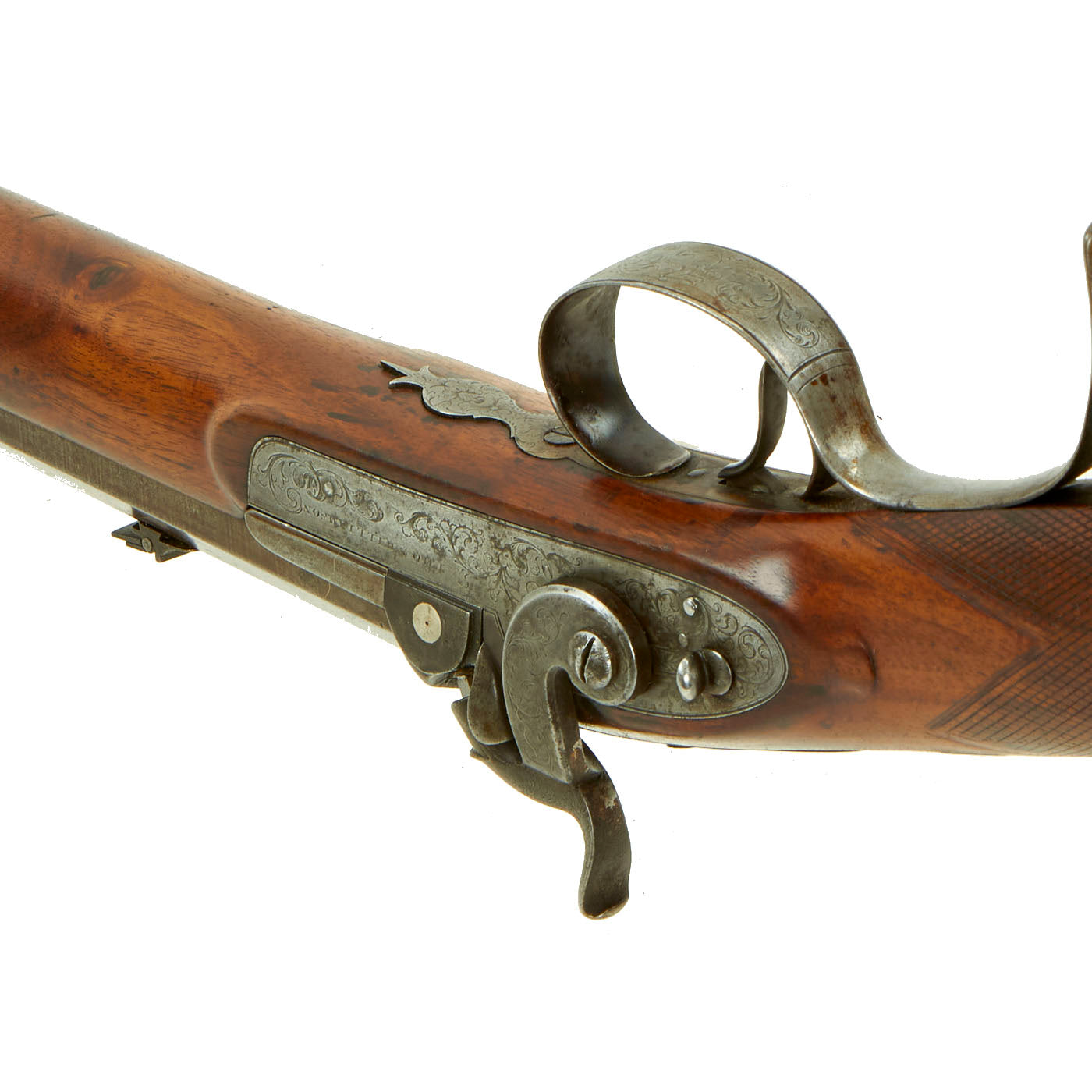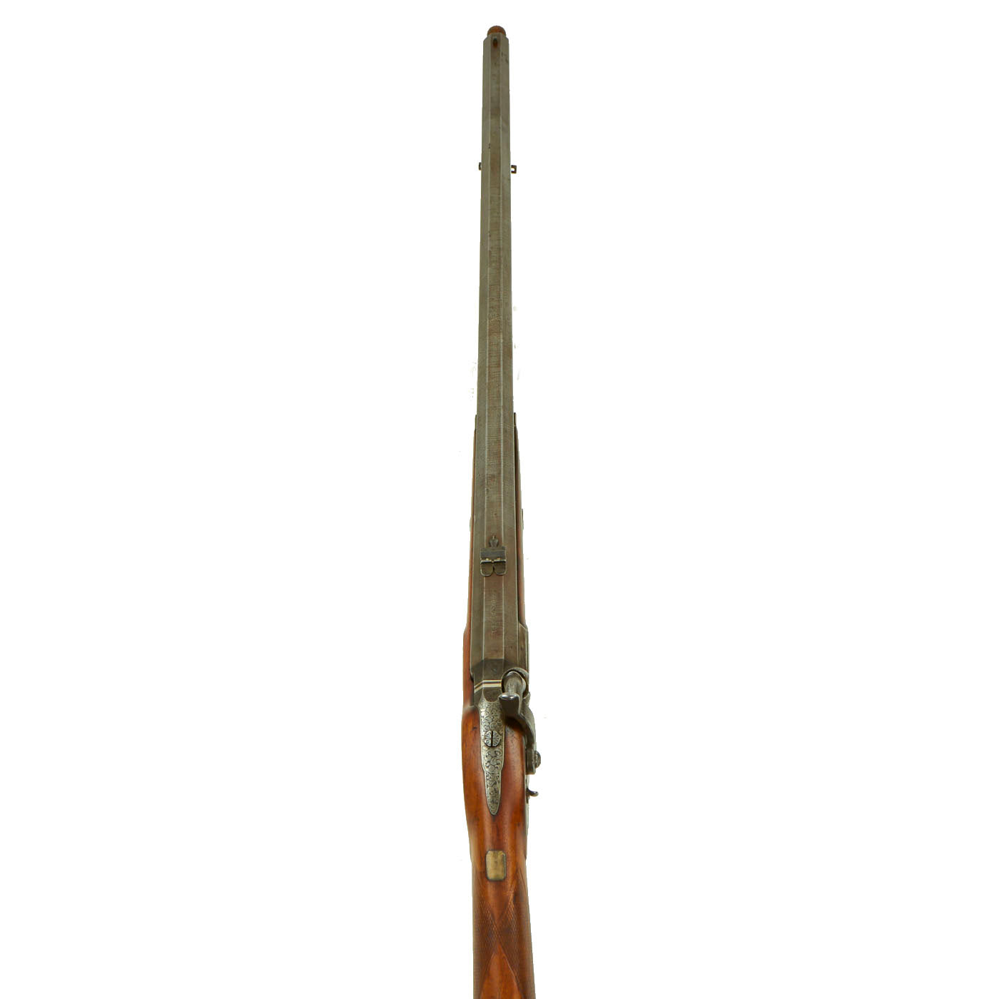 Original Item: Only One Available. This is a magnificent Percussion hunting rifle of approximately .59 Caliber, intended for "big game" as one might find when traveling to various parts of the Victorian British Empire. It features an octagonal twist steel Damascus barrel with heavy 10 groove rifling, and is fitted with a big game rear three leaf flip sight and post front sight.