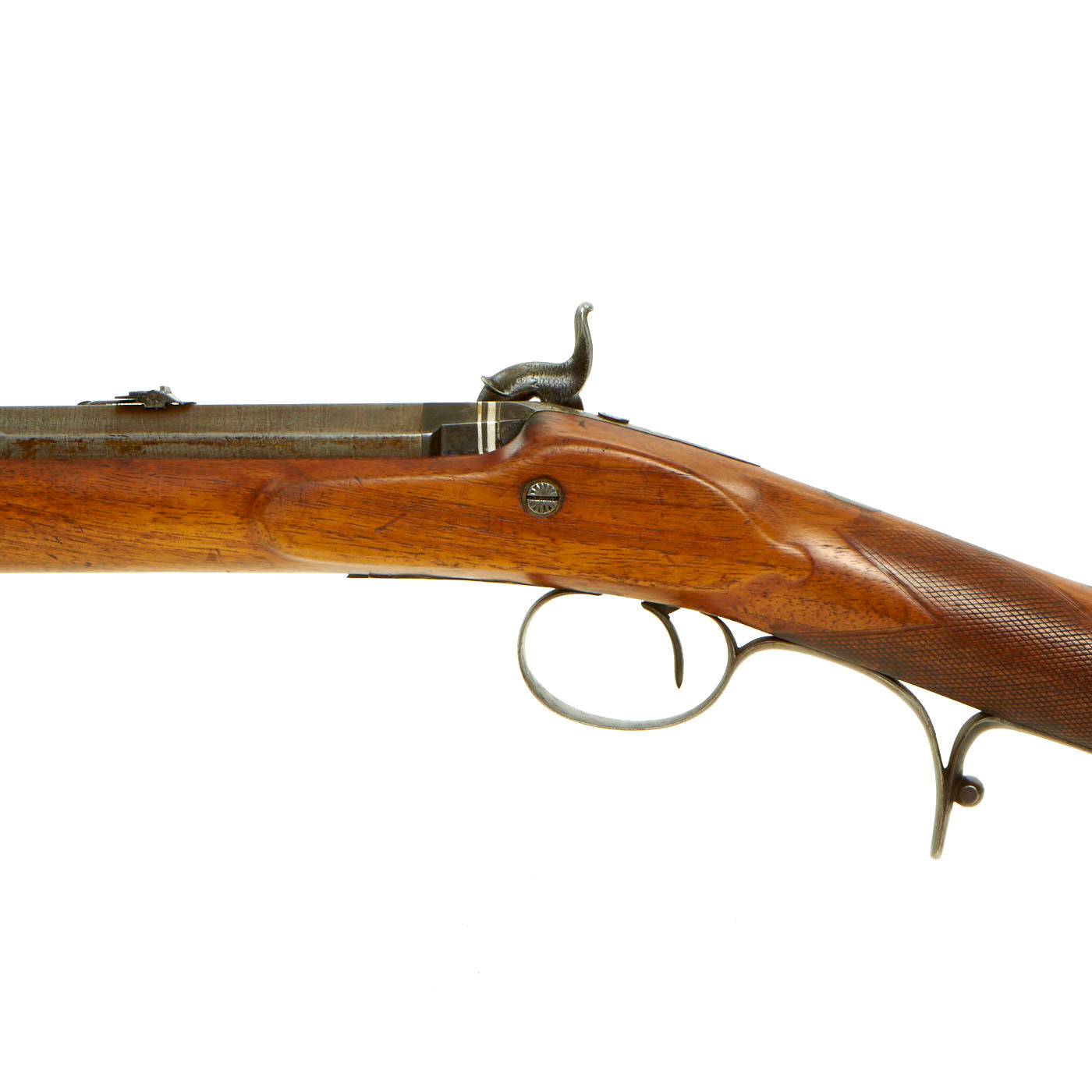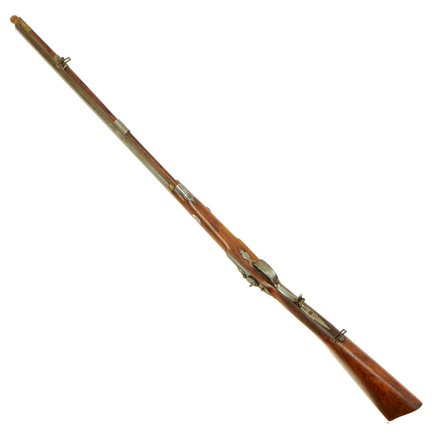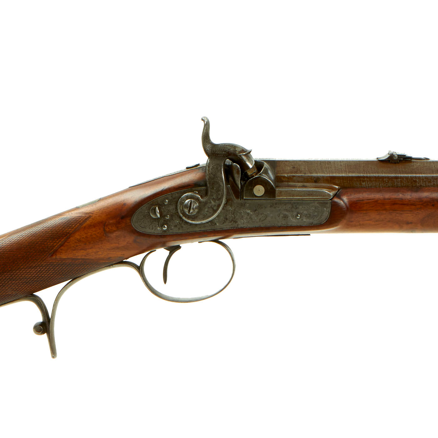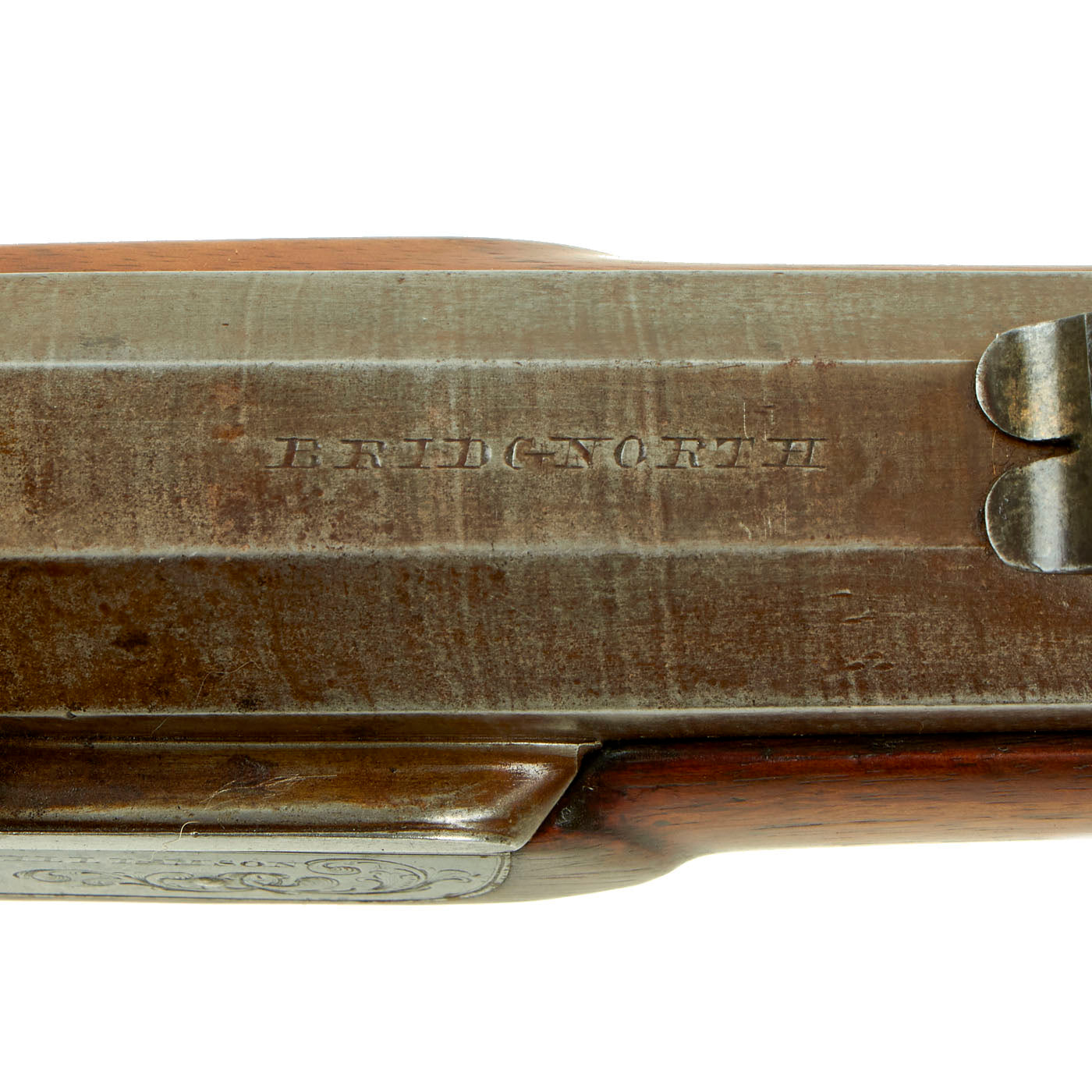 Original Item: Only One Available. This is a magnificent Percussion hunting rifle of approximately .59 Caliber, intended for "big game" as one might find when traveling to various parts of the Victorian British Empire. It features an octagonal twist steel Damascus barrel with heavy 10 groove rifling, and is fitted with a big game rear three leaf flip sight and post front sight.