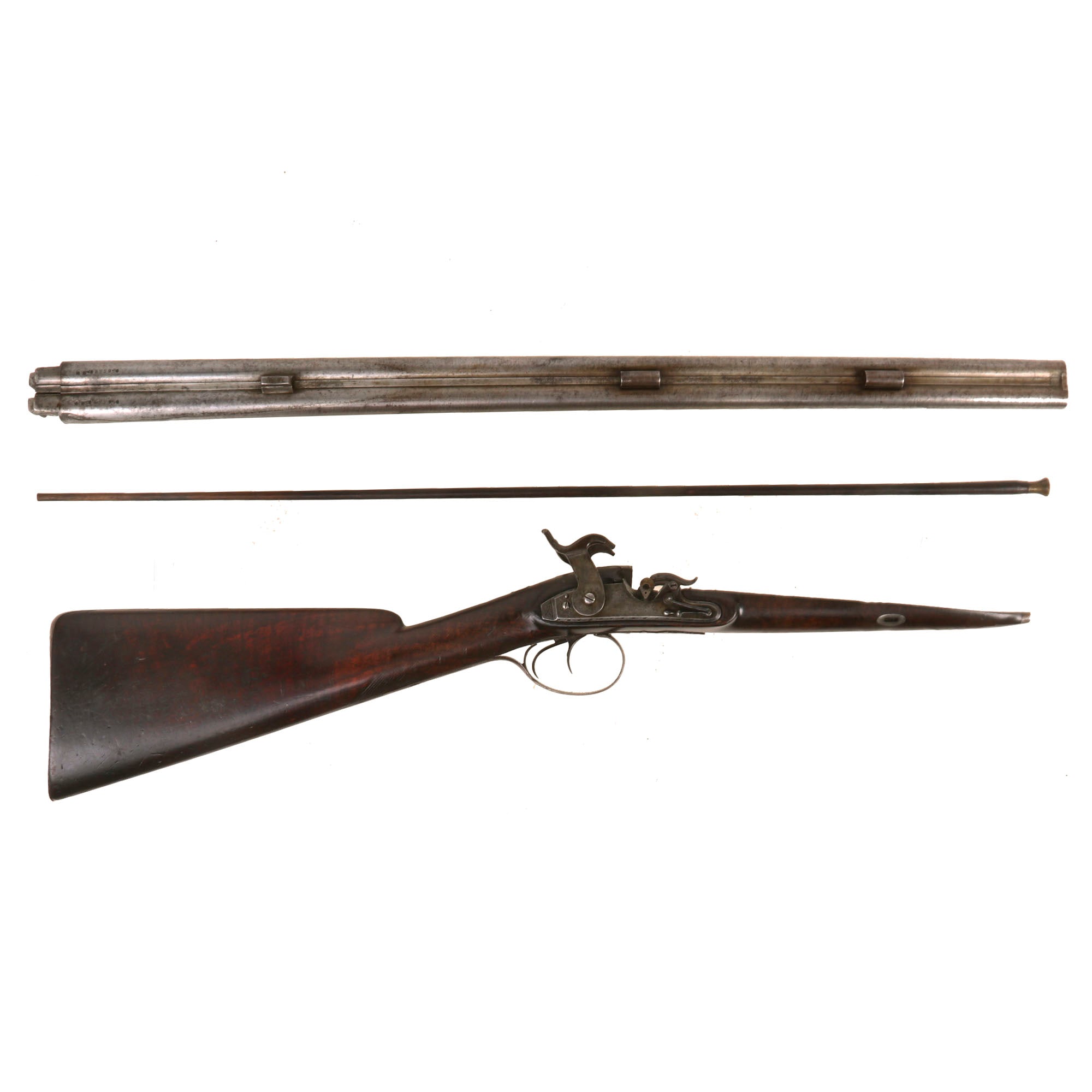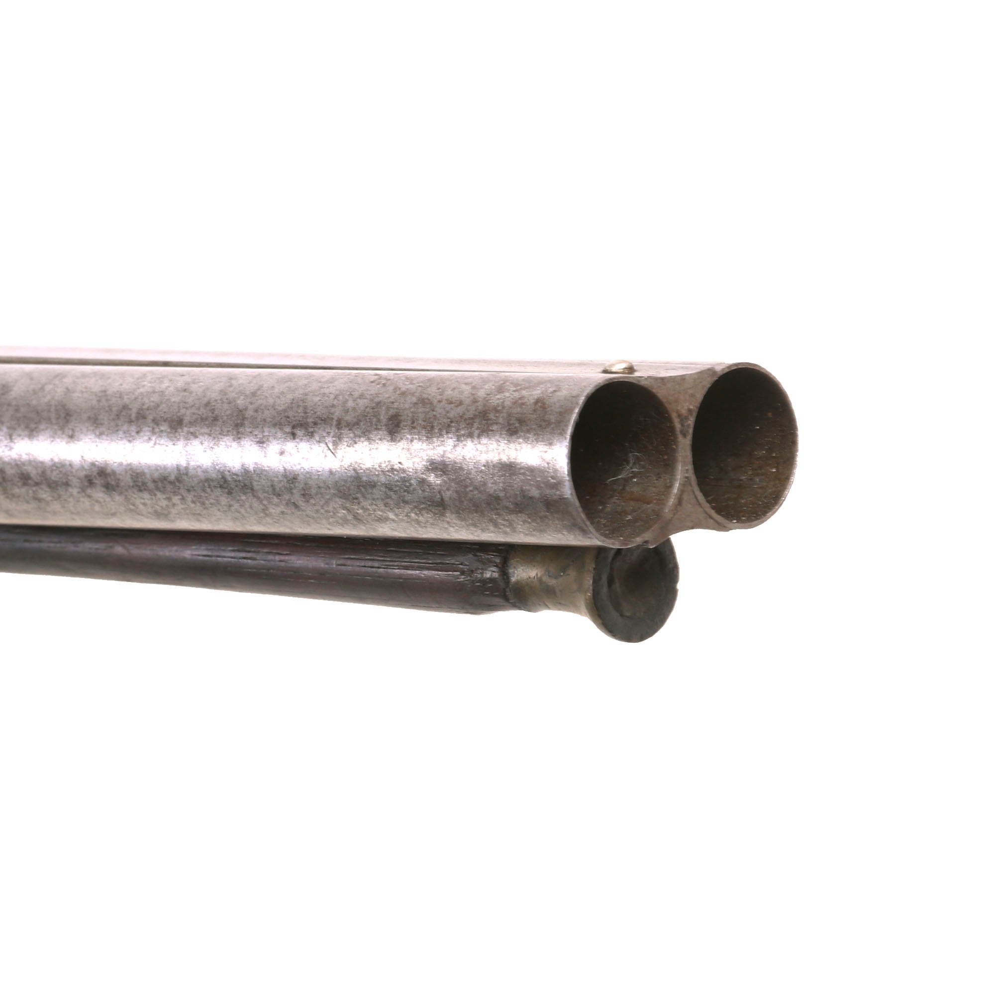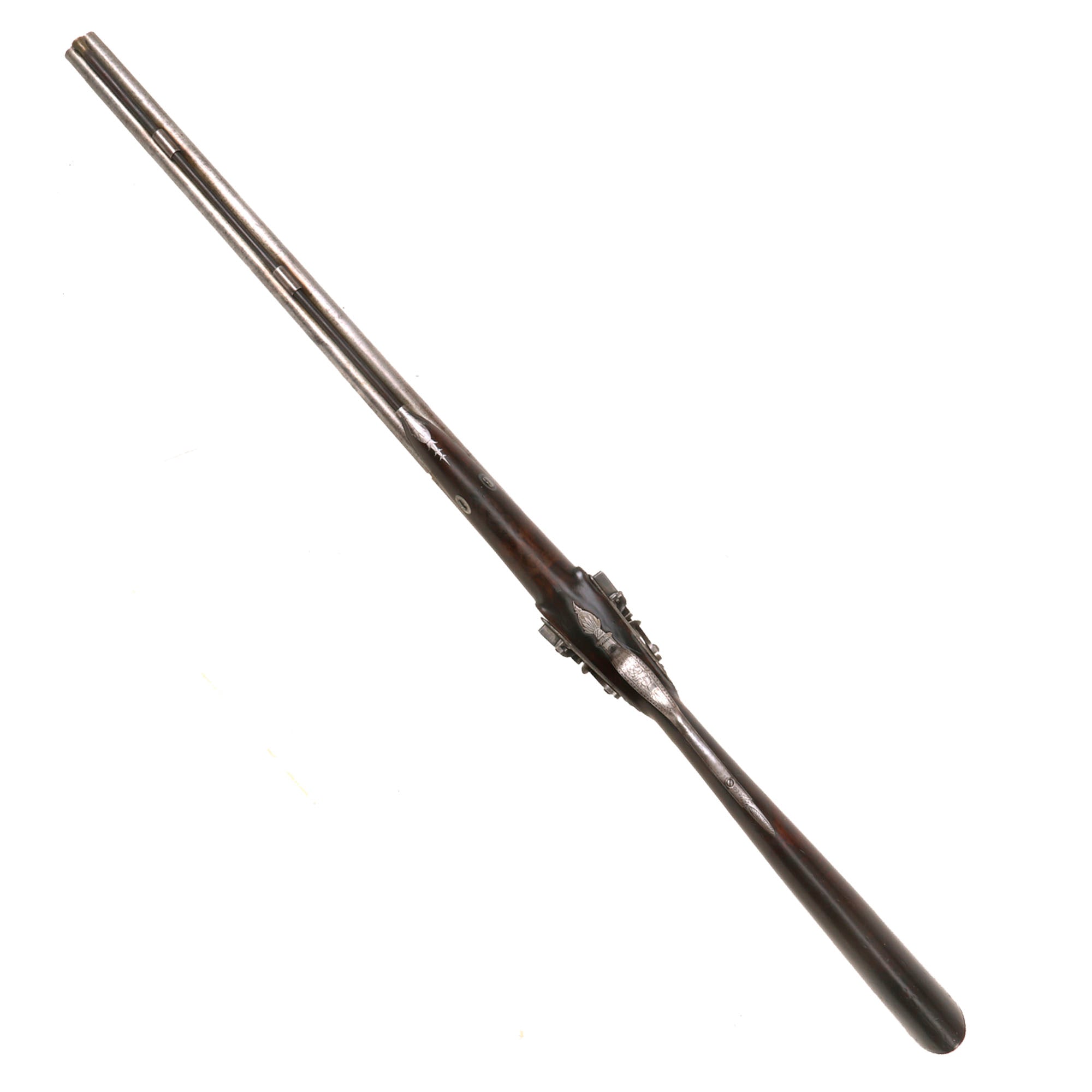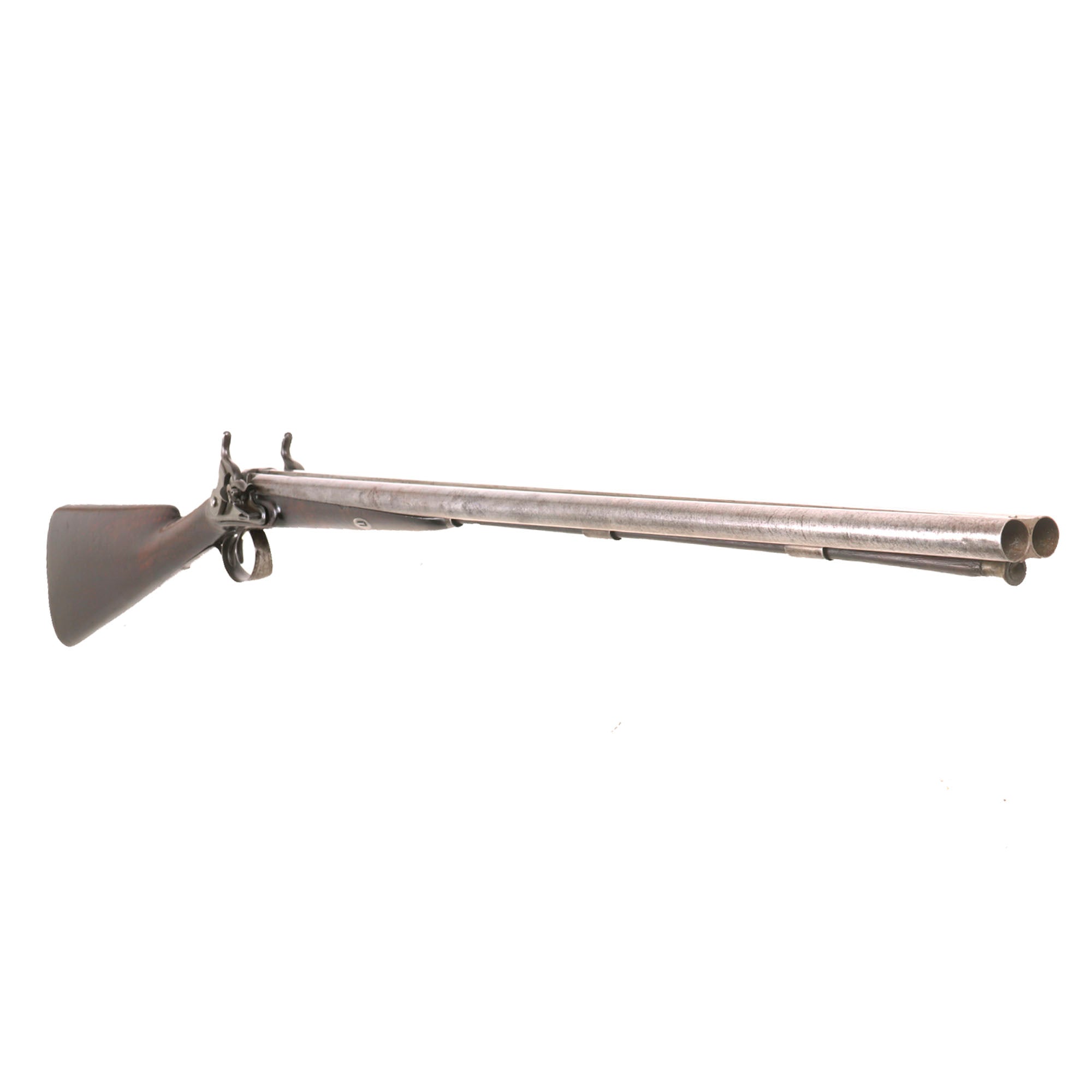 This very interesting DOUBLE BARREL 15 bore Tube Lock Shotgun presents very nicely, with a lovely patina of age. The wrist of the stock is finely checkered for a better grip, though it is definitely worn now. The shotgun's fittings are all of iron except for the nickel silver barrel wedge escutcheons, and the small plaque on the back of the wrist. There is intricate engraving on most of the metalwork, however years of use and cleaning have unfortunately made it faint. Both locks are fully functional, holding at half cock and firing at full. There is a ramrod under the barrel, but it is a working life wood replacement with a brass cap.