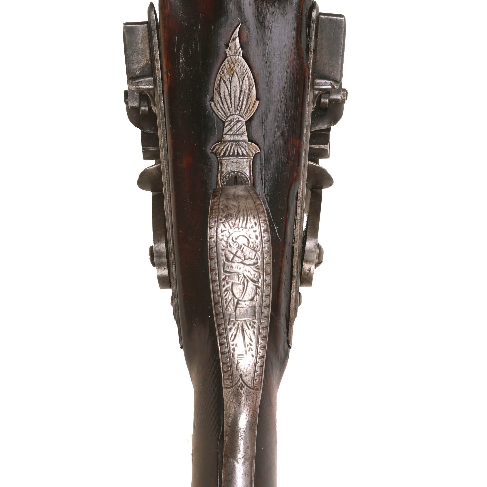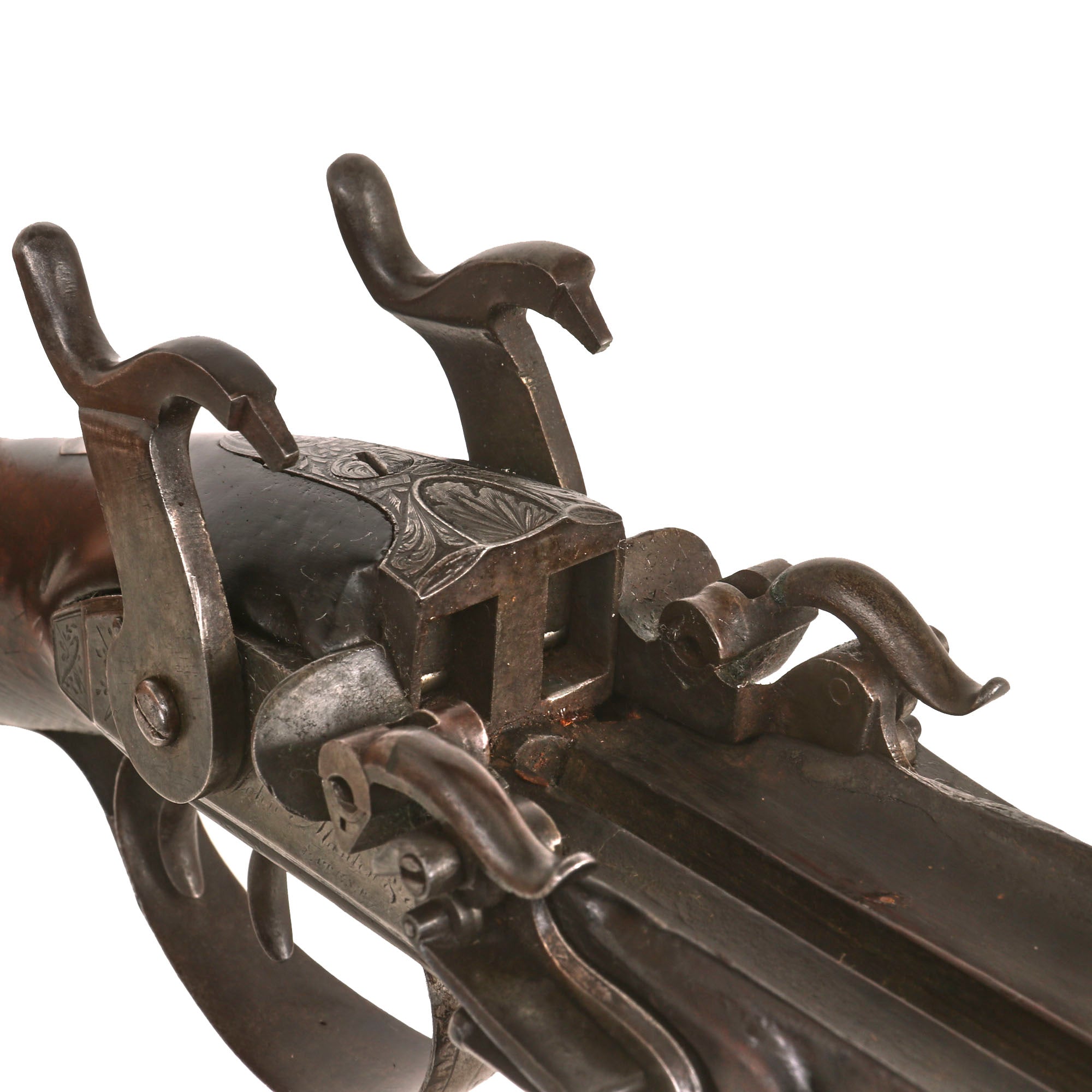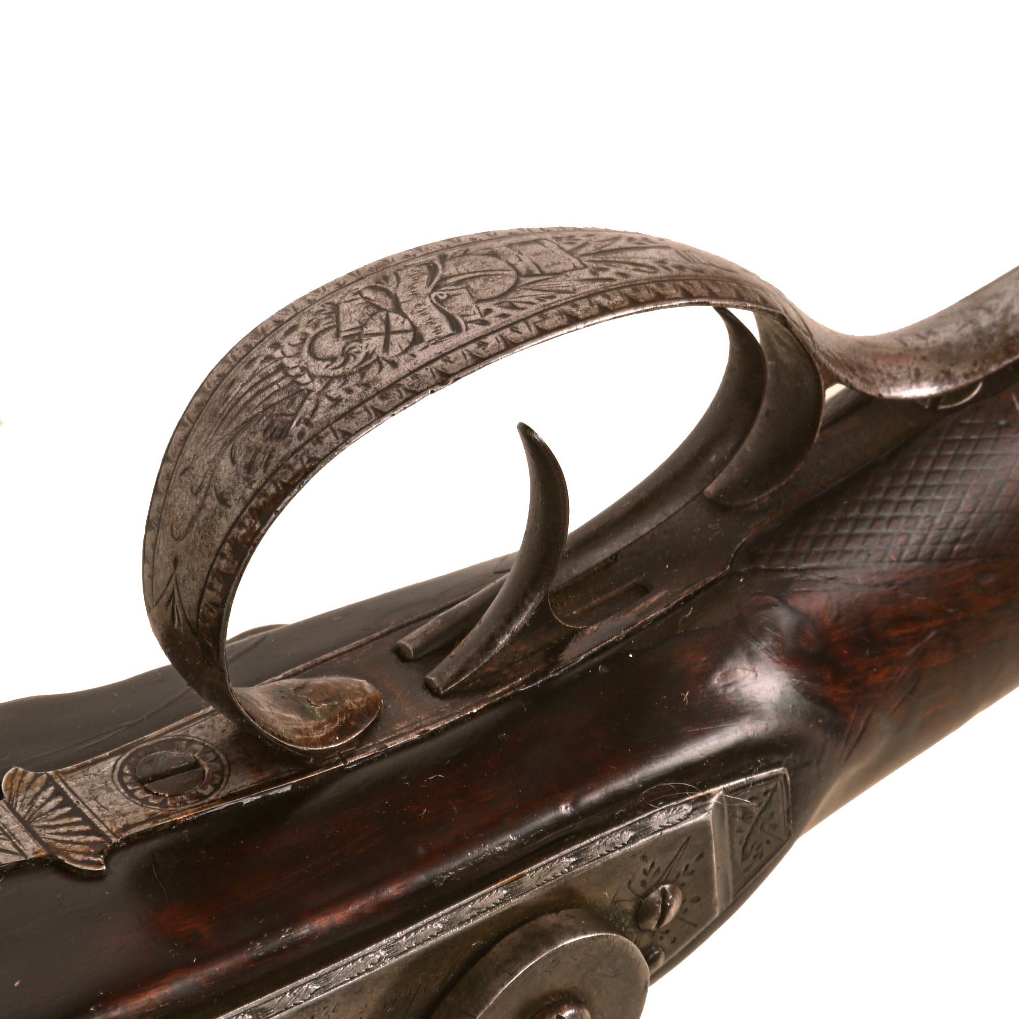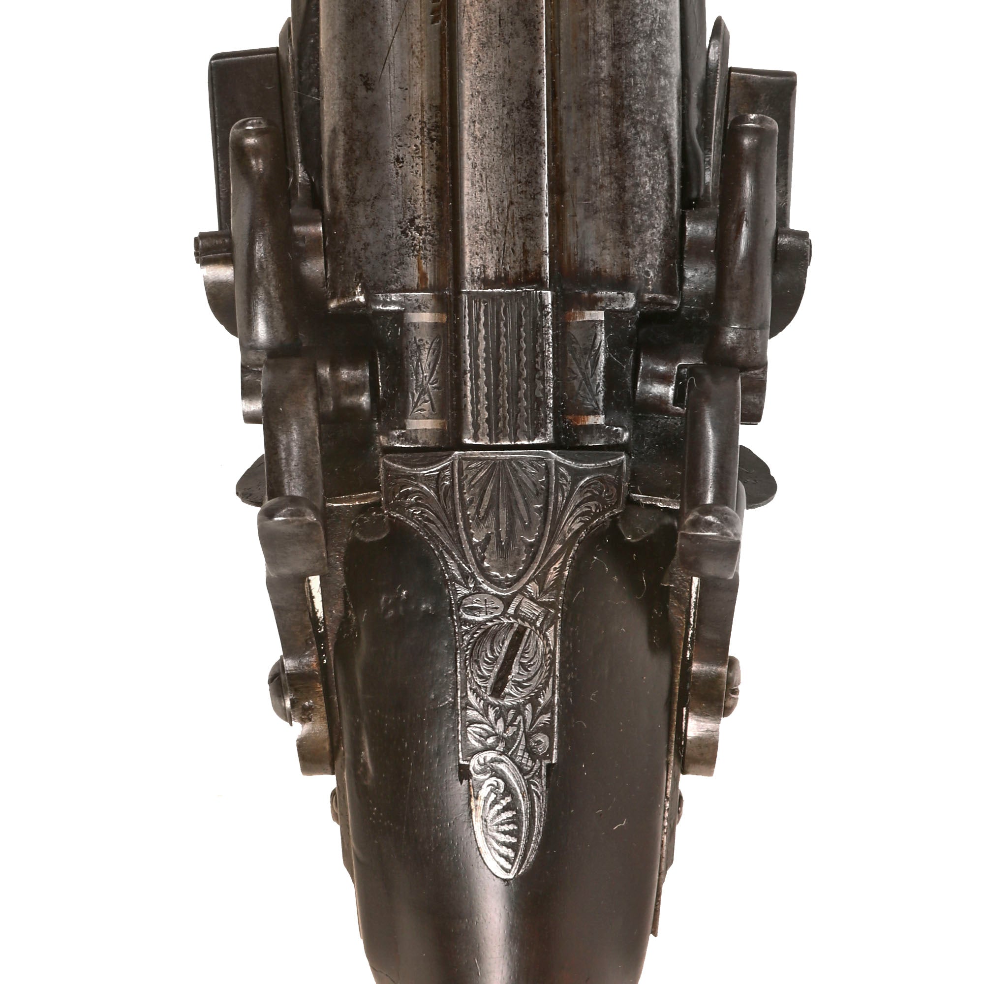 This very interesting DOUBLE BARREL 15 bore Tube Lock Shotgun presents very nicely, with a lovely patina of age. The wrist of the stock is finely checkered for a better grip, though it is definitely worn now. The shotgun's fittings are all of iron except for the nickel silver barrel wedge escutcheons, and the small plaque on the back of the wrist. There is intricate engraving on most of the metalwork, however years of use and cleaning have unfortunately made it faint. Both locks are fully functional, holding at half cock and firing at full. There is a ramrod under the barrel, but it is a working life wood replacement with a brass cap.