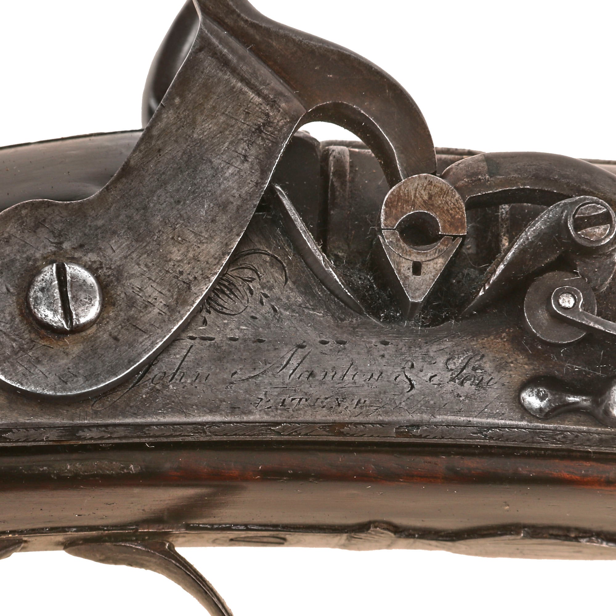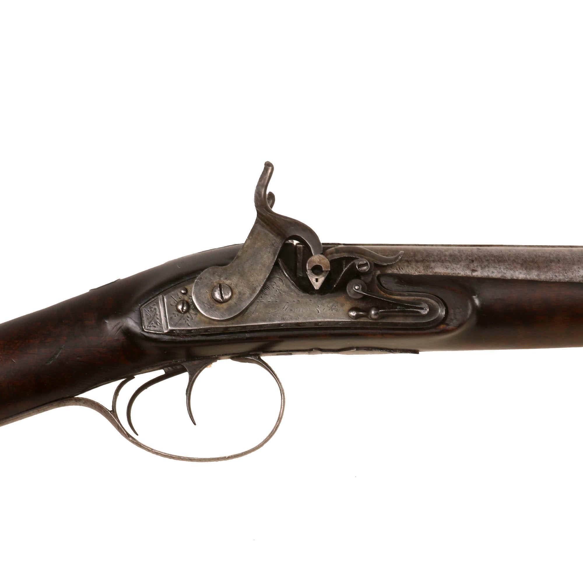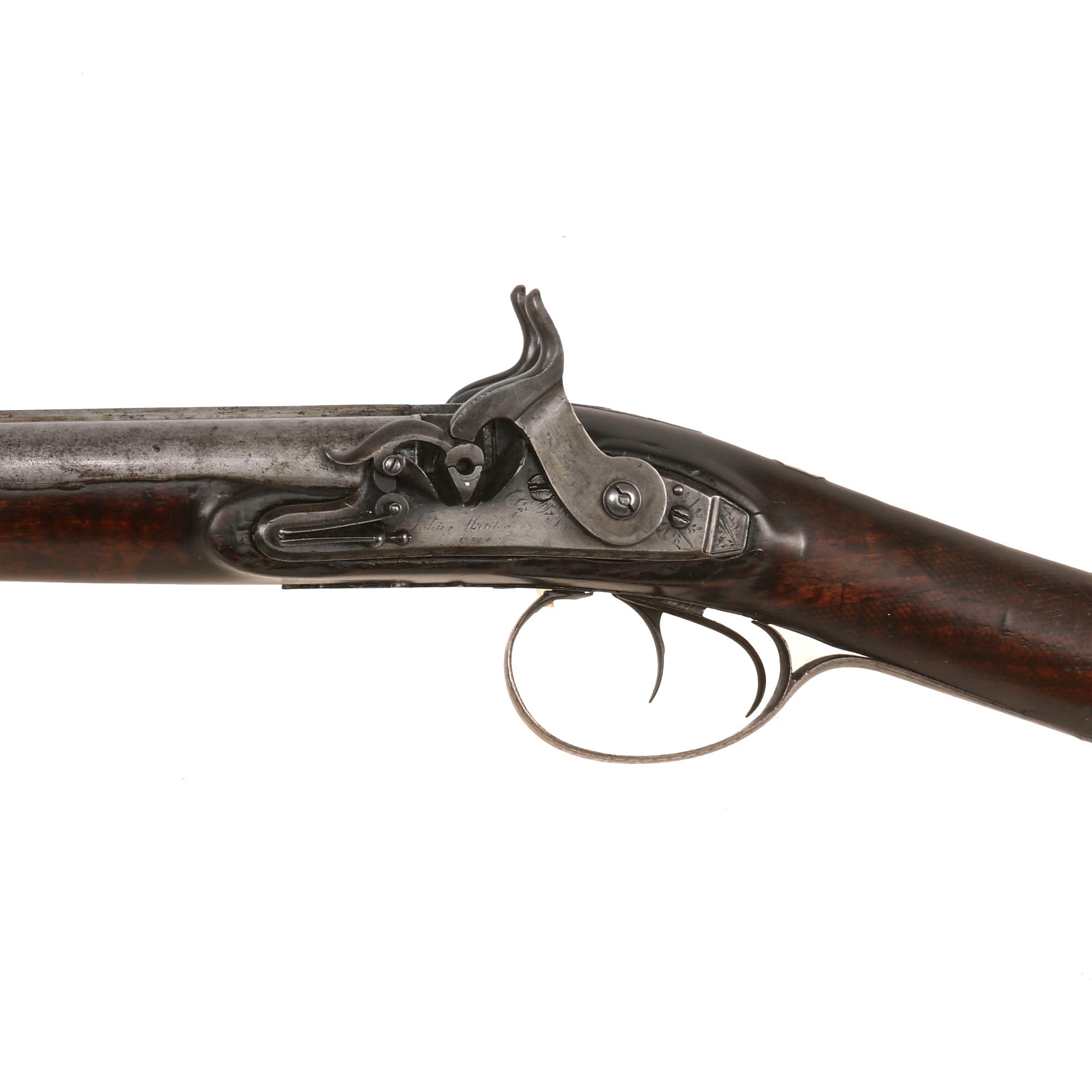 This shotgun definitely looks to originally have had that style of lock, however it was retrofitted during the early-mid 19th century with a "Tube Lock" system, of sorts, where a pellet or small container of primer was struck by the hammer and would then ignite the charge inside the barrel. This was a forerunner of the cap lock system, and only really existed for a short period of time, as the percussion caps and the associated ignition system were fare more reliable as well as easier to manufacture. Of note is that one of the main developers of the "Tube Lock" in England was John's brother Joseph, so it may have been converted by either brother. This would have involved replacement of both the hammer and the frizzen, as well as modification of the flash pan to be compatible with the tube lock primers. Definitely some very interesting aspects to this gun.