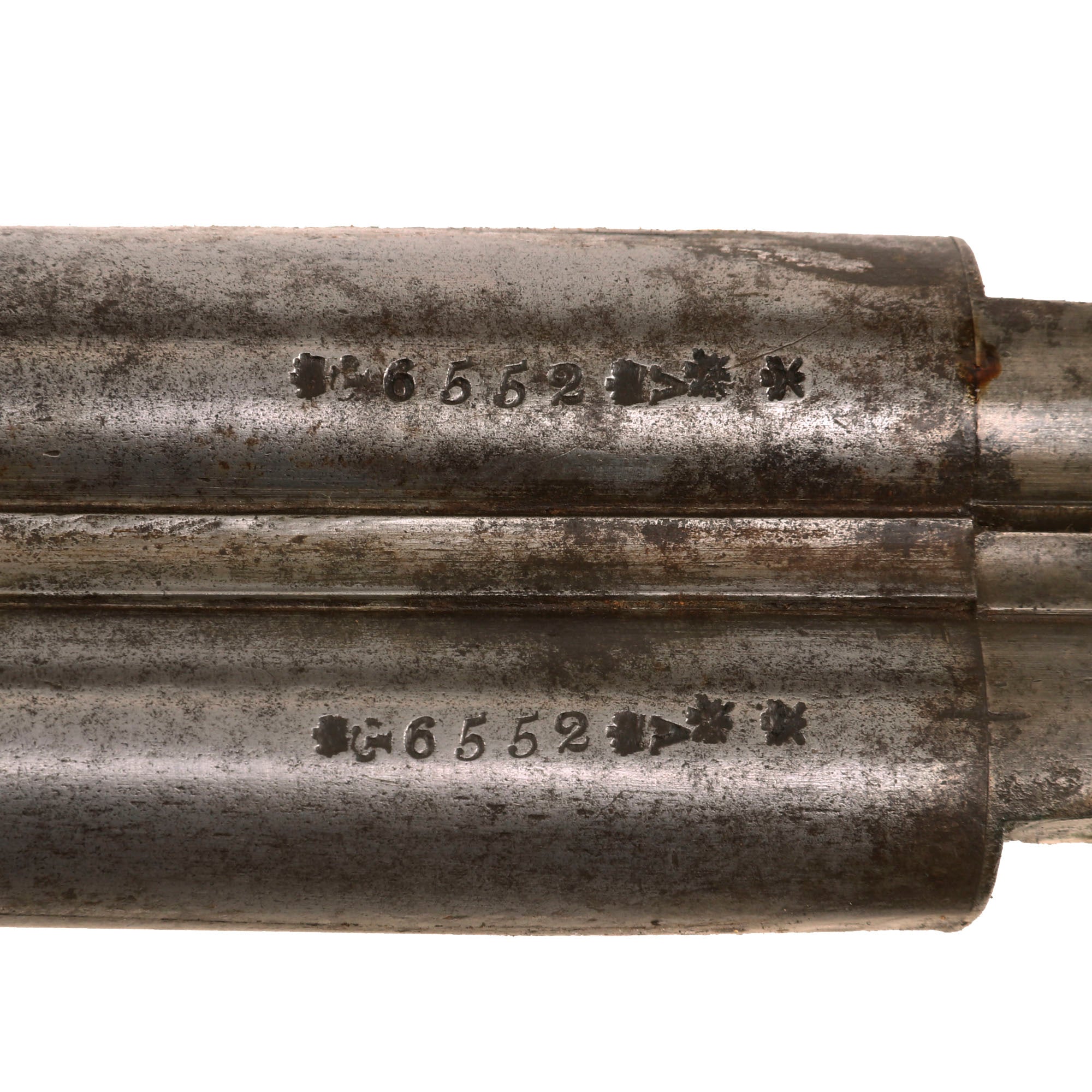 The barrel wedge removes somewhat easily, and bottom of each barrel is marked with serial number 6552, which matches the number stamped on the top of the stock under the barrel assembly. The barrel serial is surrounded by the CROWN / GP "Gunmakers Proof" and CROWN / V "Viewed" markings from the London Gun Company proof house. However, below these are also the CROWN / CROSSED SCEPTERS / BPC "proof" and CROWN / CROSSED SCEPTERS / V "viewed" marks from the Birmingham proof house. We have not really seen a shotgun with barrel markings from both major British proof houses before. There is also not any bore size marking, but with the muzzle being about .68", we assume these are 16 gauge, and not