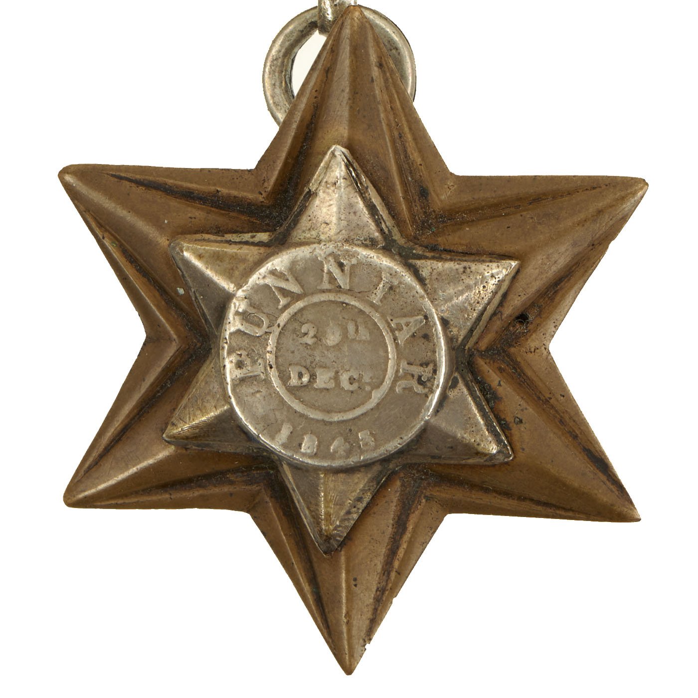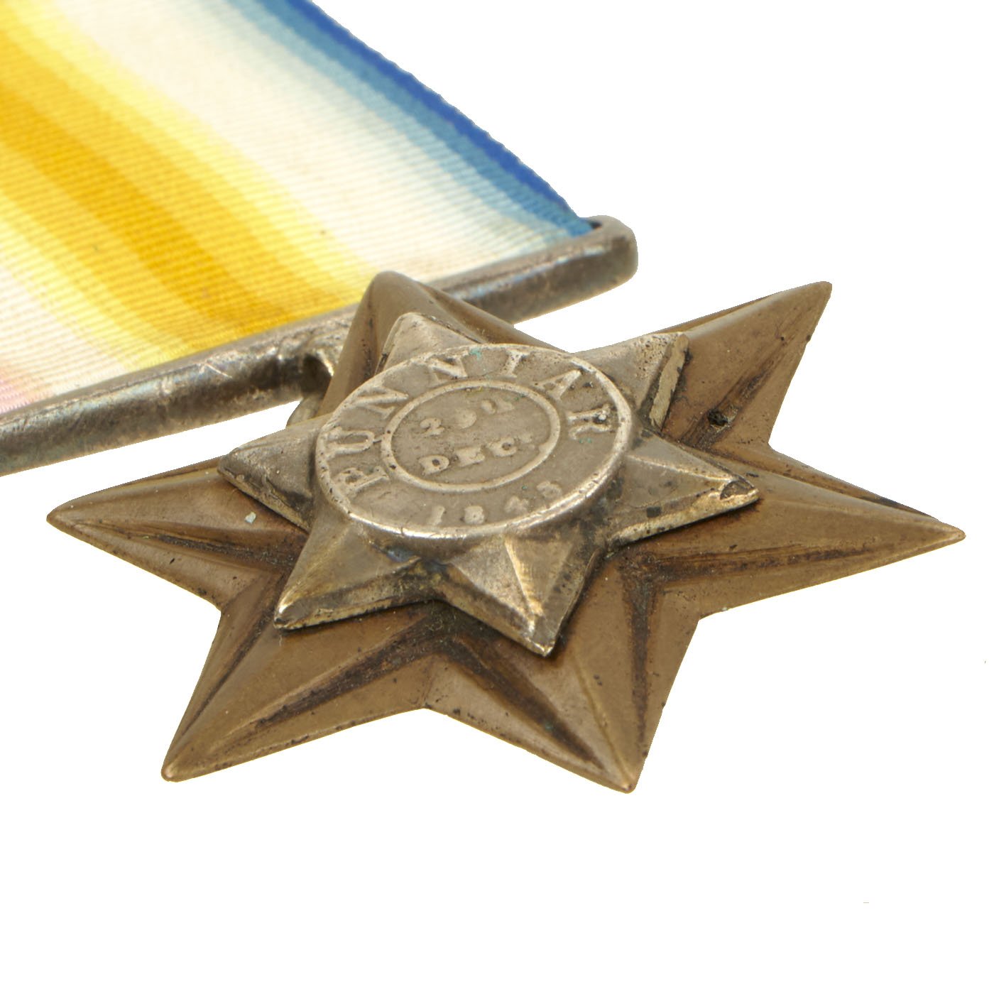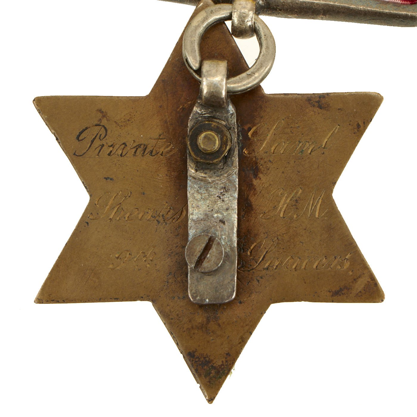 This is a very nice Gwalior campaign star, awarded during the action. The six-pointed, bronze Gwalior Campaign Star has the PUNNIAR / 19th DEC / 1843 silver inset. Reverse of the brass planchet is engraved in flowing script, Private Saml Shears H.M. 9th Lancers. Two squadrons of the 9th Lancers were present at the battle of Punniar on 29 December 1843. The original brass hook on the reverse has been replaced with a steel strap affixed with a two cut screws.