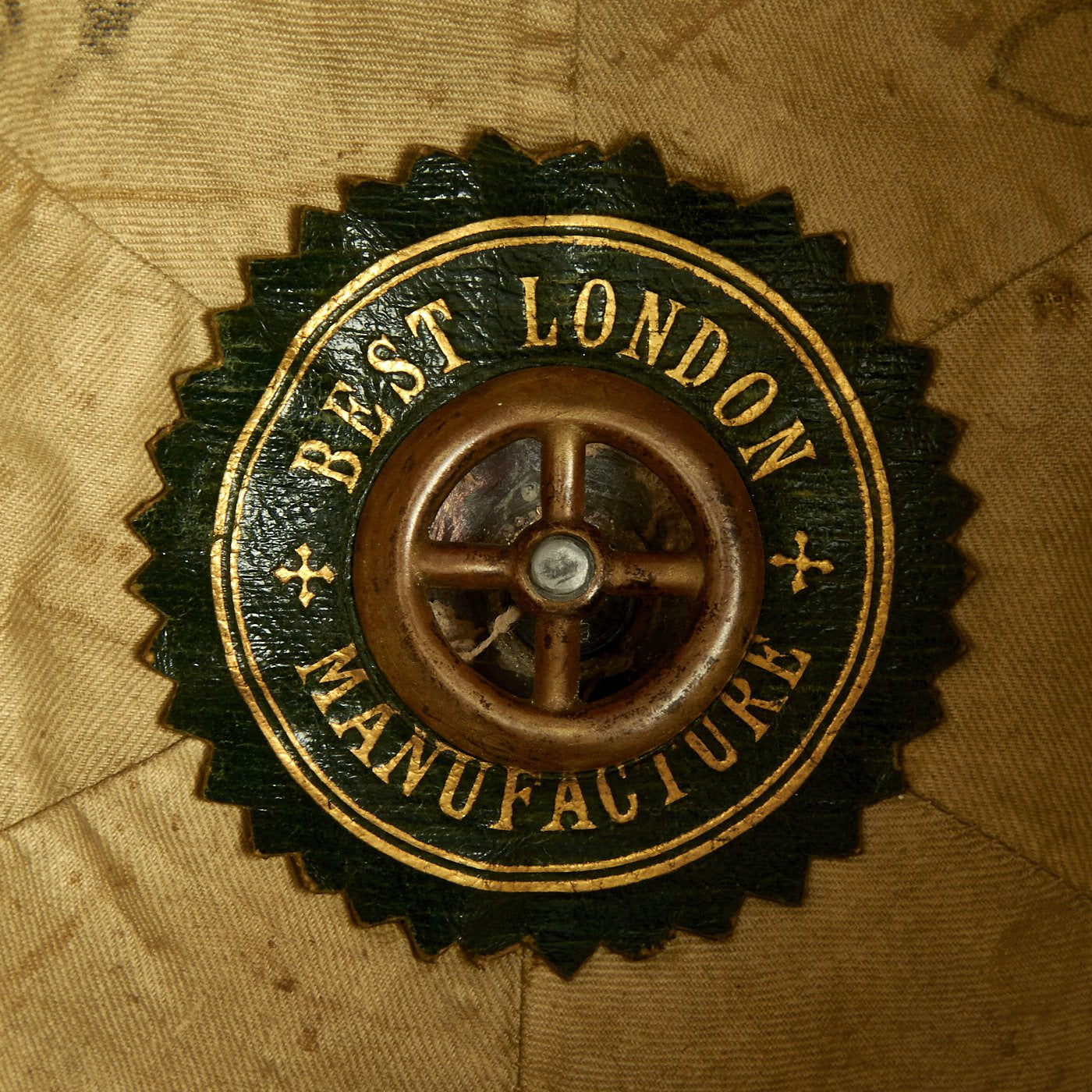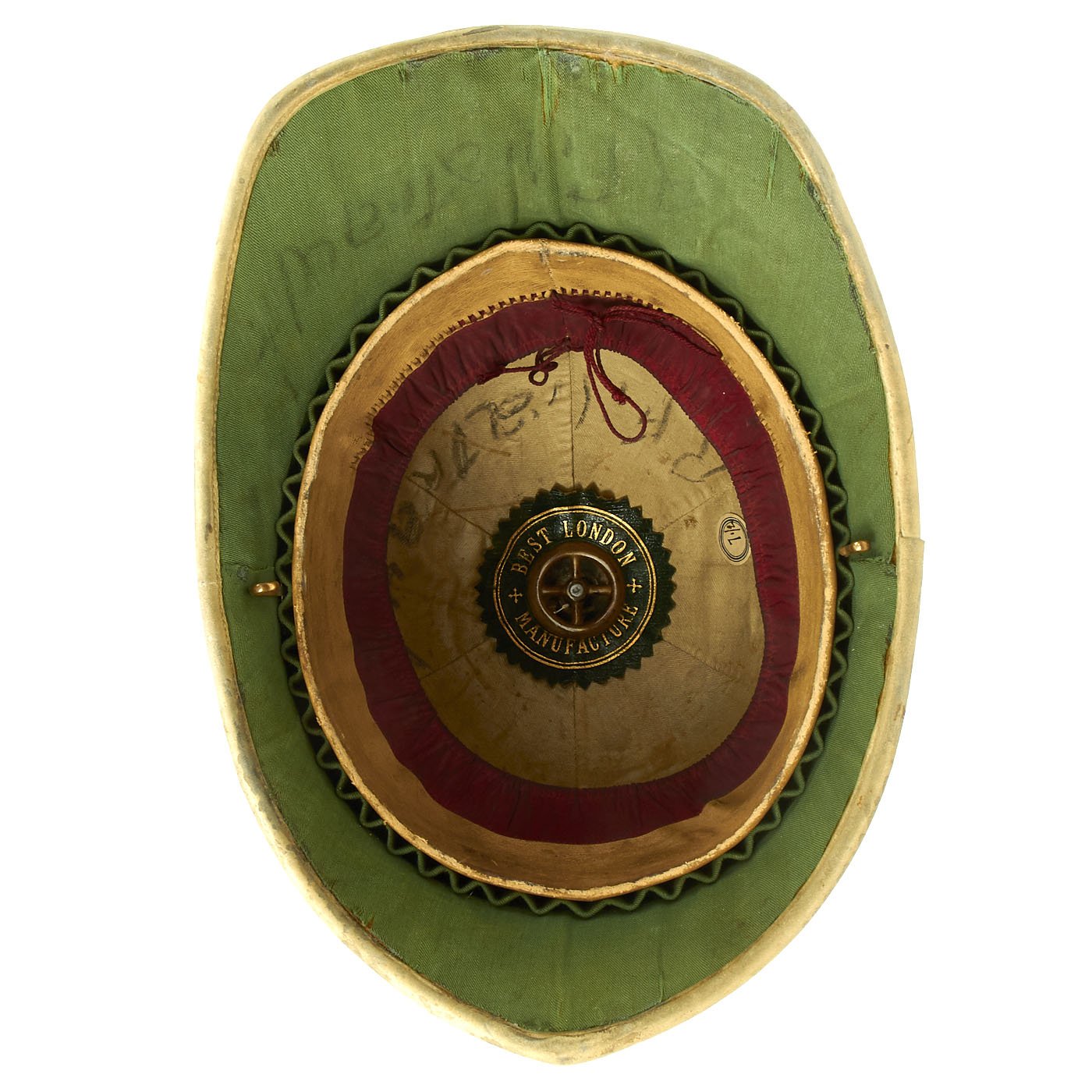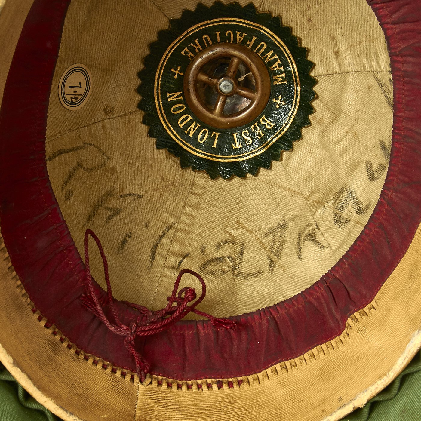 This example offered in very good condition would have been issued to enlisted soldiers. It does not have a puggaree, however it has a sweatband topped with a cloth cap, usually only seen on higher end models. The top around the vent is marked BEST LONDON MANUFACTURE, though there is unfortunately no maker marked. There is also a small size tag marked 7 1/2.