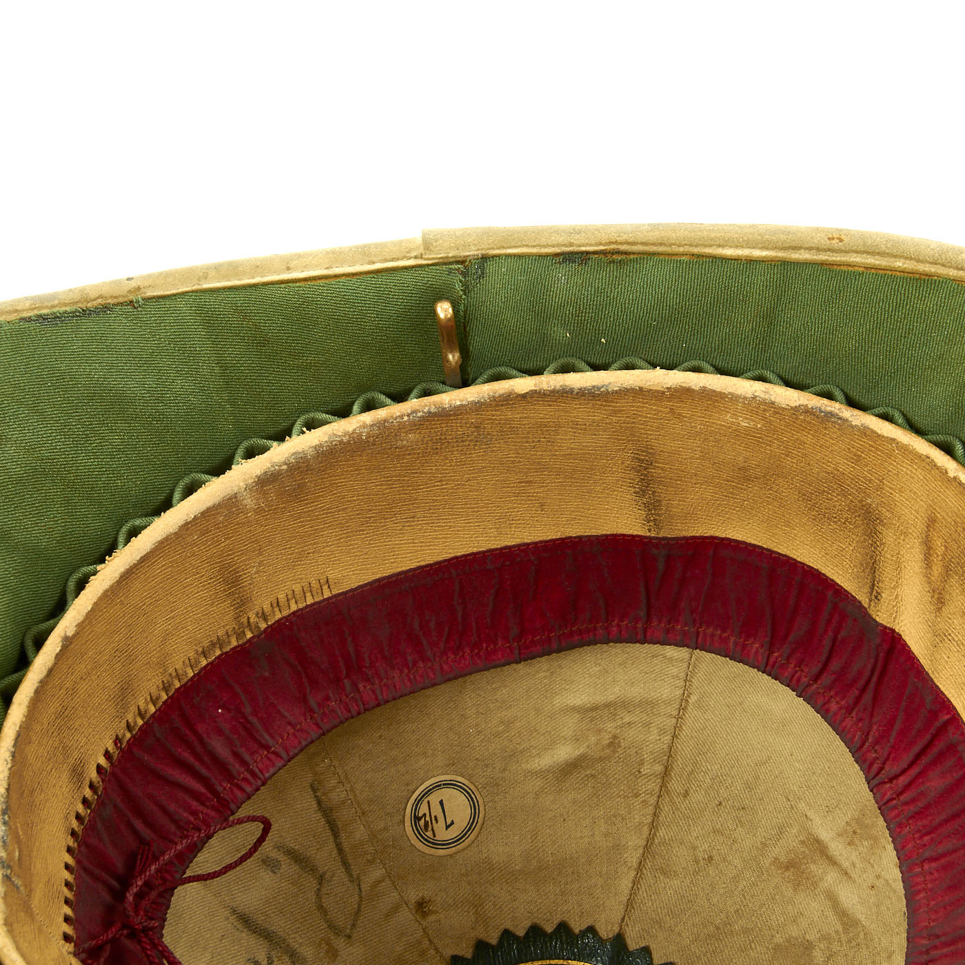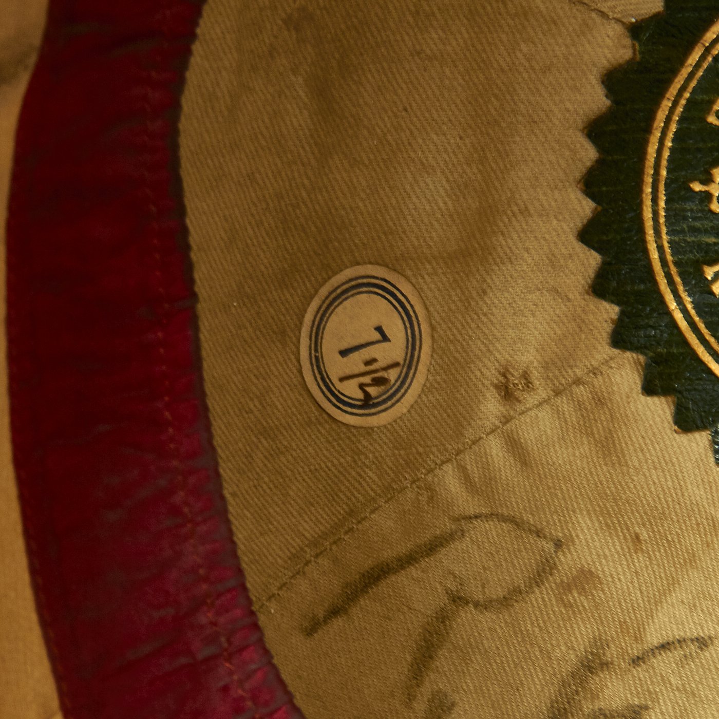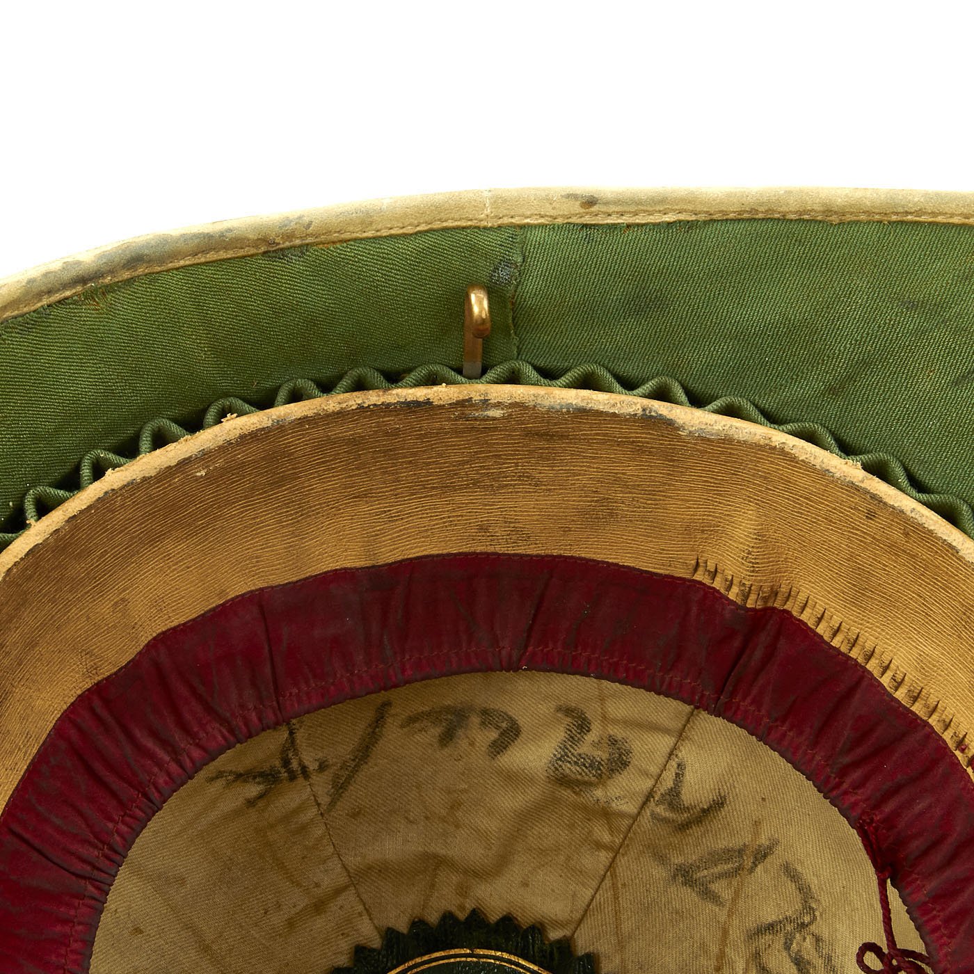 This example offered in very good condition would have been issued to enlisted soldiers. It does not have a puggaree, however it has a sweatband topped with a cloth cap, usually only seen on higher end models. The top around the vent is marked BEST LONDON MANUFACTURE, though there is unfortunately no maker marked. There is also a small size tag marked 7 1/2.
