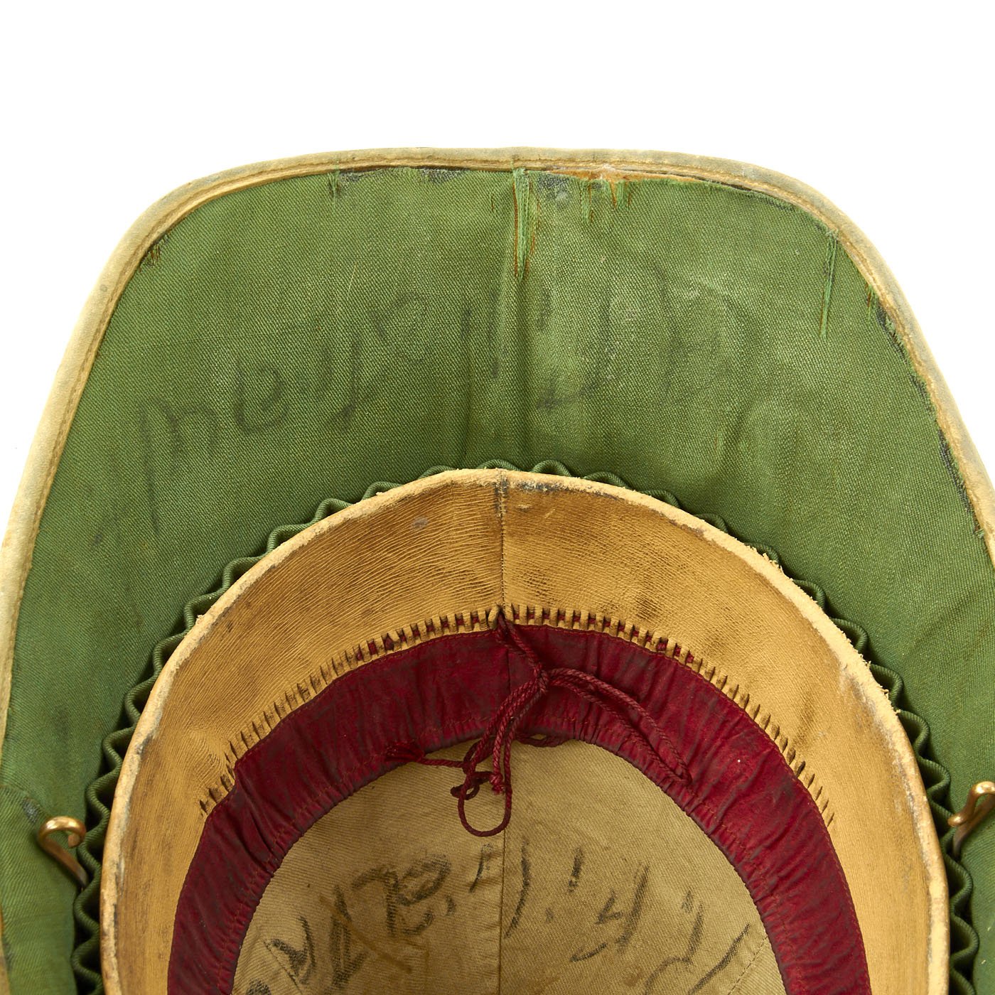 The word “khaki” is Persian for “dust.” While serving in India, it was common for officers to attempt to break up the white color of helmets, as well as other white garments with the use of mud, tea, coffee, tobacco juice and curry powder. The results varied greatly, and by 1884 a patented dyestuff produced a fast “khaki” dye. It wasn’t until the second Afghan War in 1885 that a full khaki uniform replaced the red uniforms and white helmets. But because the helmet was often a private purchase item, many continued to be produced in white. Many officers purchased a white helmet and relied on a khaki cover, rather than having to purchase both a white and a khaki helmet. For this reason, it isn’t uncommon to find Foreign Service Helmets from much later than 1885 that are white in appearance.