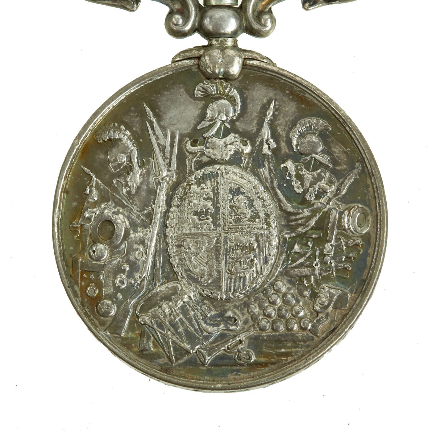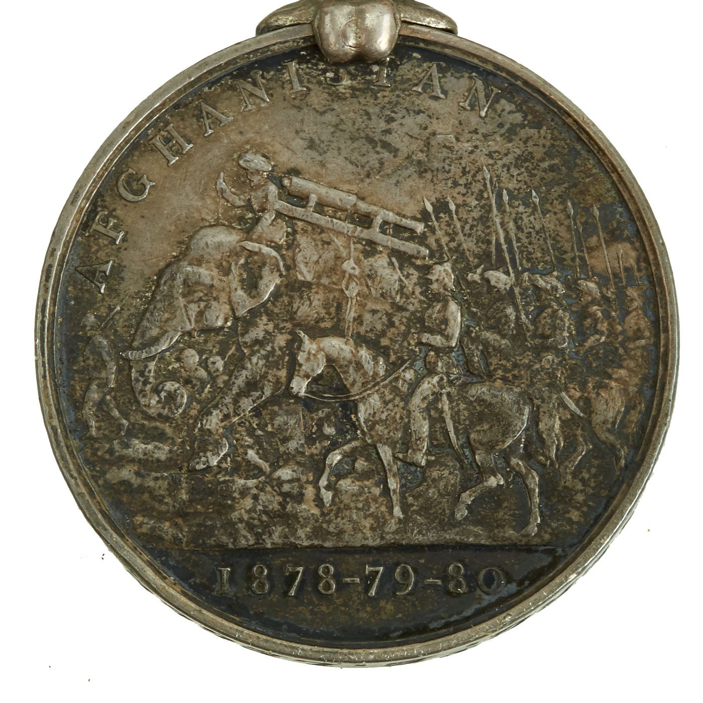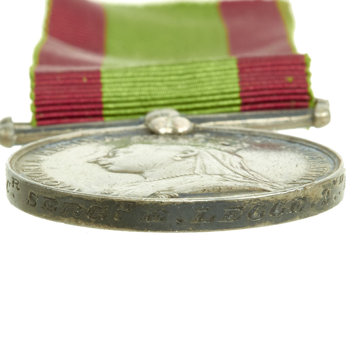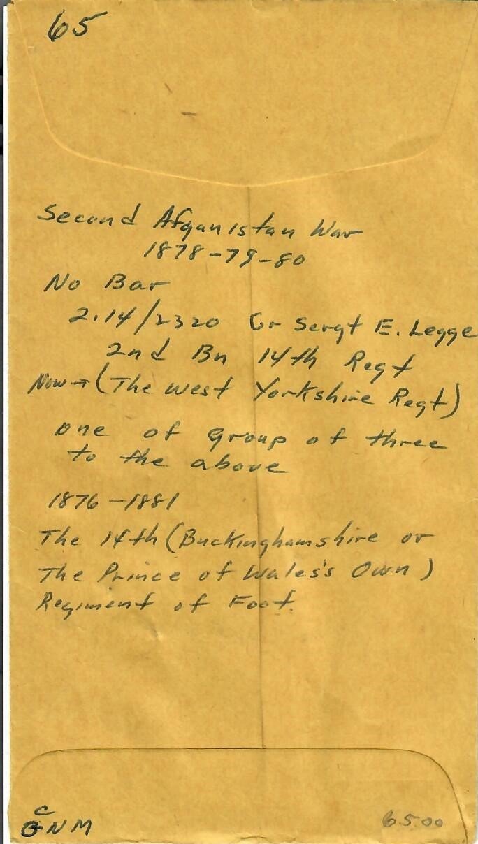 - British Army Afghanistan 1878-1880 Campaign Medal, as awarded to Sergeant E. Legge, who served in the 2/14th Regiment of Foot during the campaign. Features a 36mm wide circular silver medal with swivel ribbon suspension bar; the face with the veiled crowned head and shoulders of Queen Victoria facing left, circumscribed ‘VICTORIA REGINA ET IMPERATRIX (Victoria Queen and Empress); the reverse with a column on the march in a mountainous landscape, an elephant bearing a cannon to the fore, circumscribed above ‘AFGHANISTAN’ and dated ‘1878-79-80’ below; correct chiseled named 2.14/2320 CR. SERG E. LEGGE 2nd BN 14TH REG. Includes ribbon. Naming officially impressed, near extremely fine.