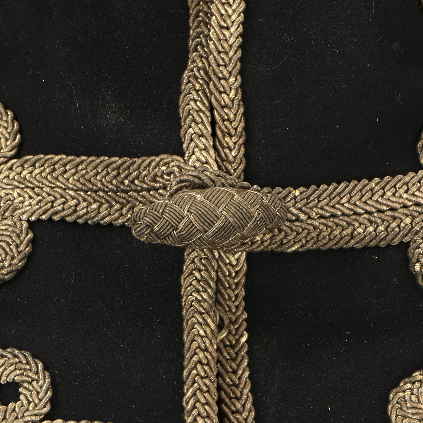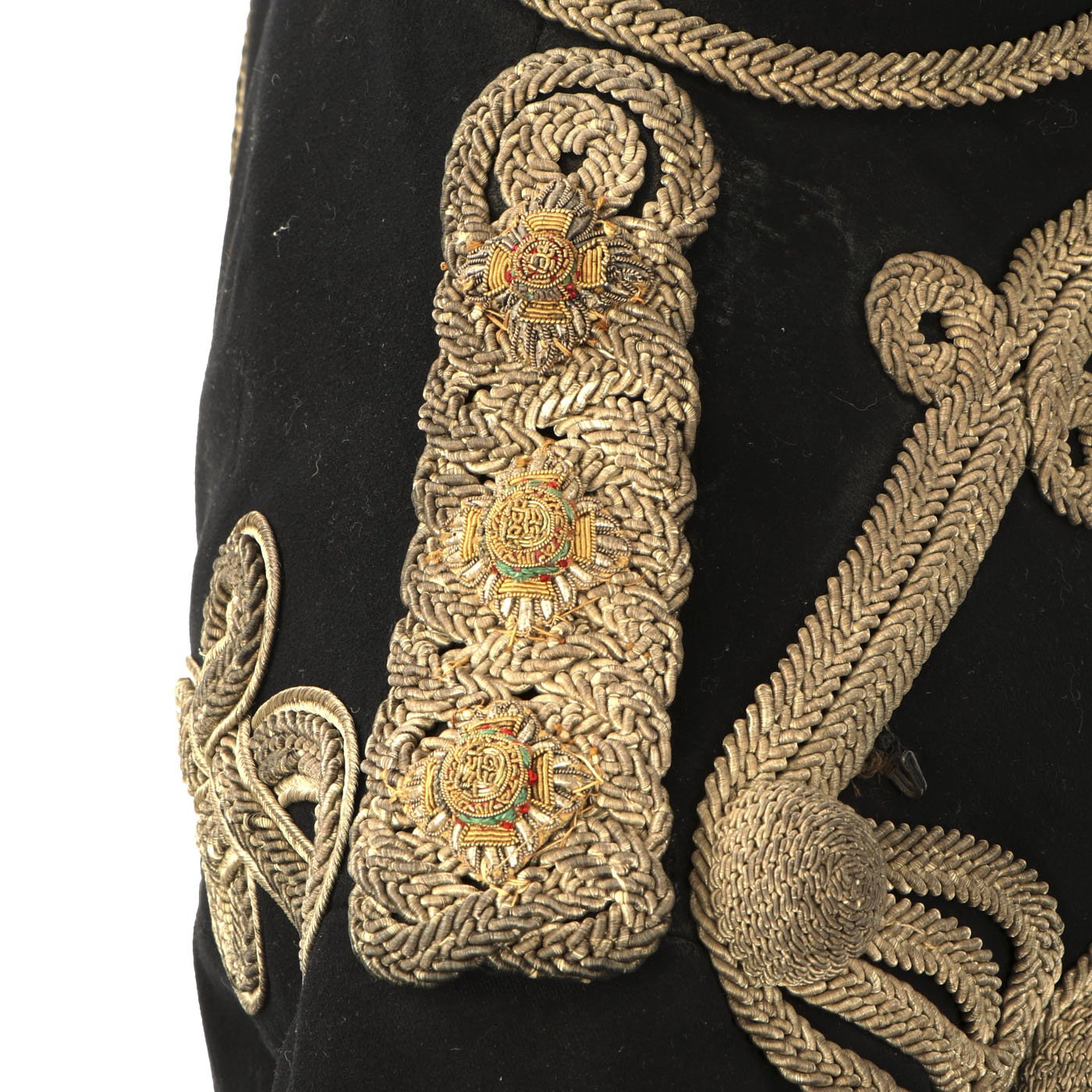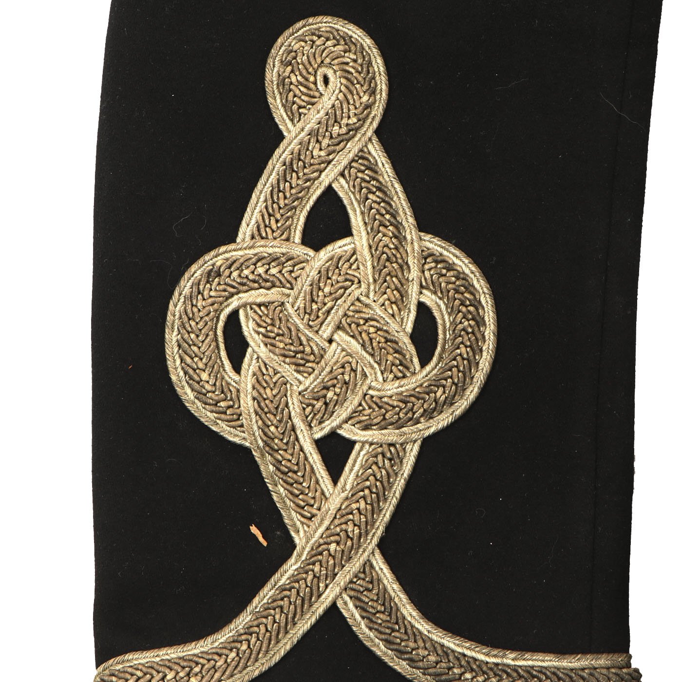 The 1883 regulations state that the tunic was of blue cloth, edged all round including the bottom of the collar with gold chain gimp. Across the breast were six loops of the same gold lace with caps and drops on each side and fastening with gold worked olivets. On the back seams a double line of lace forming a crow’s foot at each shoulder and an Austrian knot at the bottom of the skirt. The lace was traced all round with a thin line of lace. A netted cap upon the lace on each side of the waist. The shoulder-straps were of plaited gold chain gimp lined with blue and bore the rank badges in silver.