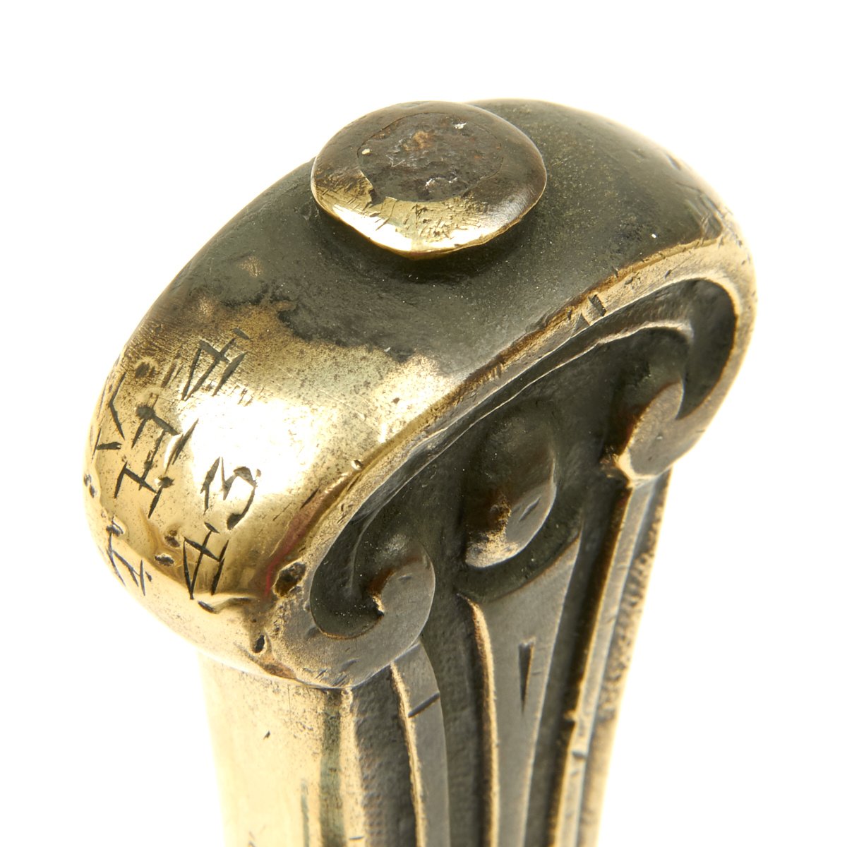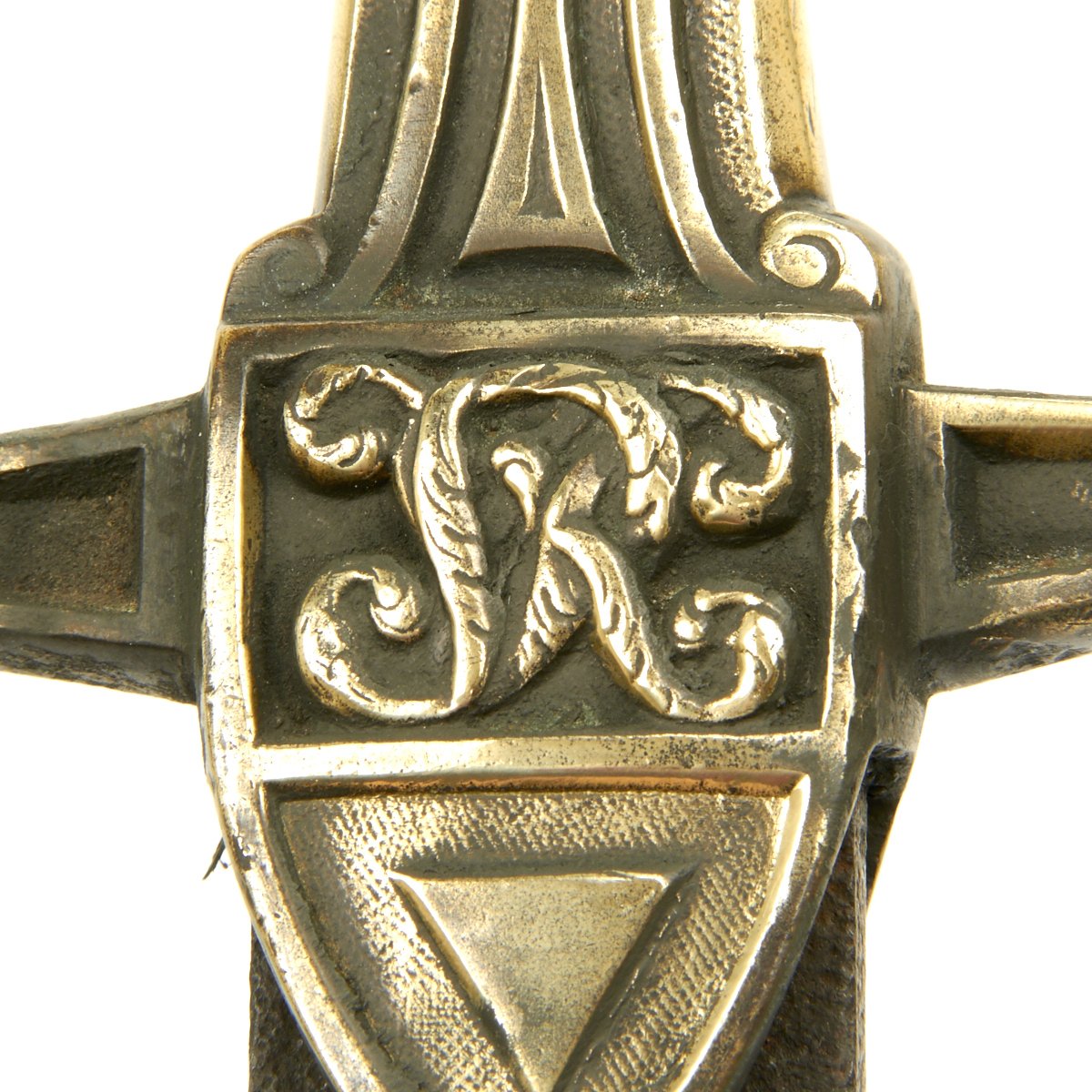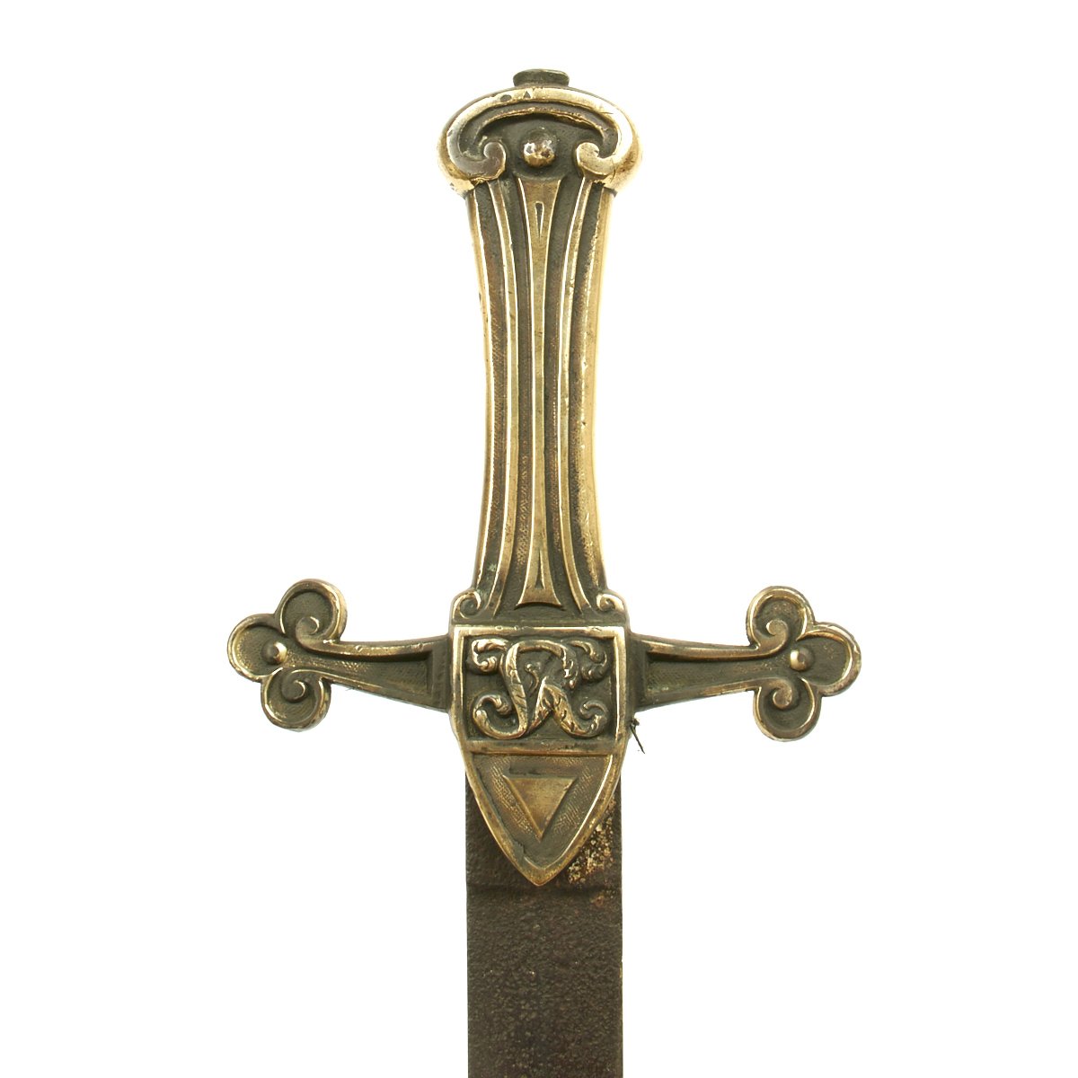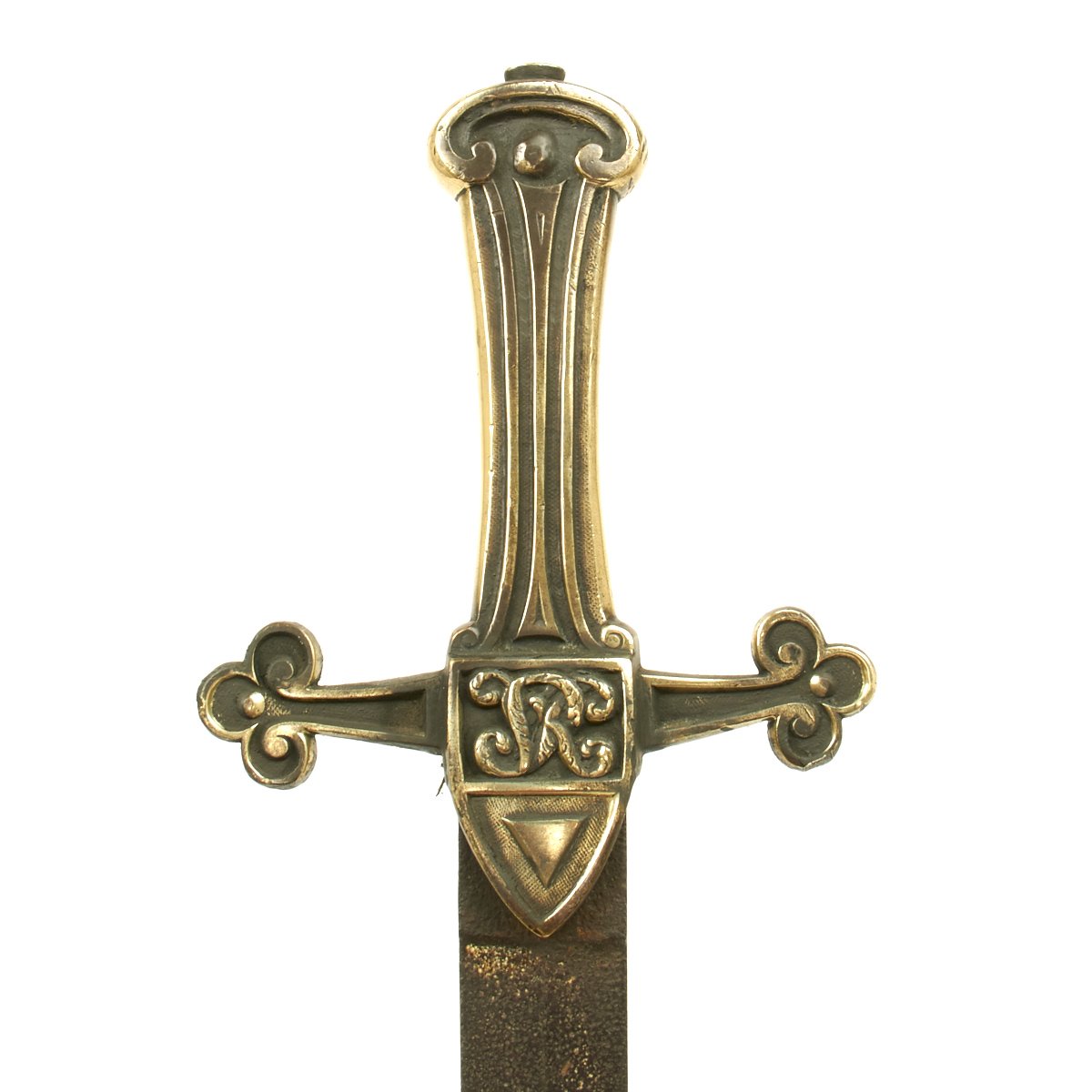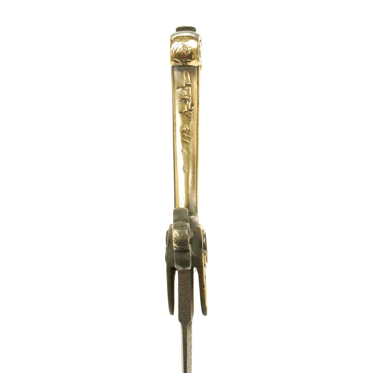 Here is a typical VICTORIAN era Drummer's sword with brass hilt and crossguard with a molded "V.R." right in the cross guard on both sides. It has a double edged blade measuring 19", the overall length being 25". Found in a barn the blade is as found and uncleaned. The brass hilt has been polished and this exposed a Regimental marking down one side of the grip: