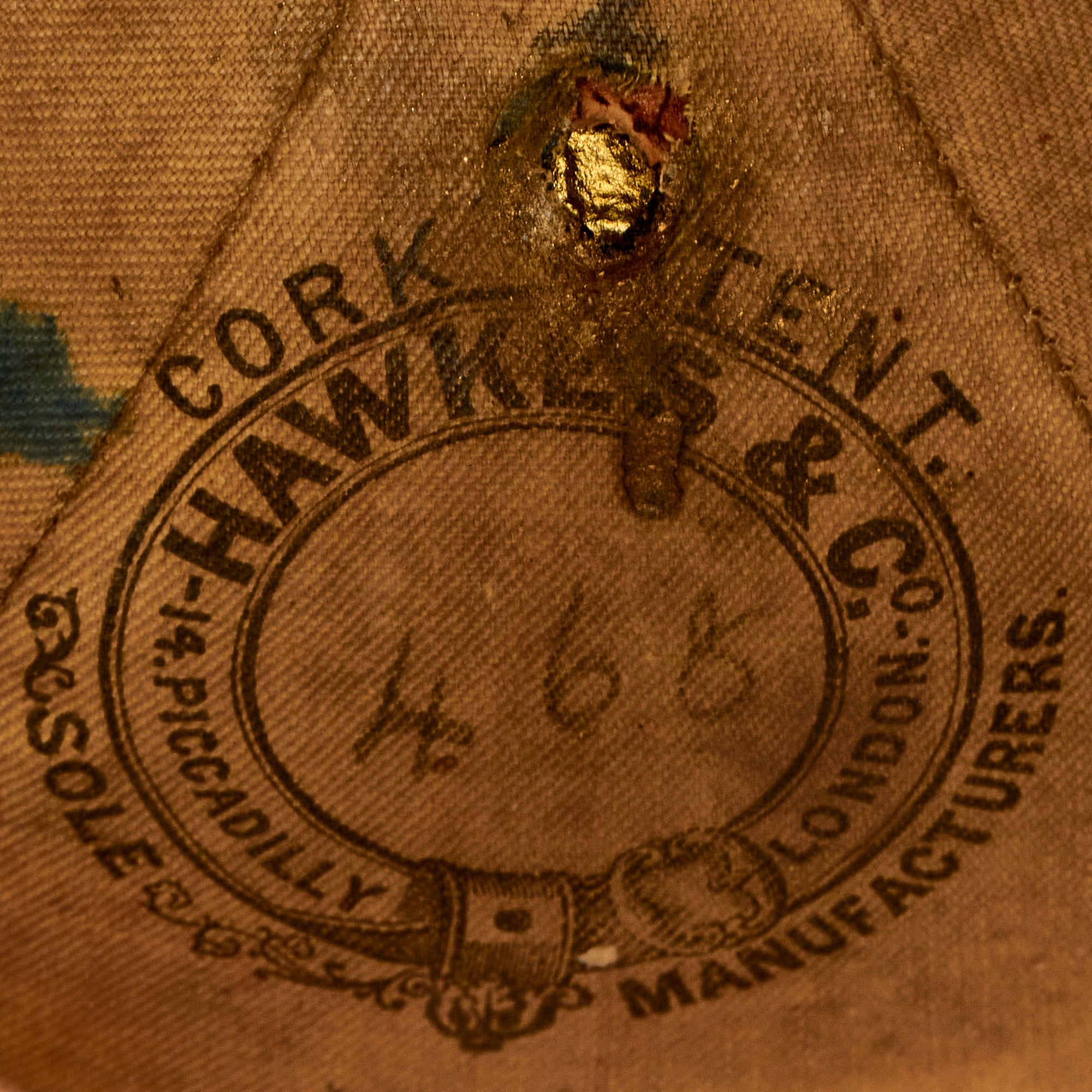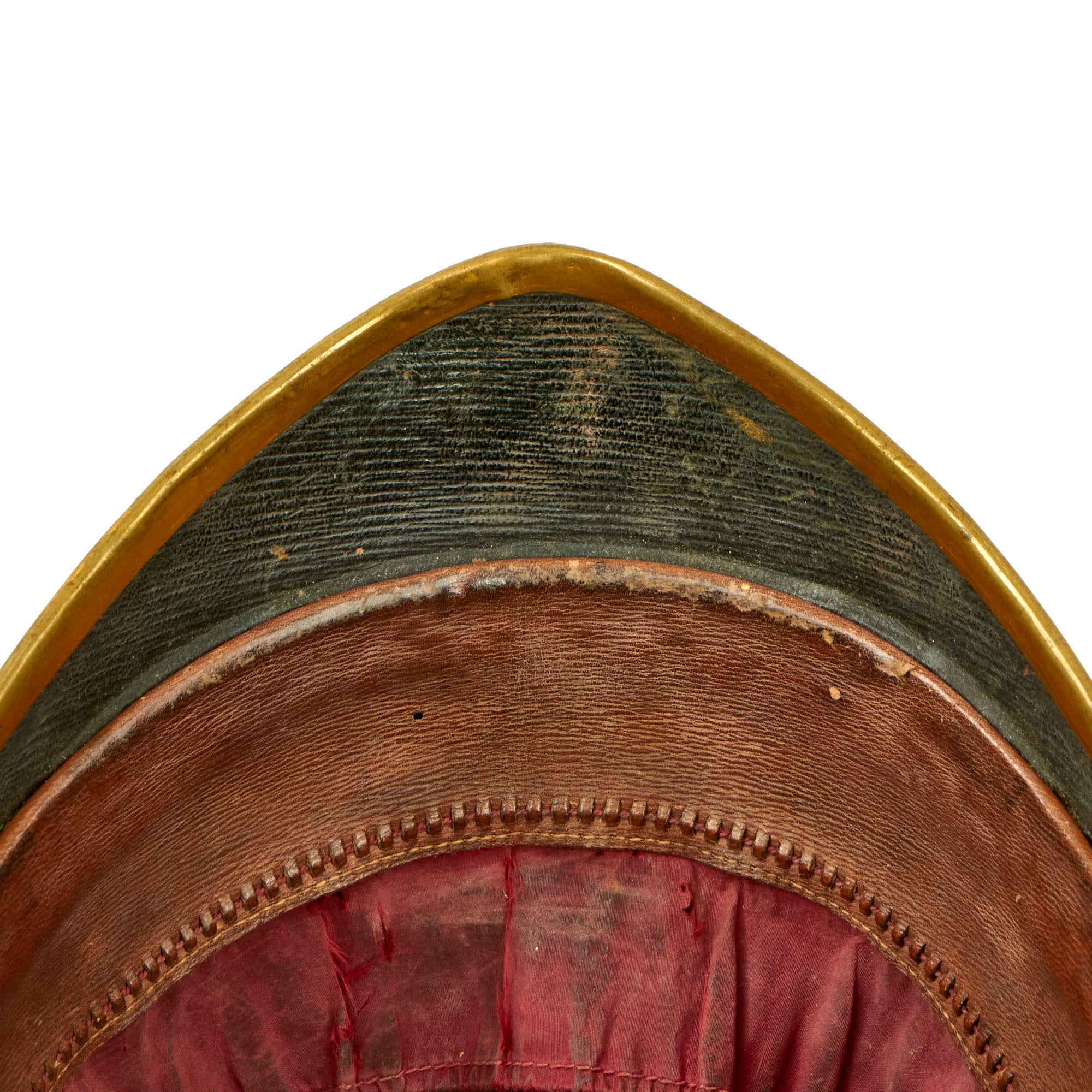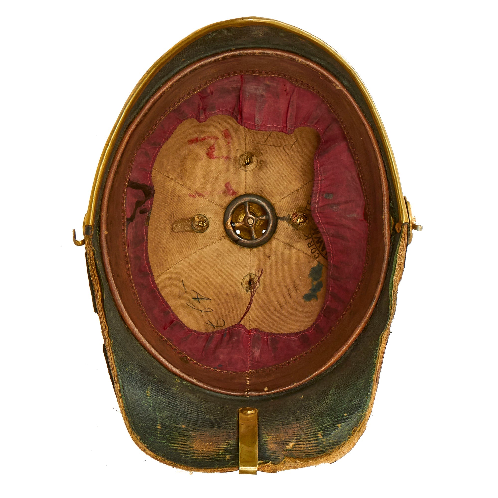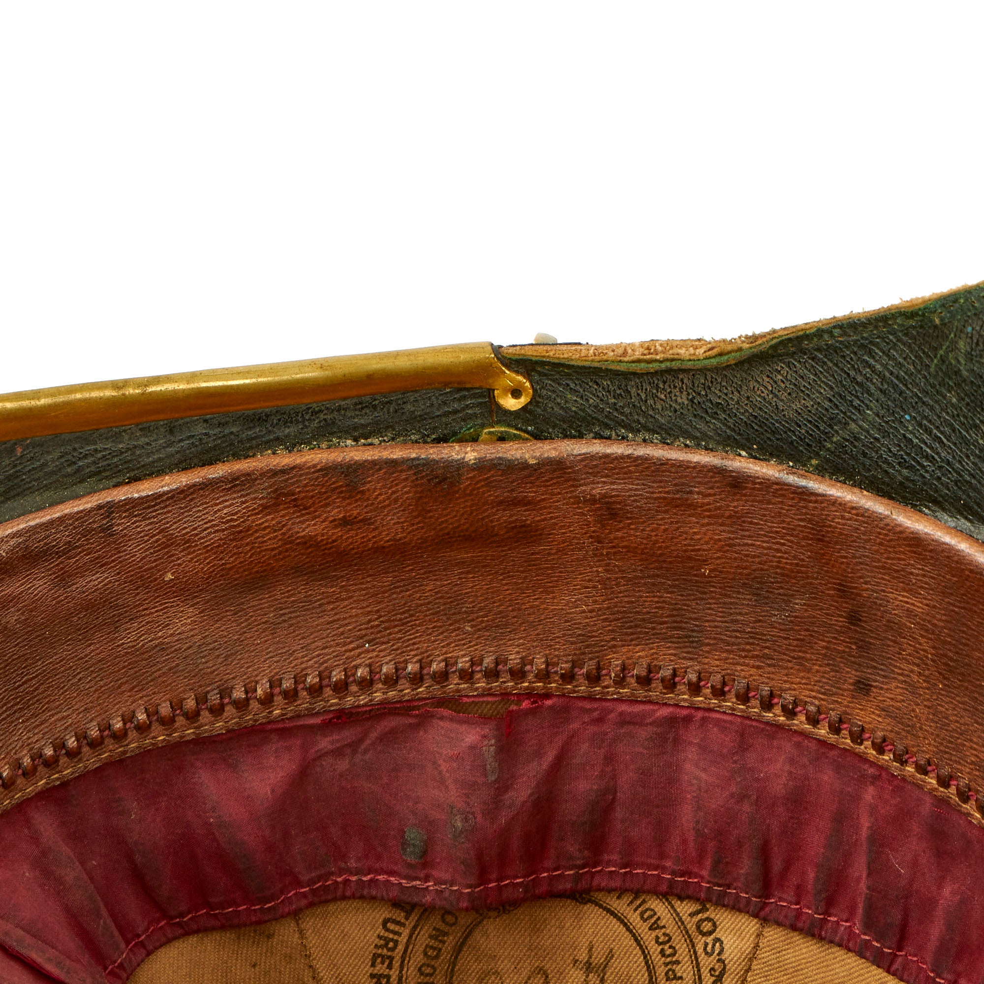 The front of the helmet has the correct artillery plate, which is the version omitting the artillery piece from the design. Body consists of cork covered with blue wool, trimmed with brass, but the rear skirt trim is missing. Liner is calfskin leather and silk. Interior of the front and rear visor is trimmed with fine green dyed leather with little color retained, and the interior body liner with canvas. The interior has a maker’s mark for HAWKES AND CO of Piccadilly. HAWKES & Co. founded in 1771 by Thomas Hawkes in Brewer Street, London, moved to 14 Piccadilly in 1794 and again to it's present location at 1 Saville Row in 1912. Today the Company is known as GIEVES & HAWKES and is still one of London's most renowned tailors.