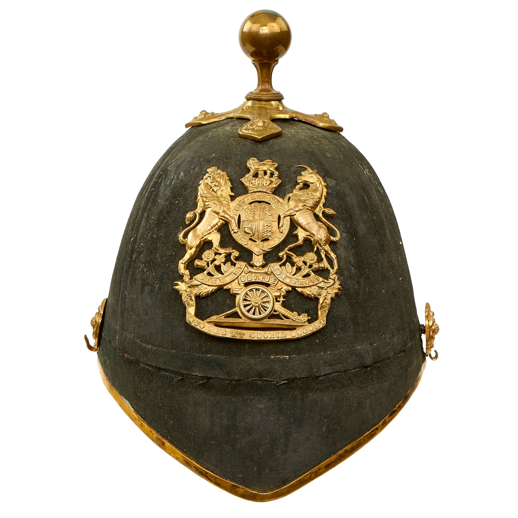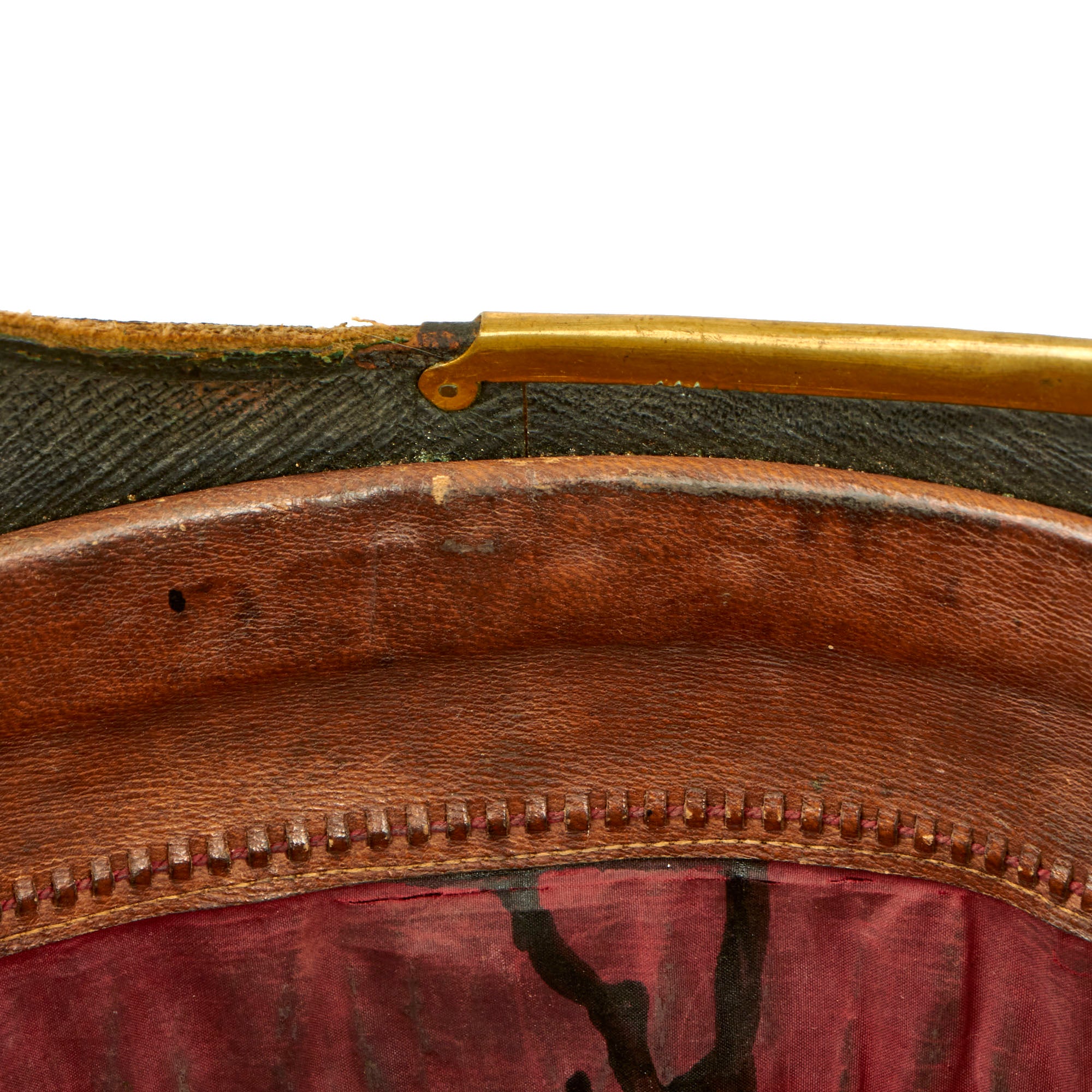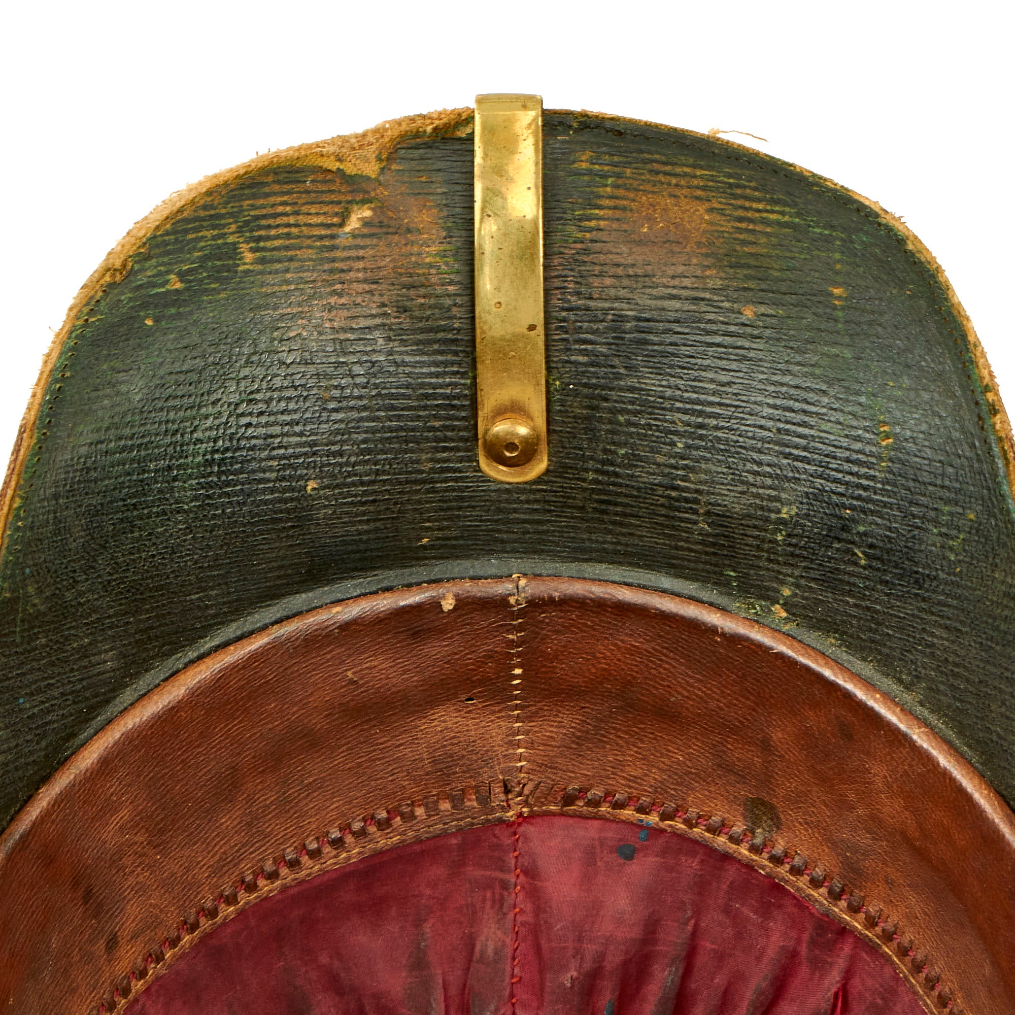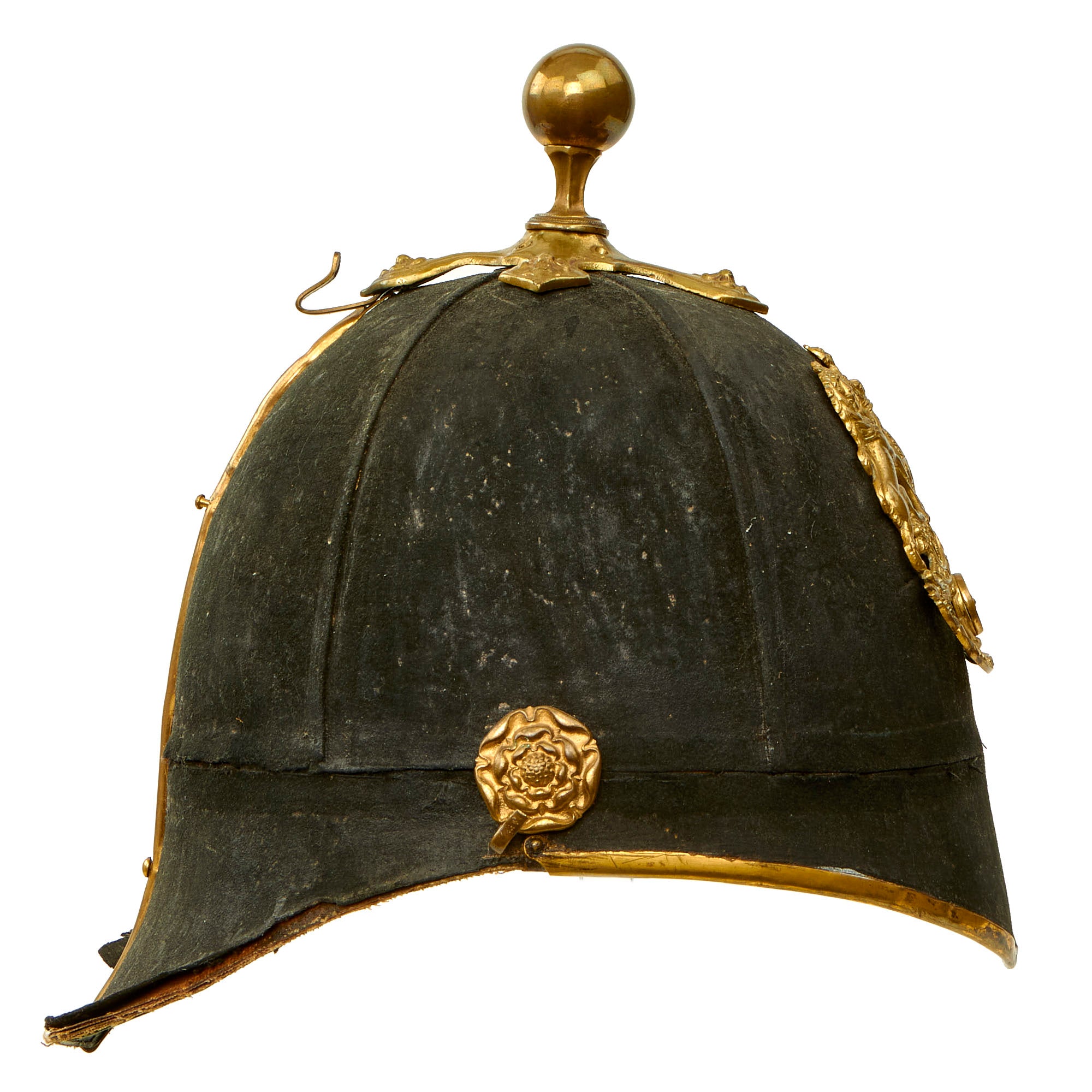 The front of the helmet has the correct artillery plate, which is the version omitting the artillery piece from the design. Body consists of cork covered with blue wool, trimmed with brass, but the rear skirt trim is missing. Liner is calfskin leather and silk. Interior of the front and rear visor is trimmed with fine green dyed leather with little color retained, and the interior body liner with canvas. The interior has a maker’s mark for HAWKES AND CO of Piccadilly. HAWKES & Co. founded in 1771 by Thomas Hawkes in Brewer Street, London, moved to 14 Piccadilly in 1794 and again to it's present location at 1 Saville Row in 1912. Today the Company is known as GIEVES & HAWKES and is still one of London's most renowned tailors.