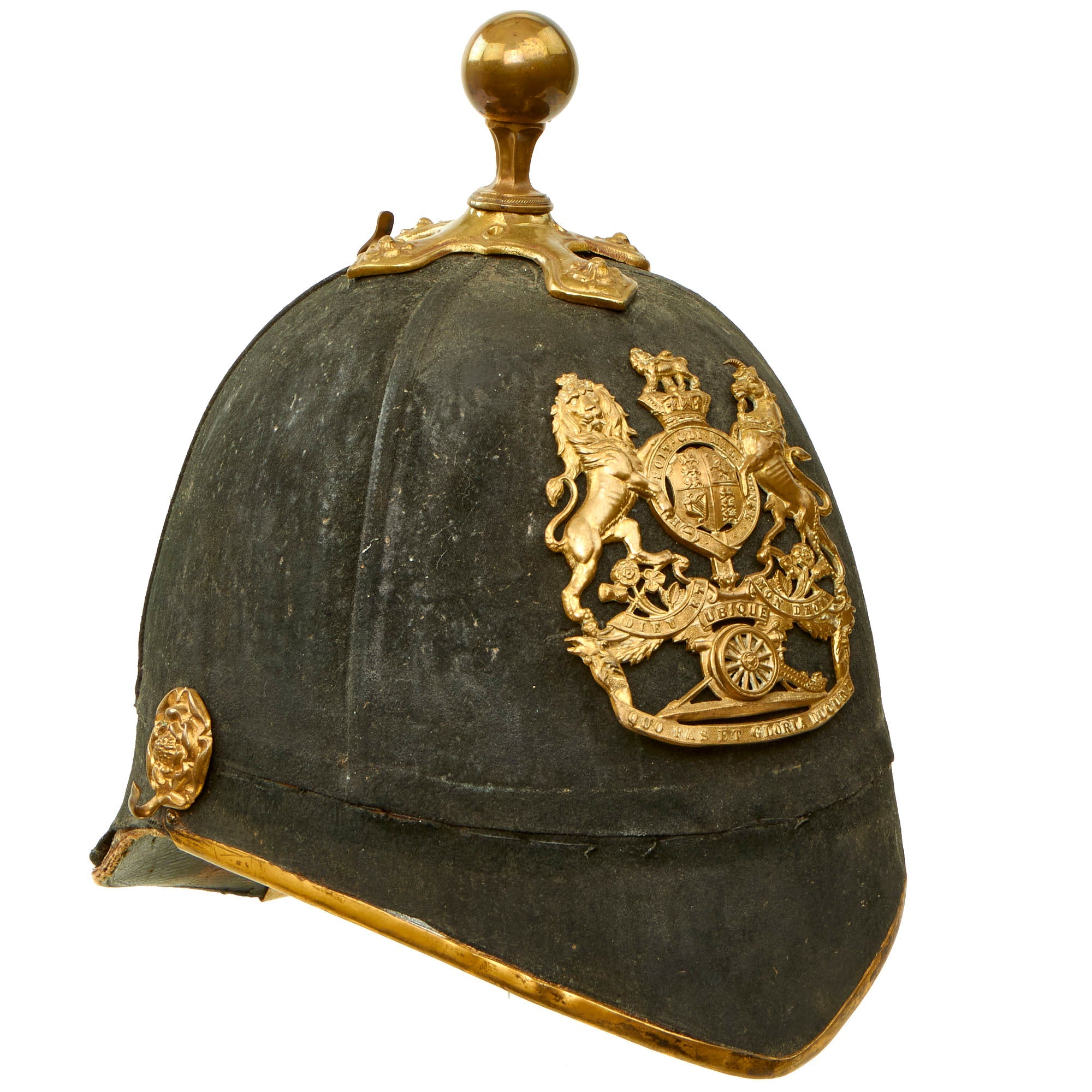 Original Item: Only One Available. This is a well used but solid condition Victorian era British Army Officer Blue Cloth Spiked helmet which is with its ball finial and without scaled chinstrap. The chin strap lugs and spike base ends are all properly adorned with embossed roses. This helmet has gilt brass mounts used on all regular Army helmets.