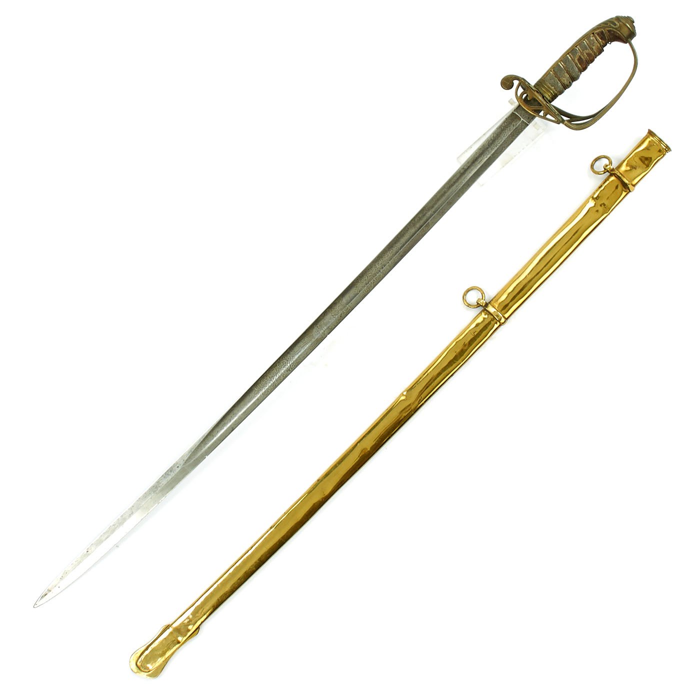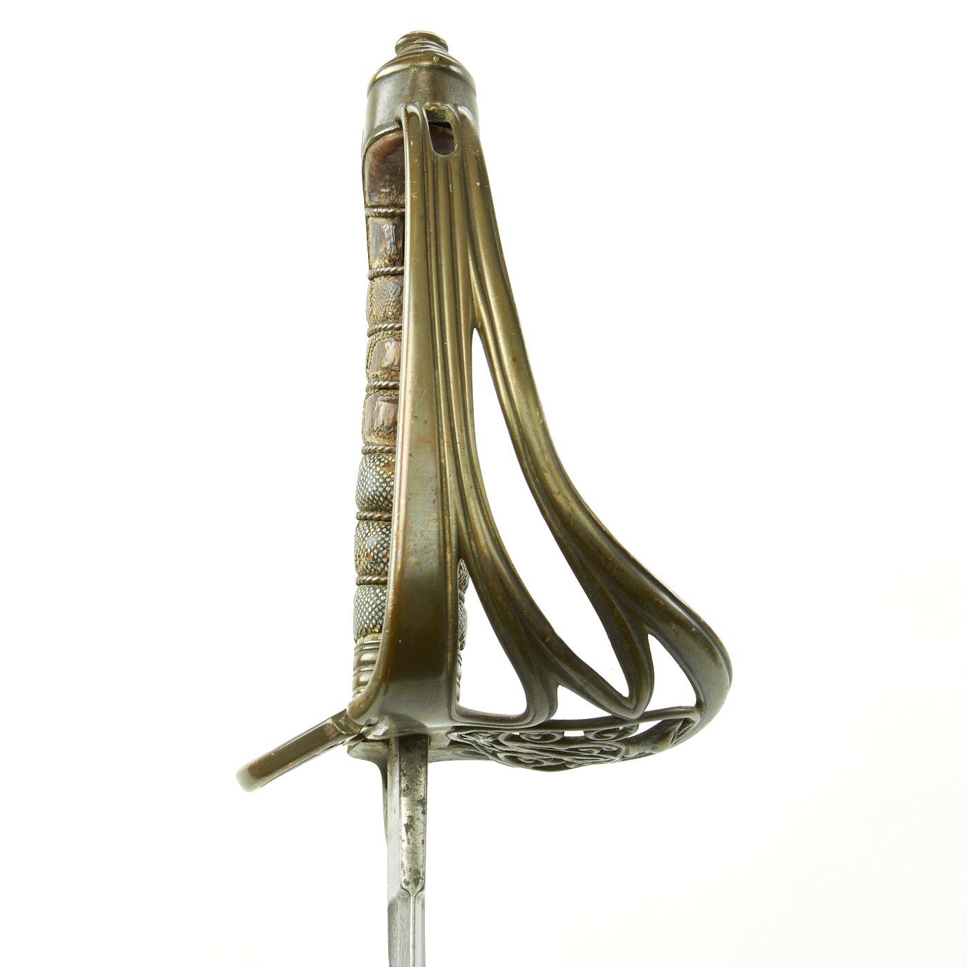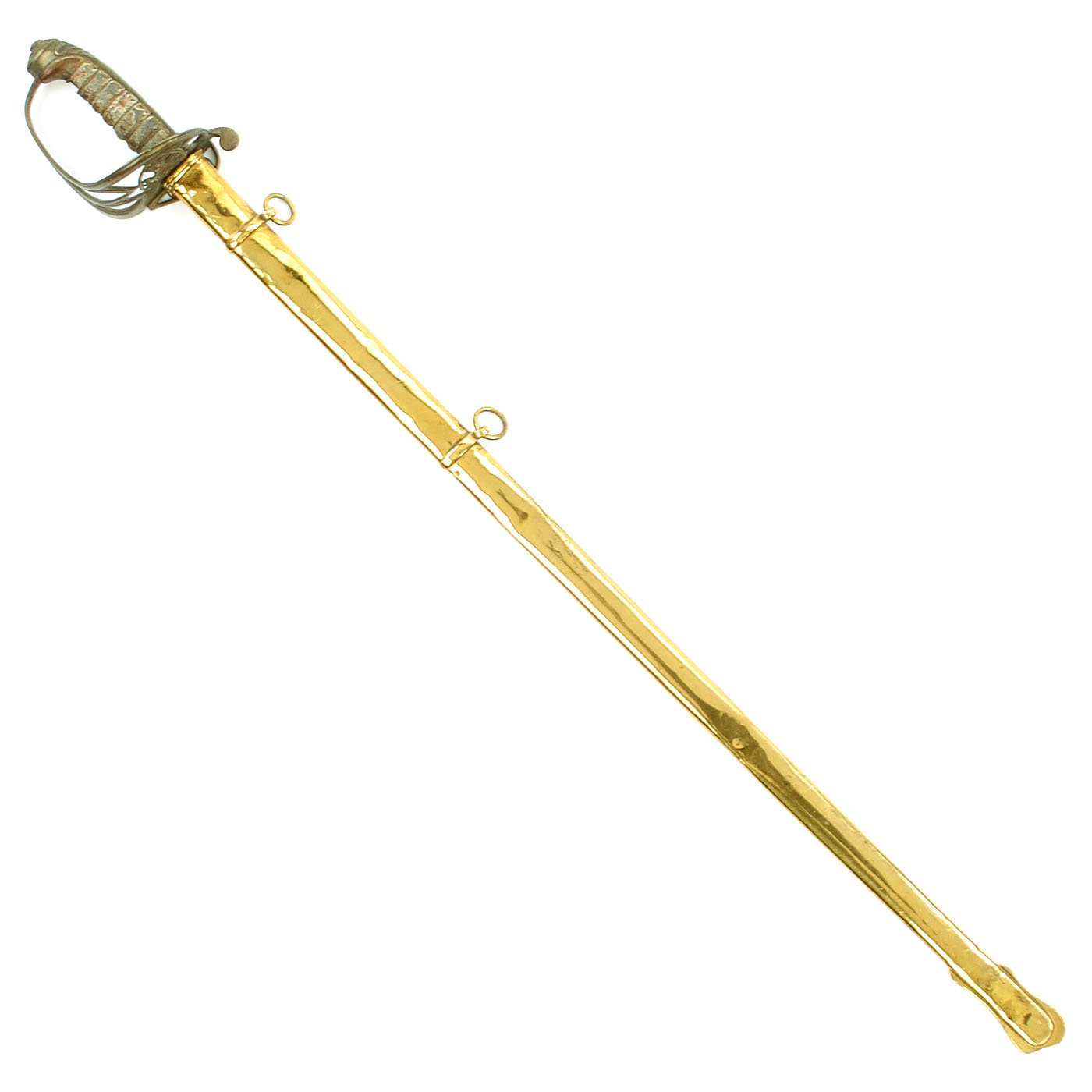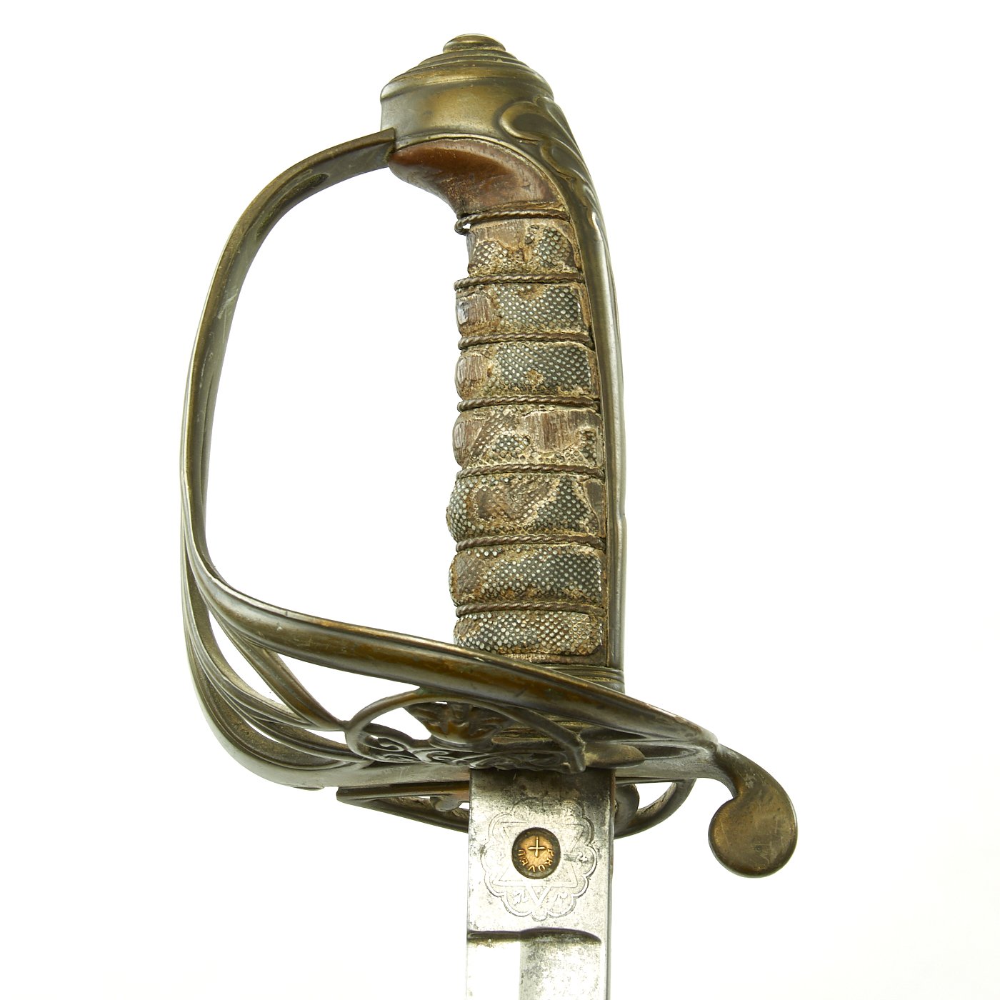 Original Item: Only One Available. This is a very nice British Colonial Infantry Officers Sword (1845 Pattern Sword) manufactured around 1850. This Victorian-era infantry officer's sword features a single fullered etched blade and beautiful gothic style hilt in gilt brass, now faded. The grip is sharkskin over wood, which does show significant wear. This was a sword that saw long service and use.