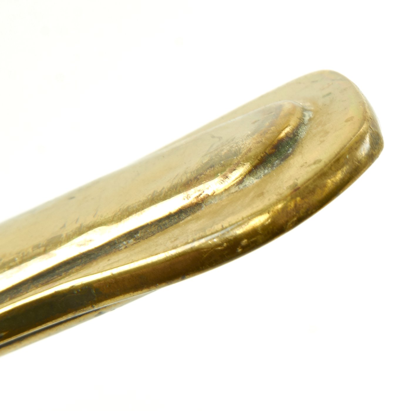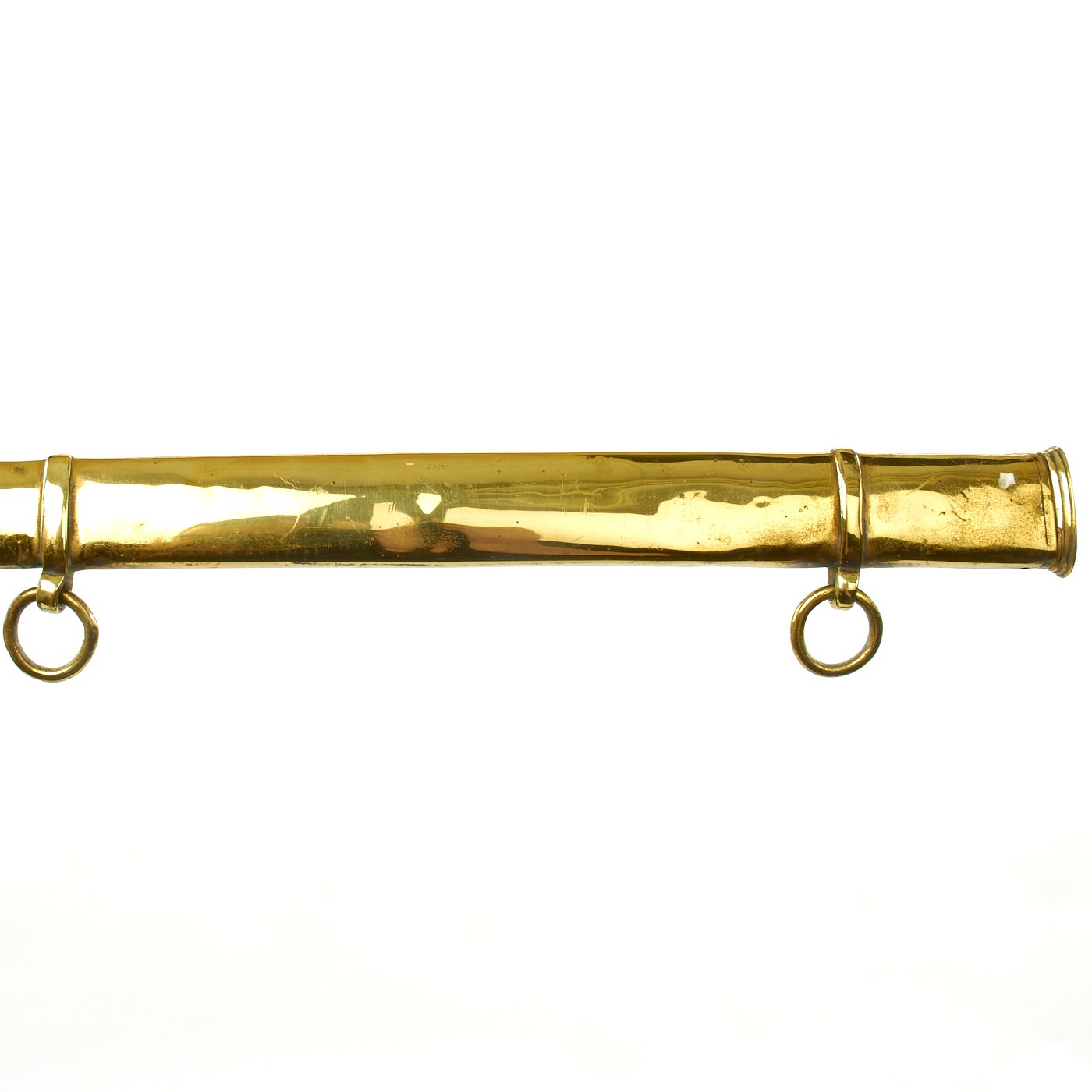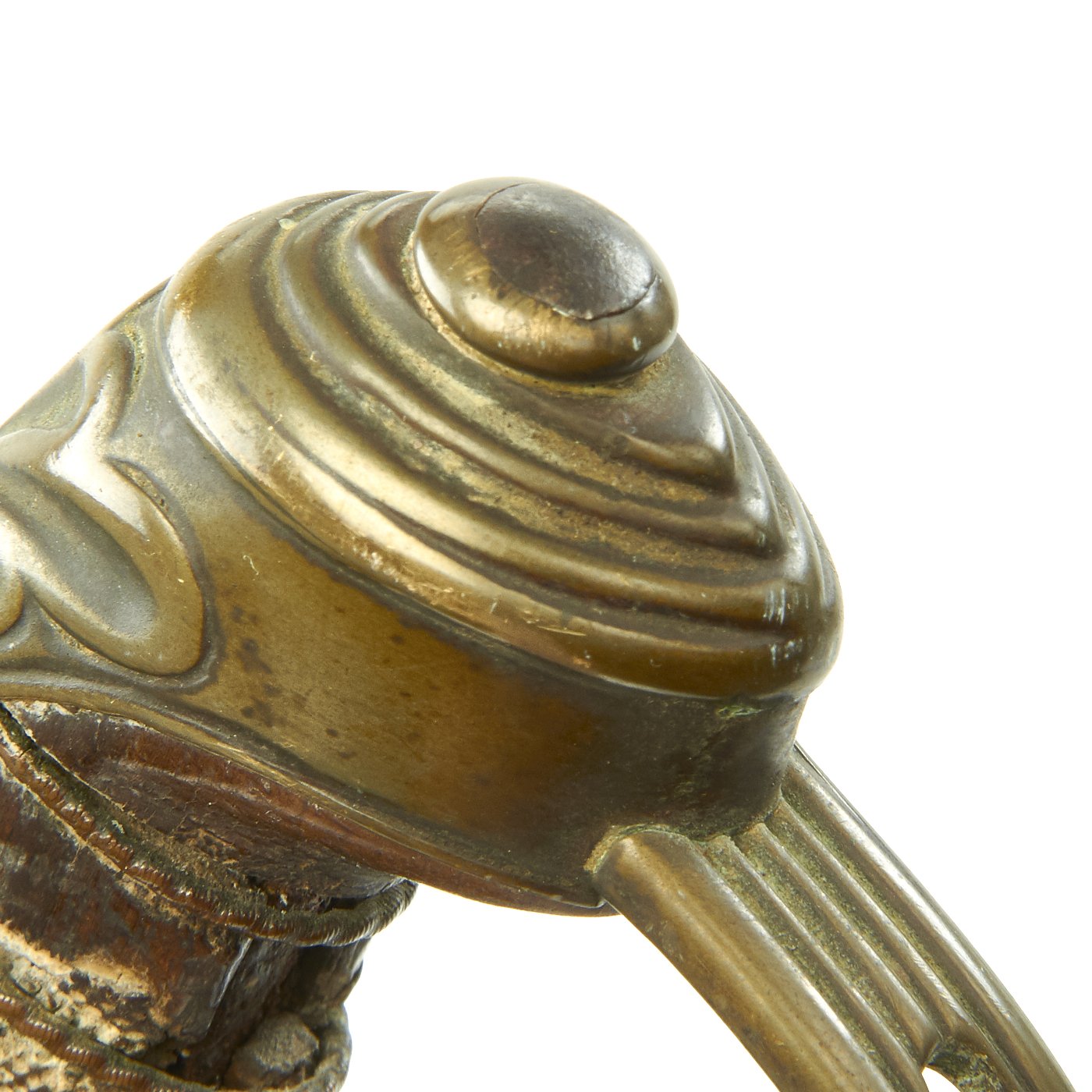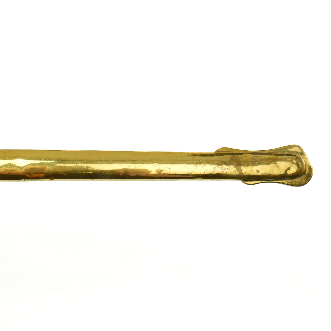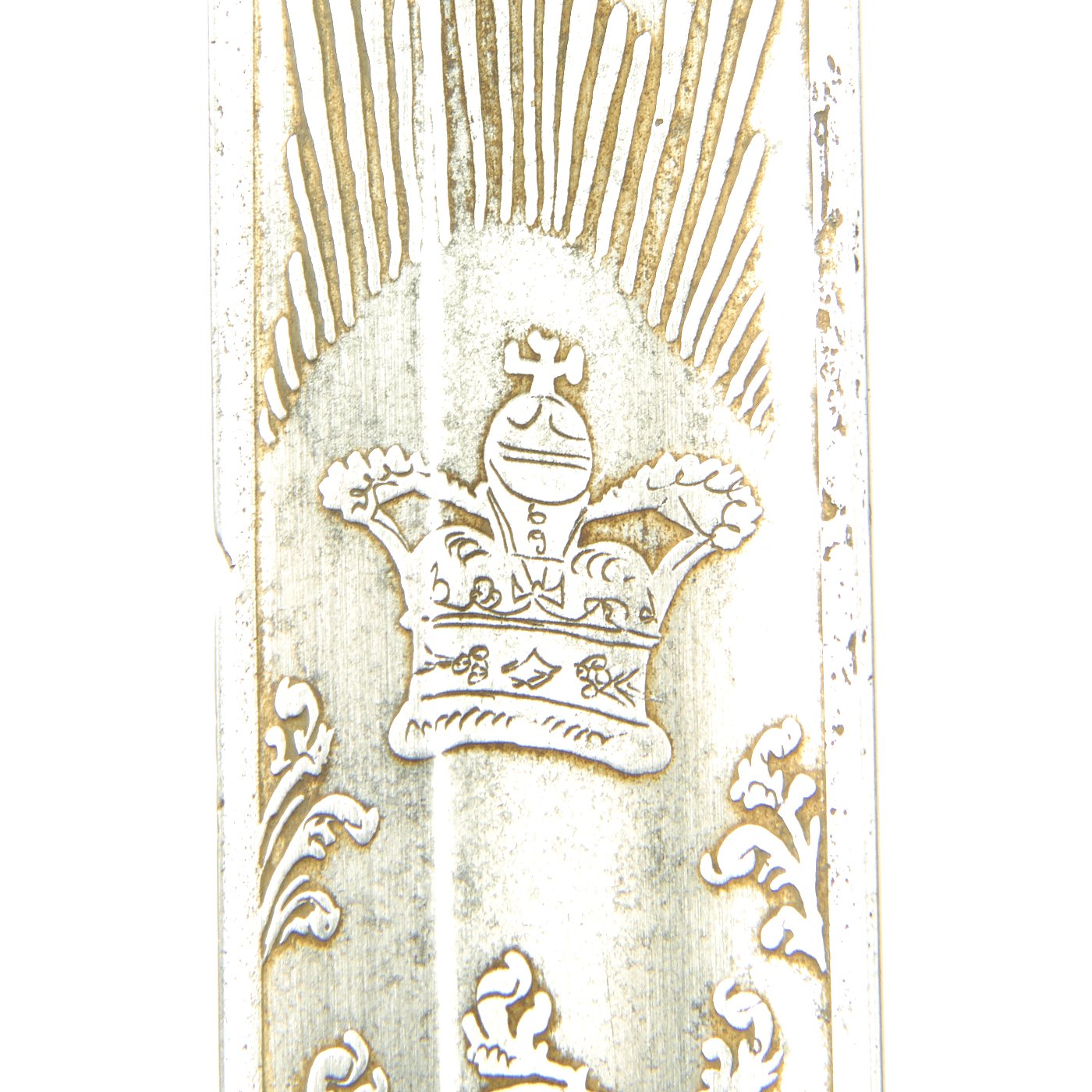 The brass hand guard bears the correct VR cypher for Victoria Regina, with a matching totally original all brass tropical scabbard. The 32" blade has etching on the first 2/3, including the VR Royal Cypher, as well as some very nicely executed British QUEEN'S CROWN designs. Scabbard was polished and lacquered at some point, so it presents very well. There are definitely some dents, as the colonial issue brass does dent far more easily than the regular steel. However it still looks great!