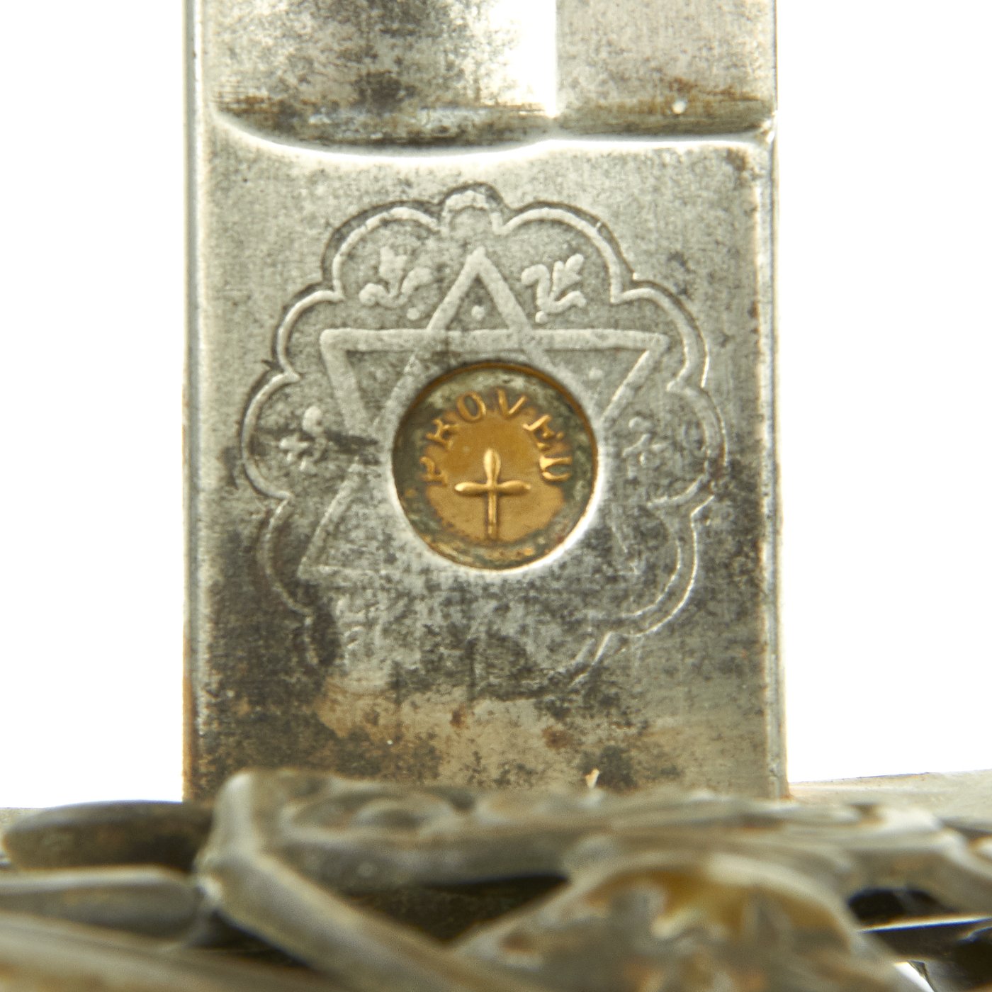 The blade at the base is marked PROVED in a brass disc inside a 6 pointed star and on the reverse: