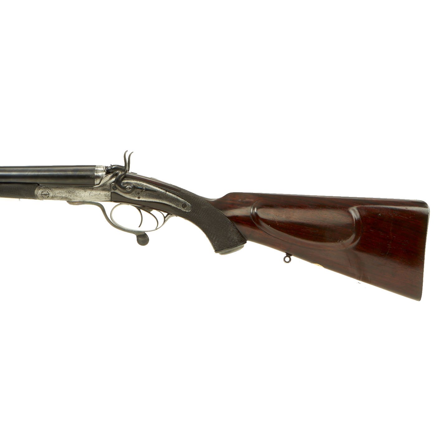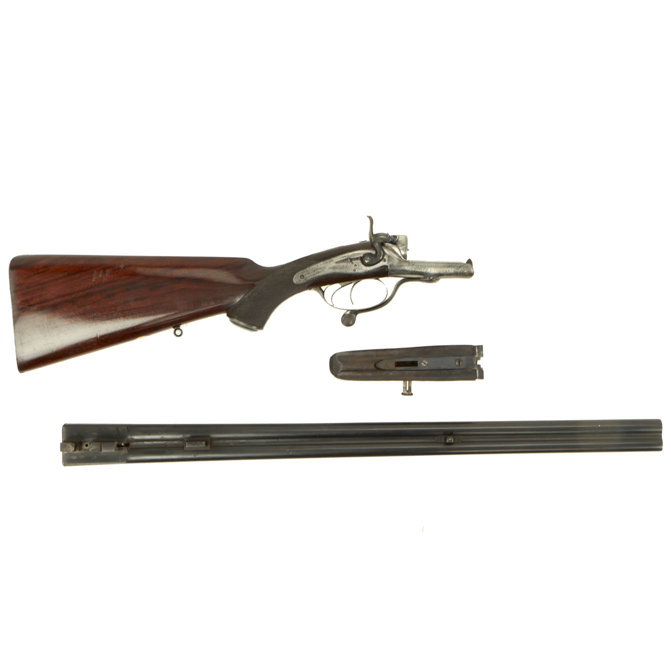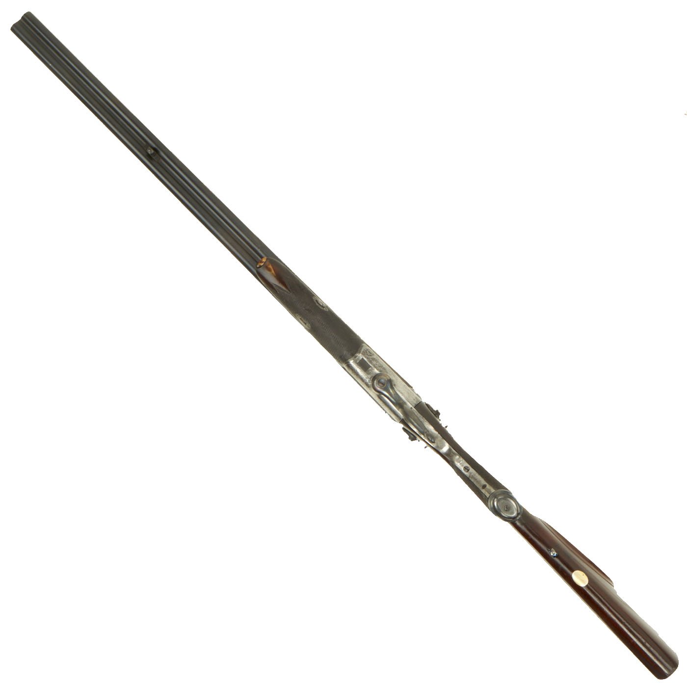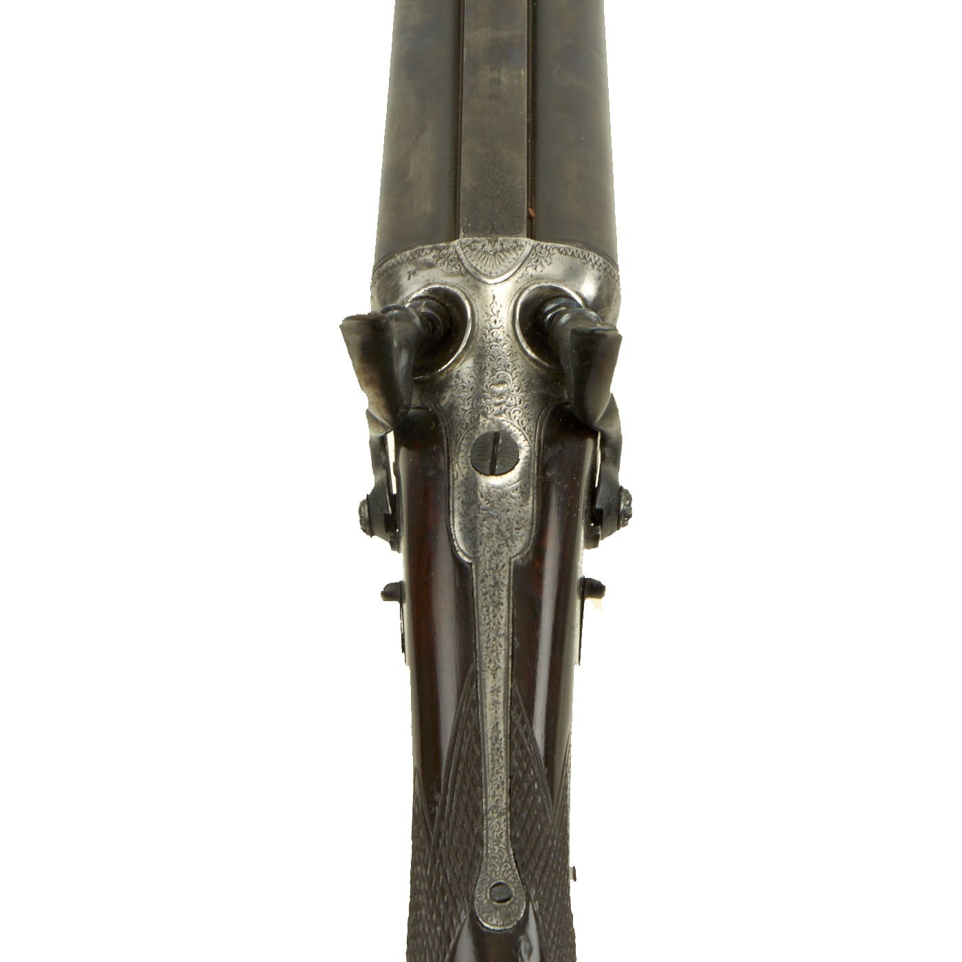 This definitely looks to be an example made for a discerning customer, with fully engraved metalwork, a "pistol grip" butt stock with checkering, and a checkered fore grip with a horn inlay at the tip. The buttstock looks to be made from fine hardwood with a lovely color and grain, possibly mahogany or some other exotic species. There are sling attachments under the stock and barrel, for whatever type of carrying strap the owner desired. There is of course some wear from cleaning on the metalwork, and the barrels have most likely been reblued at some time. However it presents magnificently.
