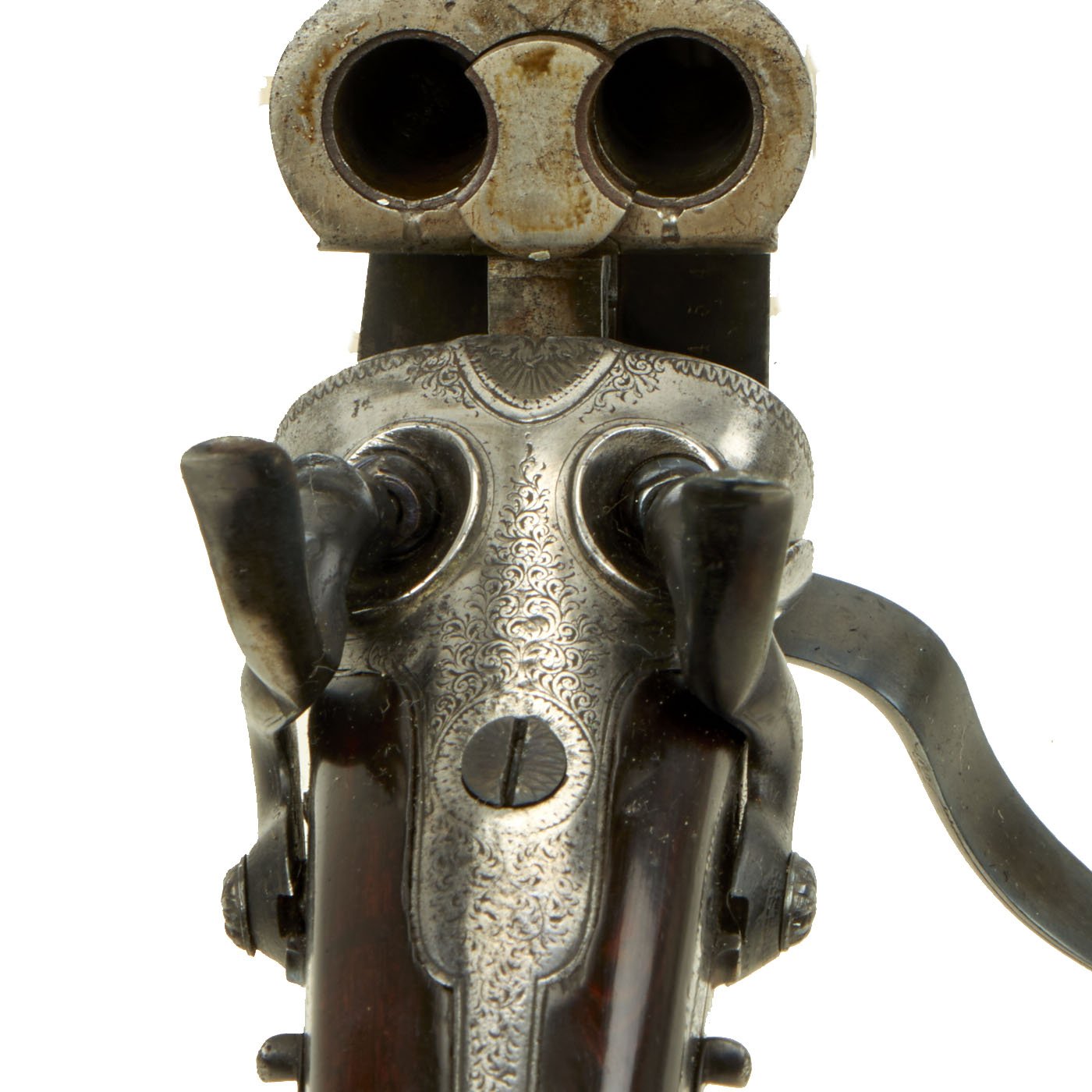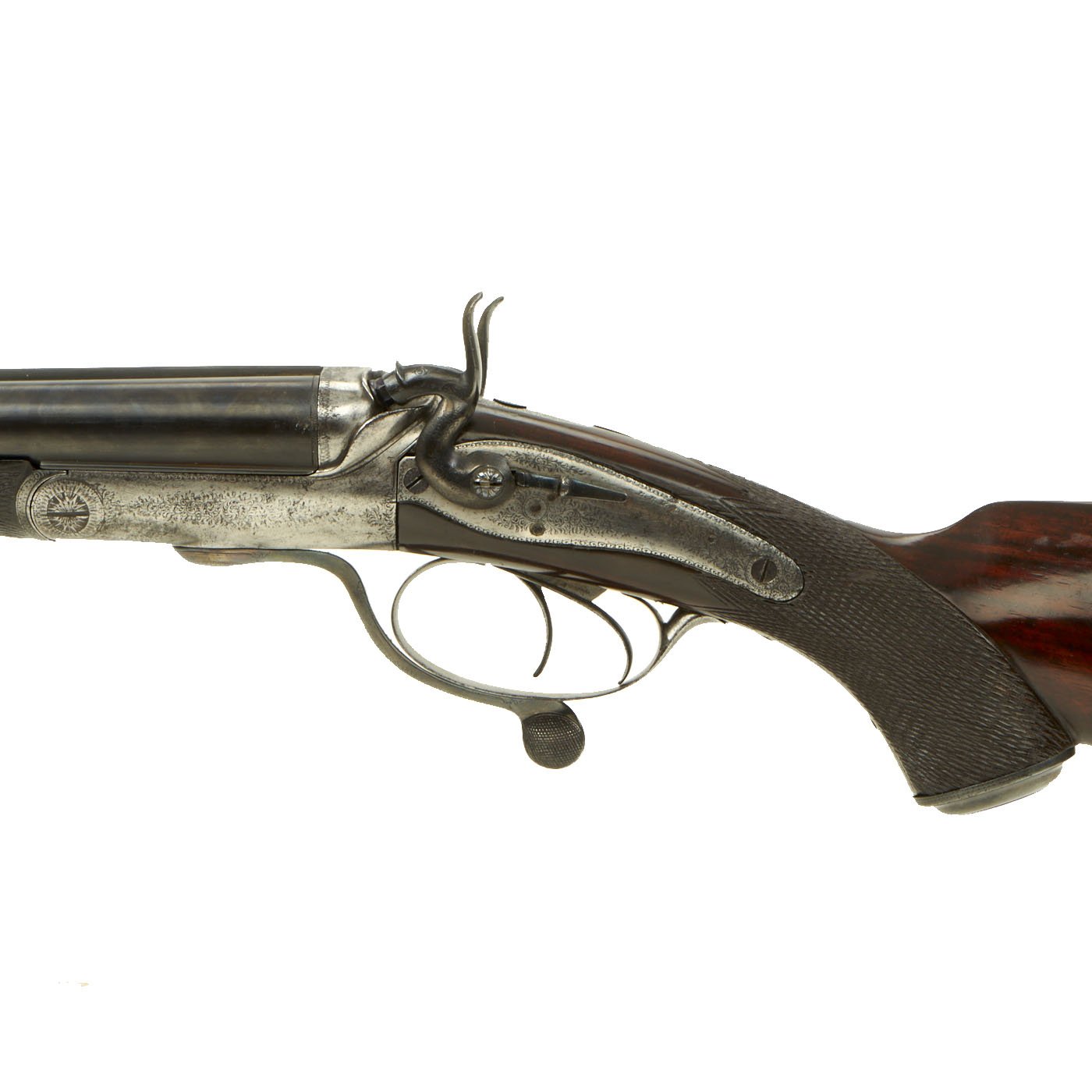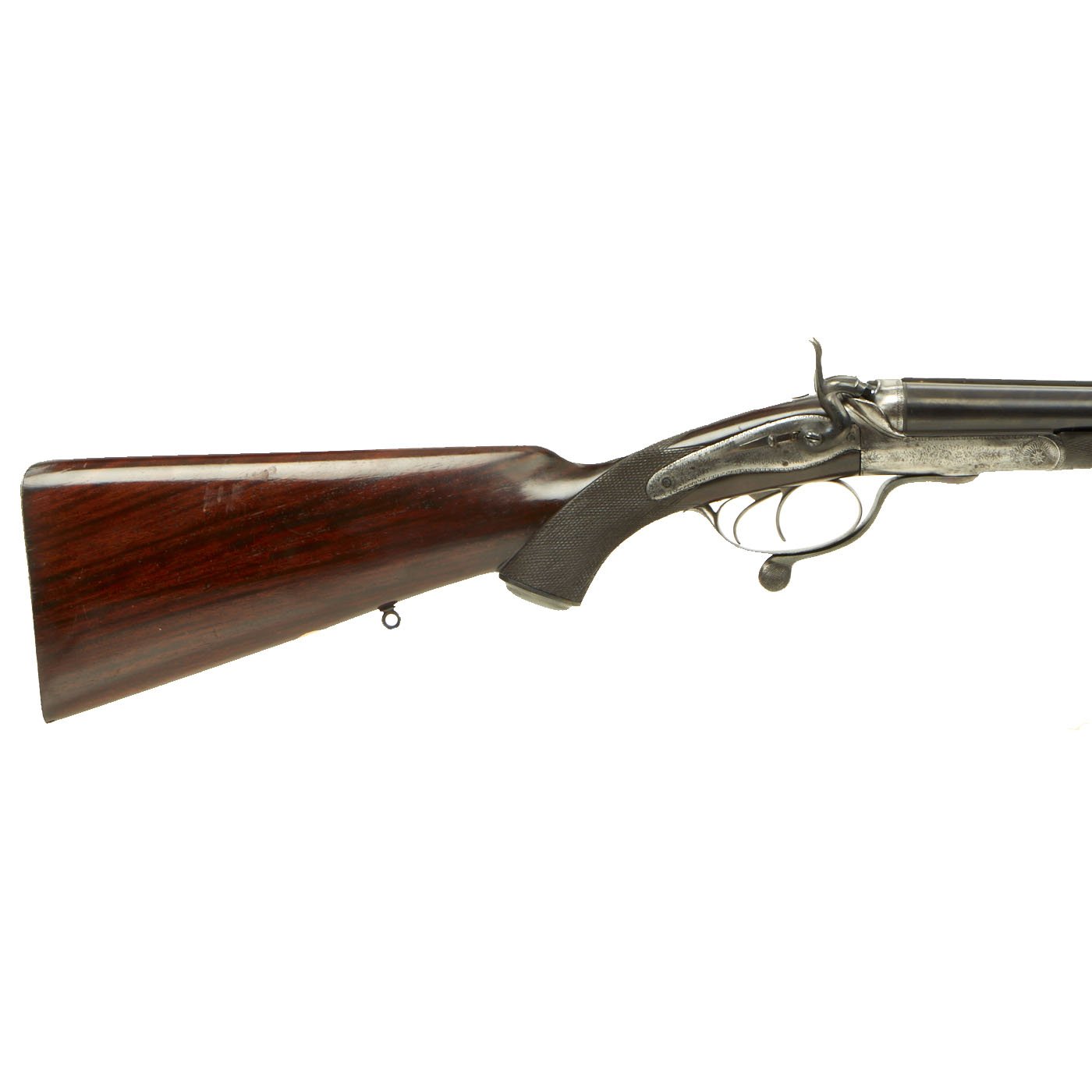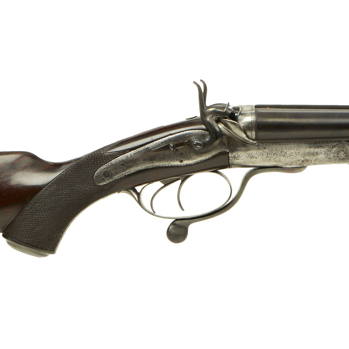 This definitely looks to be an example made for a discerning customer, with fully engraved metalwork, a "pistol grip" butt stock with checkering, and a checkered fore grip with a horn inlay at the tip. The buttstock looks to be made from fine hardwood with a lovely color and grain, possibly mahogany or some other exotic species. There are sling attachments under the stock and barrel, for whatever type of carrying strap the owner desired. There is of course some wear from cleaning on the metalwork, and the barrels have most likely been reblued at some time. However it presents magnificently.