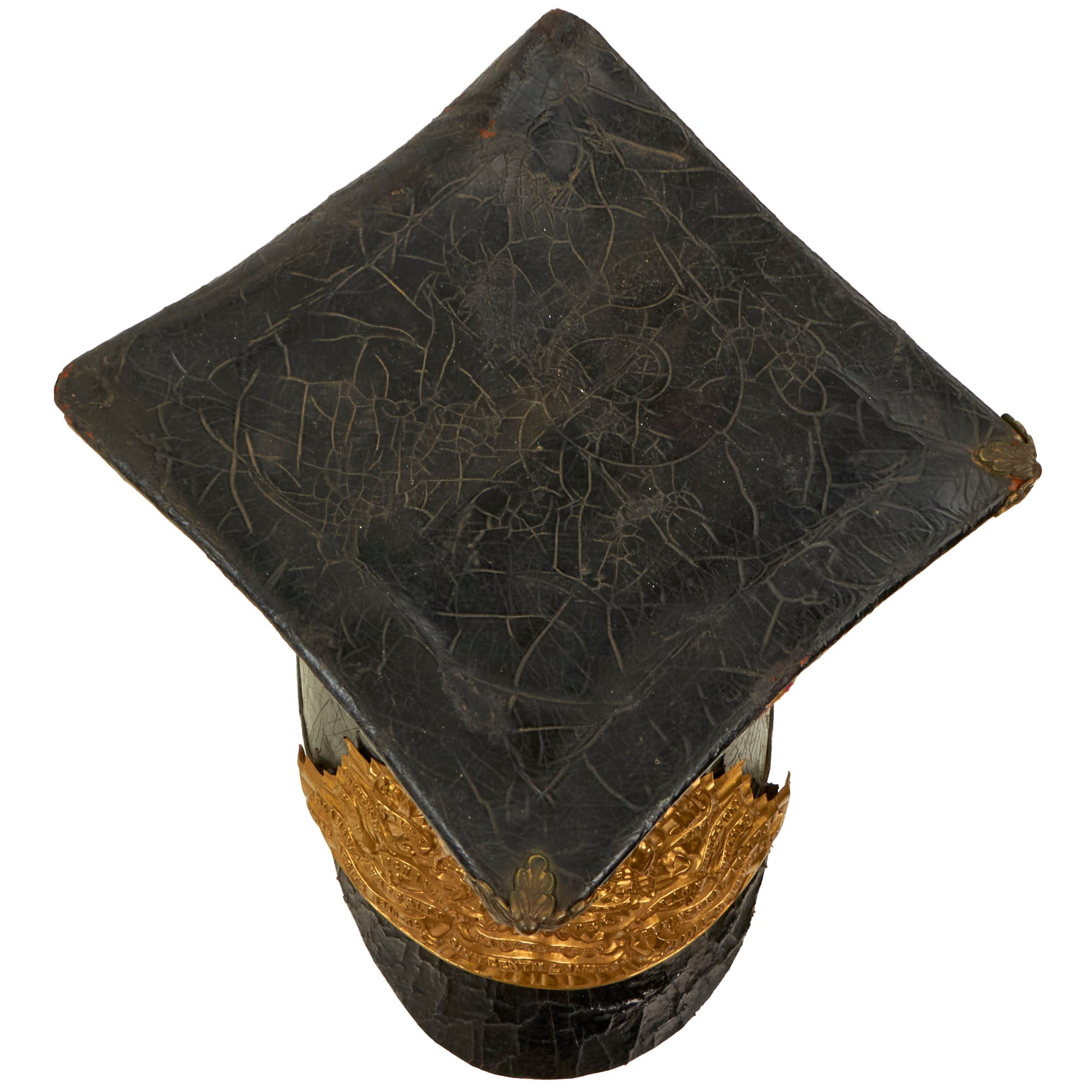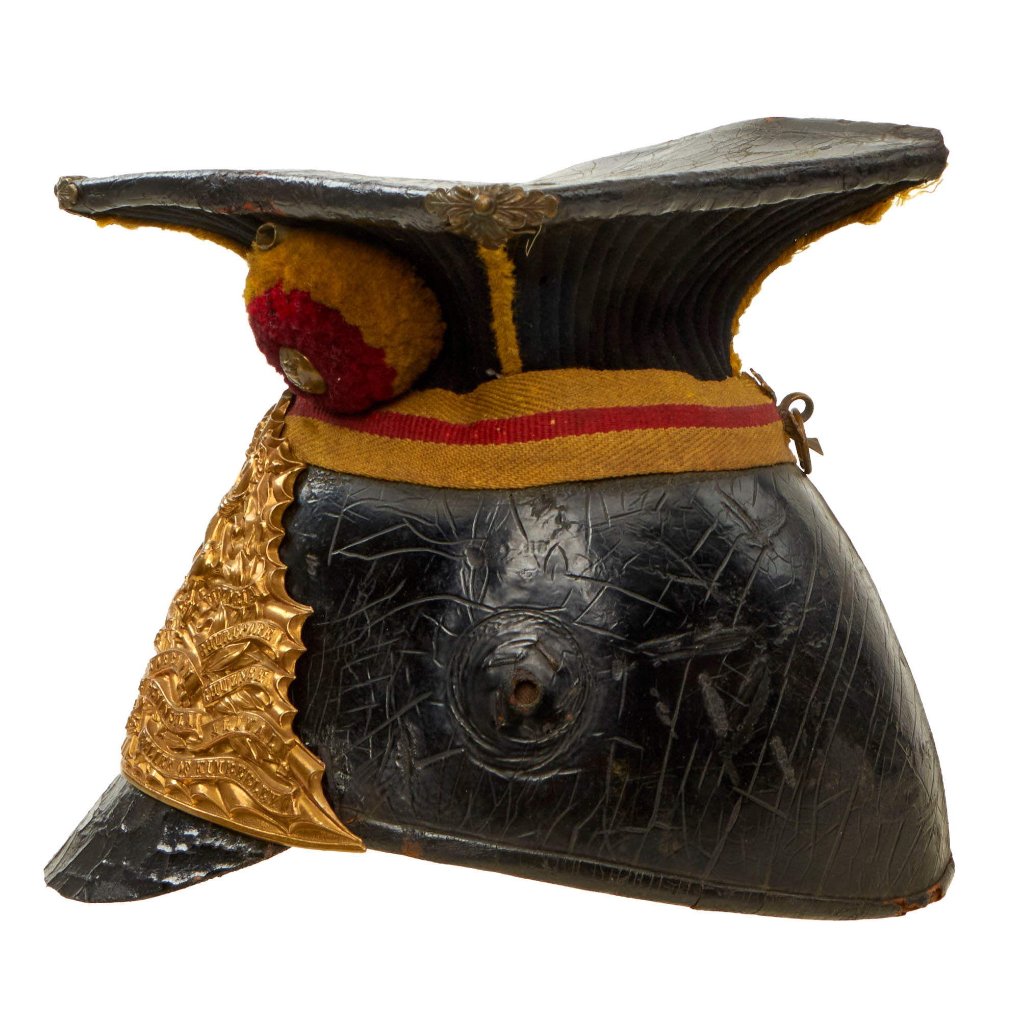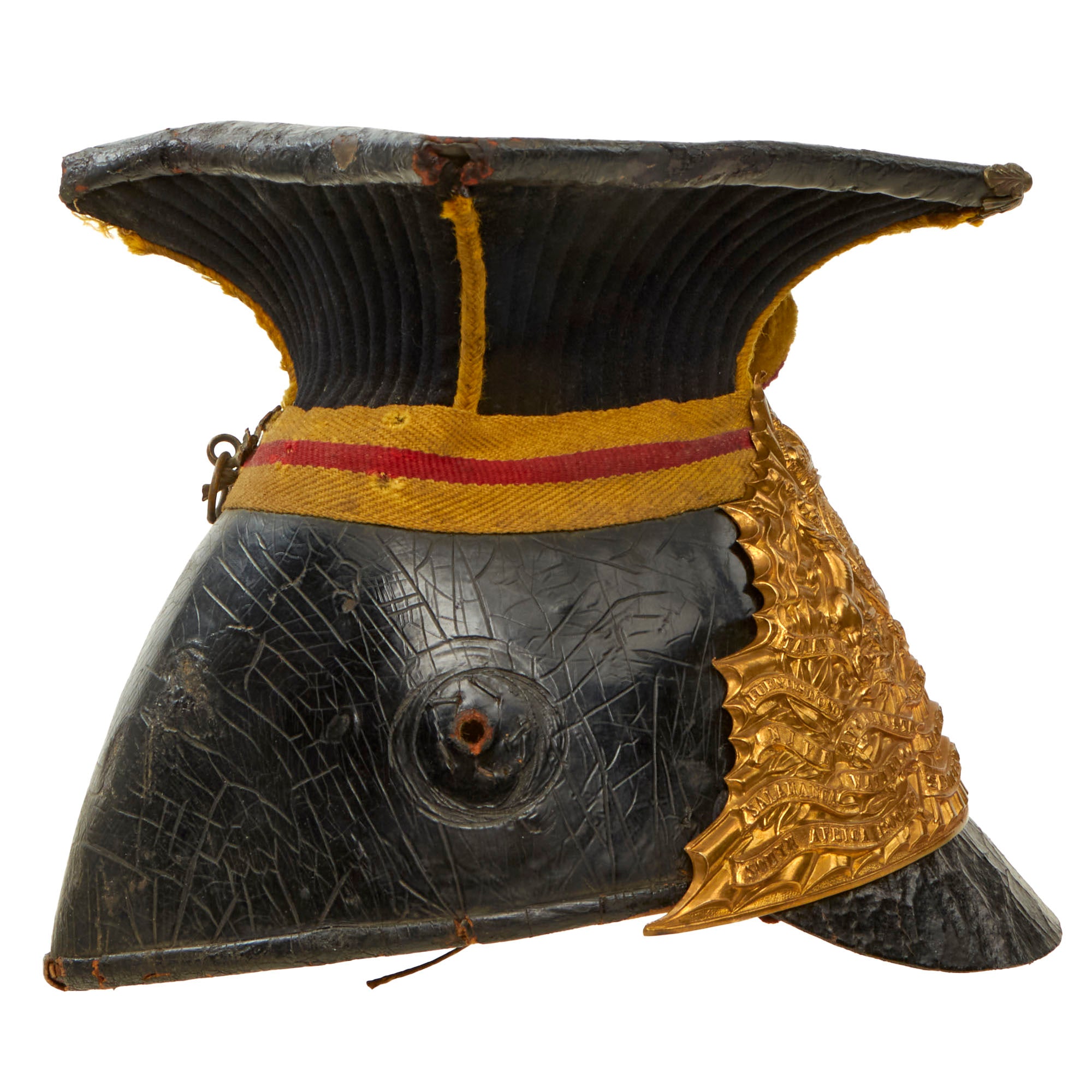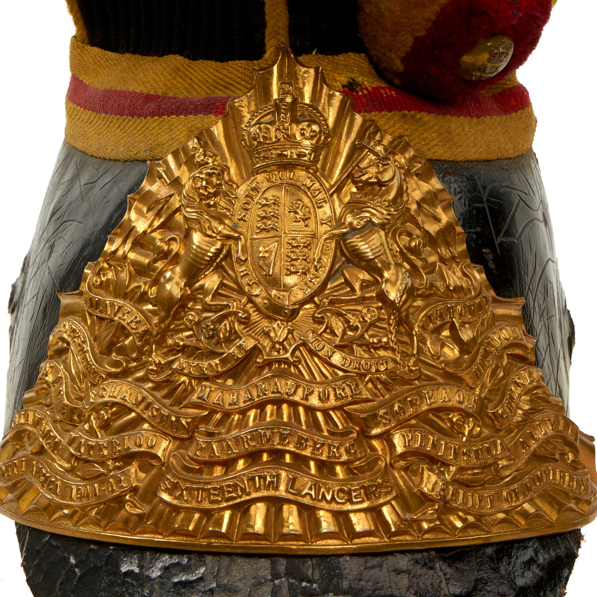The intricate brass helmet plate bearing the regiment title is covered in glorious battle honors, the last of which were in the South African War of 1899-1902 allowing us to accurately date the helmet to 1902. This is a truly classic example of a British Lancer's Helmet from the height of the British Empire.