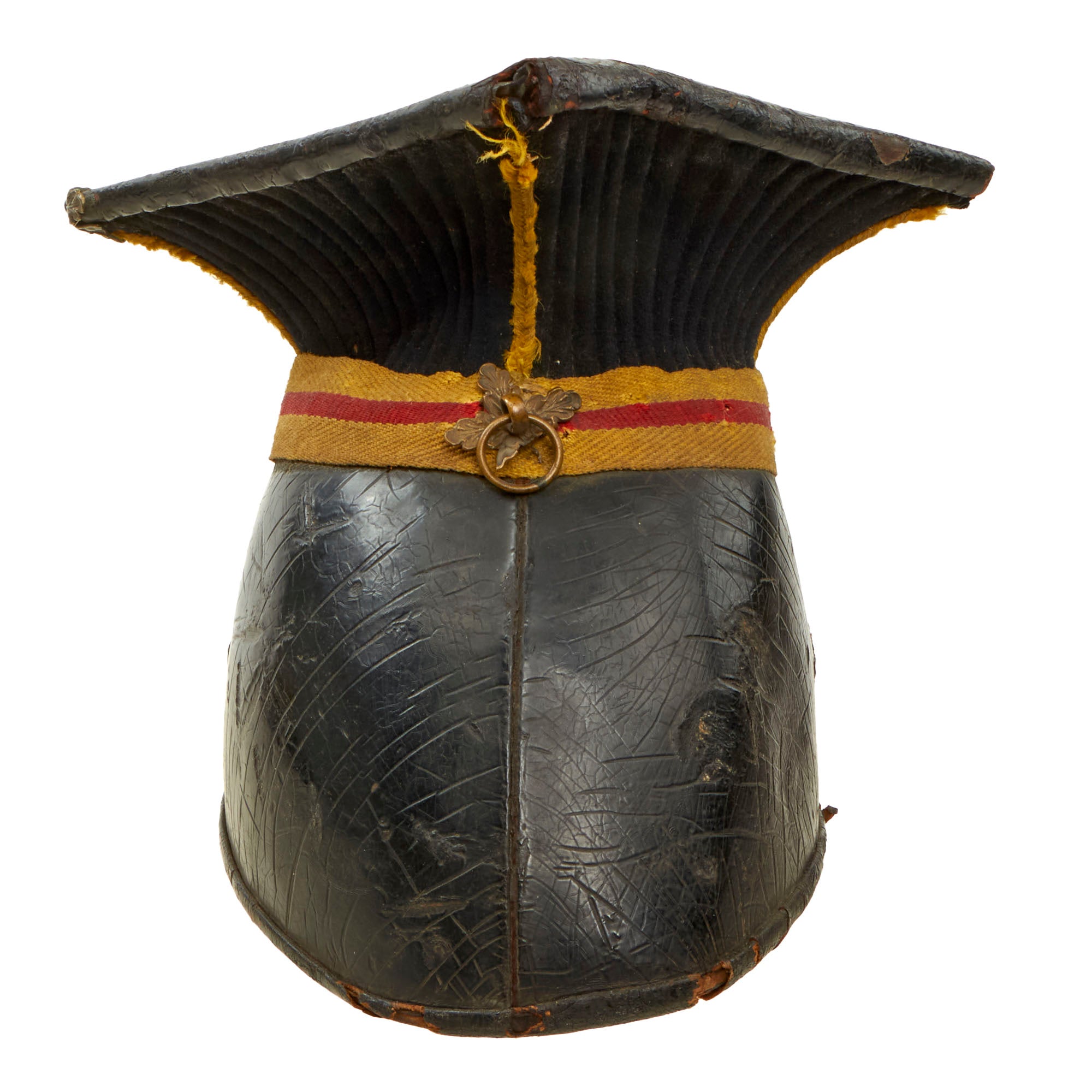 This Chapka helmet is for a Trooper (other ranks). It is offered in fair displayable condition, missing the horsehair plume, chinstrap, and chinstrap bales. The interior lining is torn up with the leather sweatband still retained. A good display piece.
