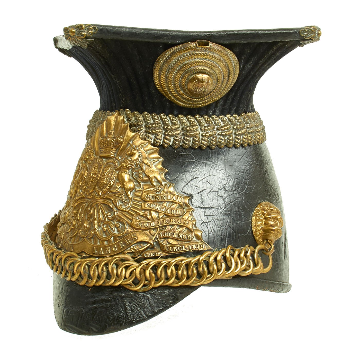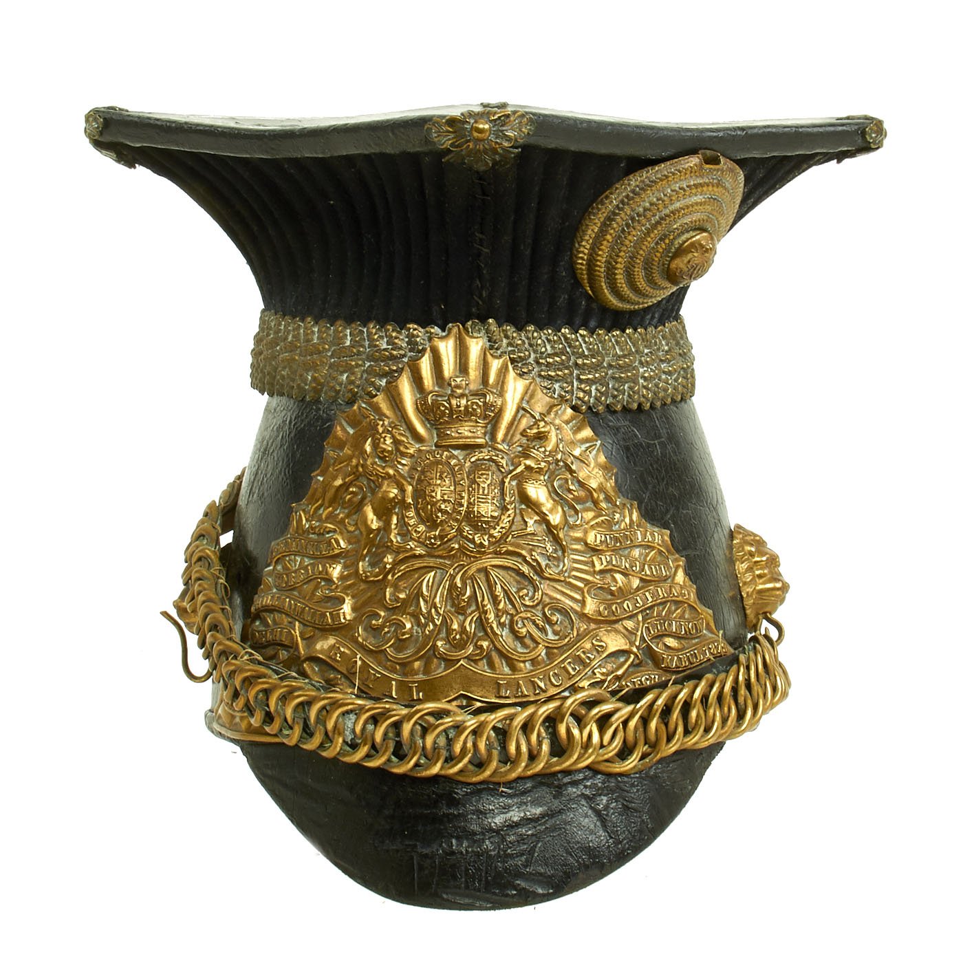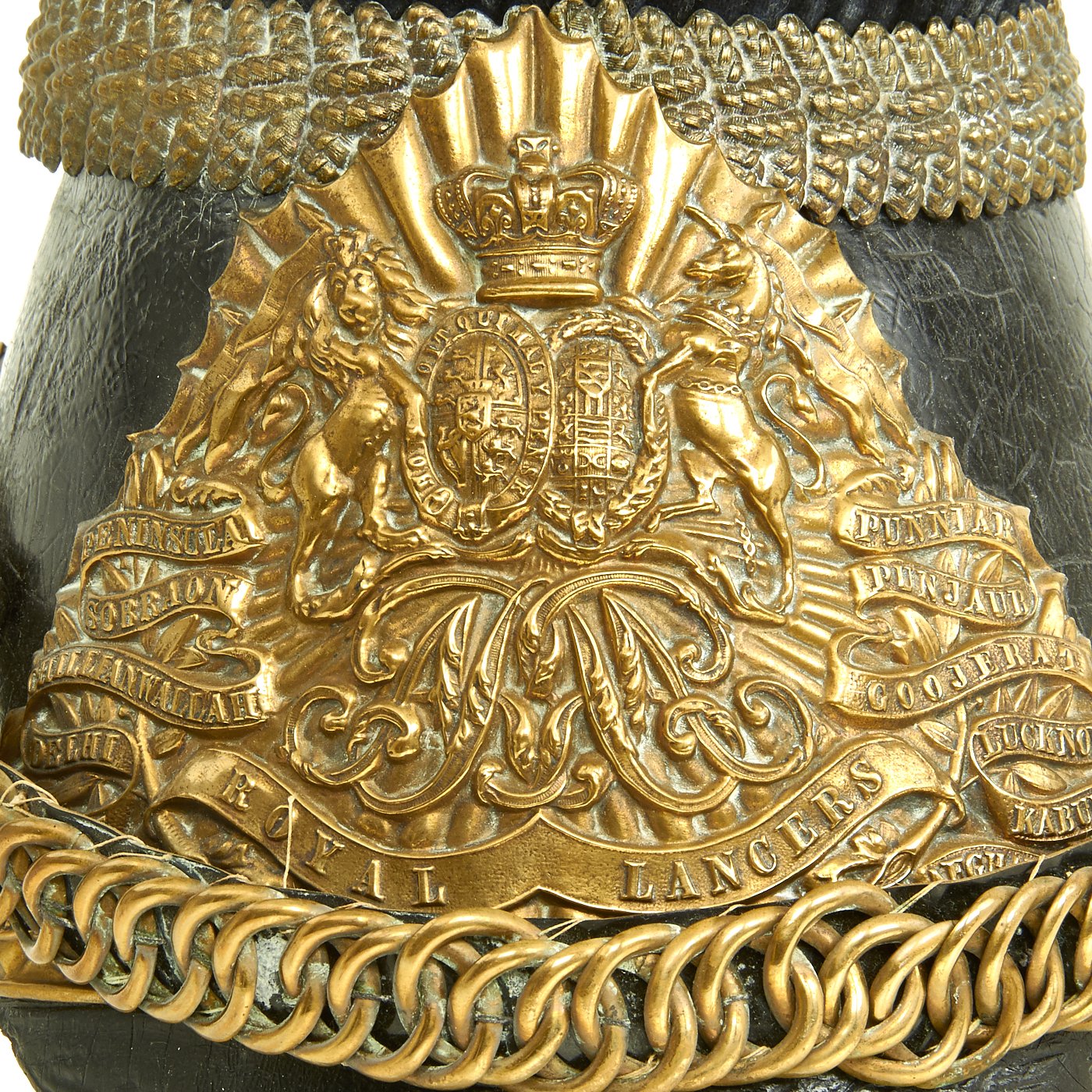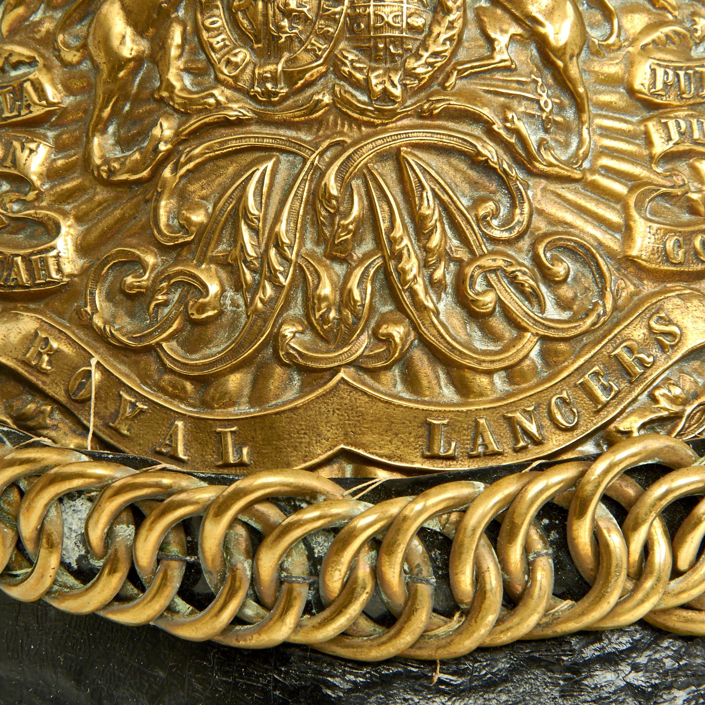 Original Item: Only One Available. British 19th Century Victorian 9th Royal Lancers Other Ranks Helmet Tschapka Lance Cap. The leather body has minor crazing for the period of the helmet. The Lance Cap has the correct skull and peak with correct brass rope effect waist. The rear has the correct brass ring & hook. The sides are covered in black facing cloth. Brass piping with ornate finials extends down the 4 angles. The cap has the correct brass rosette with Crown and ‘9’ (9th Lancer’s) brass button and Lion’s head bosses with correct leather backed link brass chain. Regrettably the horse hair plume is not present. The cap is fitted with correct rayed plate and badge comprising the Queens's Crown Royal arms, Queen Adelaide ‘AR’ Royal cypher and Battle honors. The cap is complete with original leather sweat band and cotton lining. It is approximate US size 6 1/2.