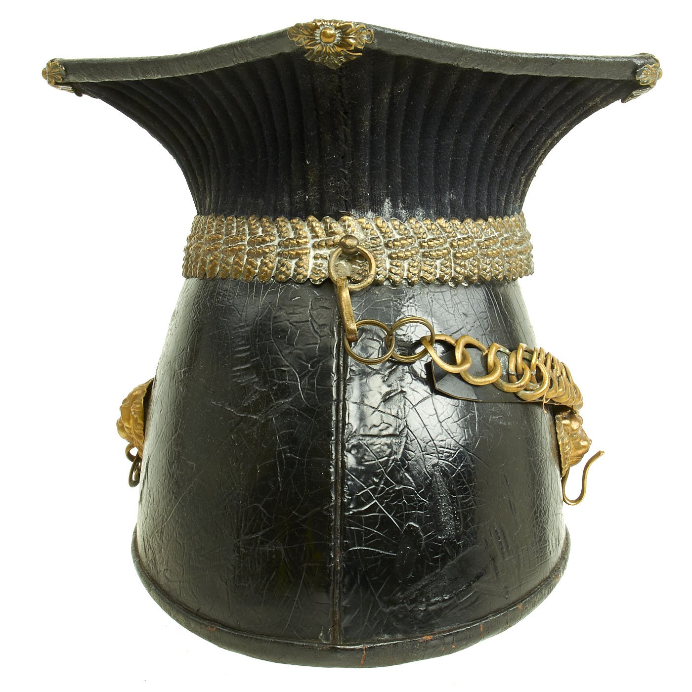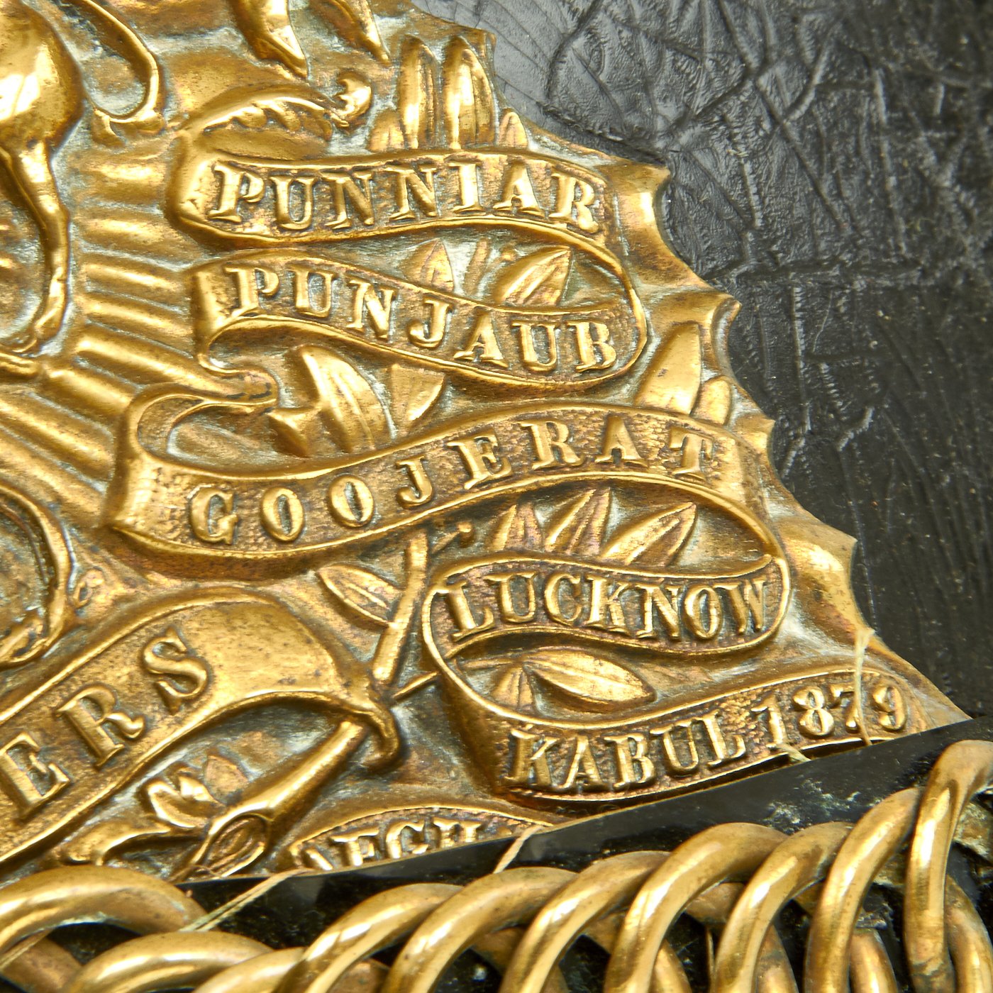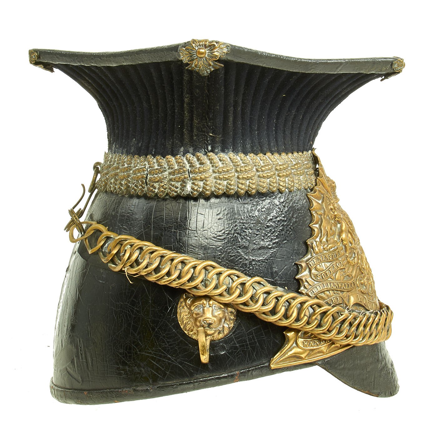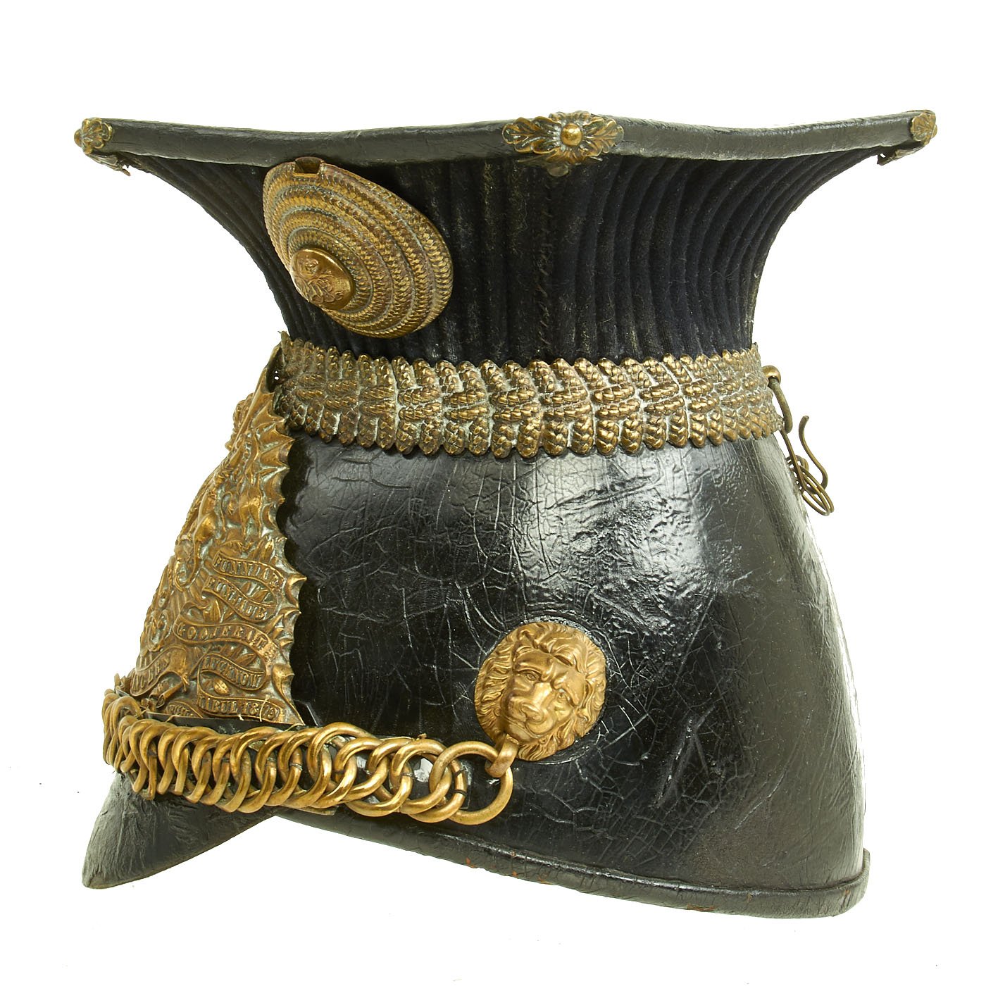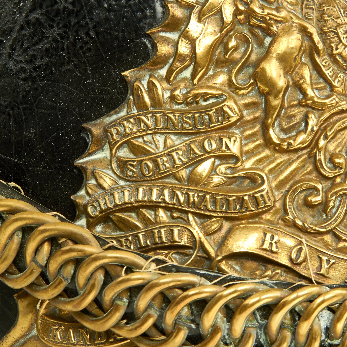 Original Item: Only One Available. British 19th Century Victorian 9th Royal Lancers Other Ranks Helmet Tschapka Lance Cap. The leather body has minor crazing for the period of the helmet. The Lance Cap has the correct skull and peak with correct brass rope effect waist. The rear has the correct brass ring & hook. The sides are covered in black facing cloth. Brass piping with ornate finials extends down the 4 angles. The cap has the correct brass rosette with Crown and ‘9’ (9th Lancer’s) brass button and Lion’s head bosses with correct leather backed link brass chain. Regrettably the horse hair plume is not present. The cap is fitted with correct rayed plate and badge comprising the Queens's Crown Royal arms, Queen Adelaide ‘AR’ Royal cypher and Battle honors. The cap is complete with original leather sweat band and cotton lining. It is approximate US size 6 1/2.