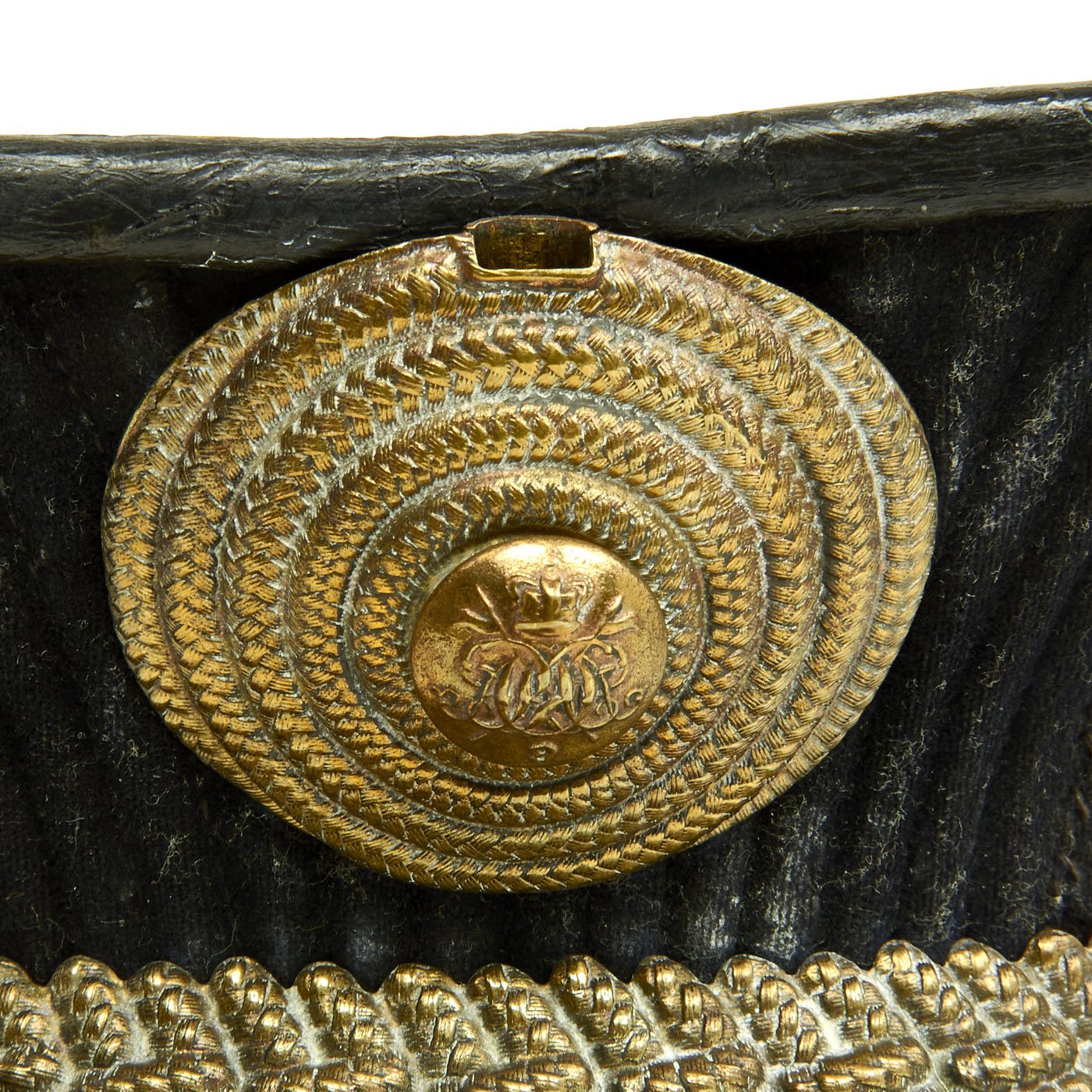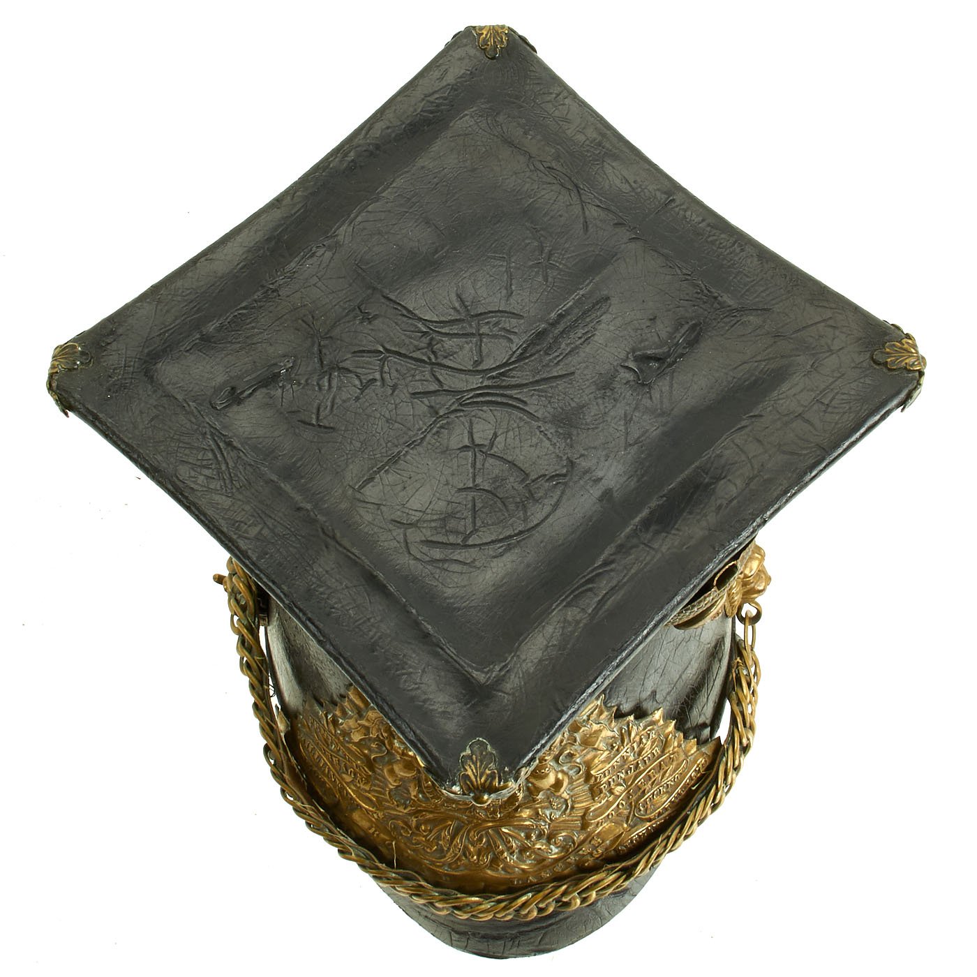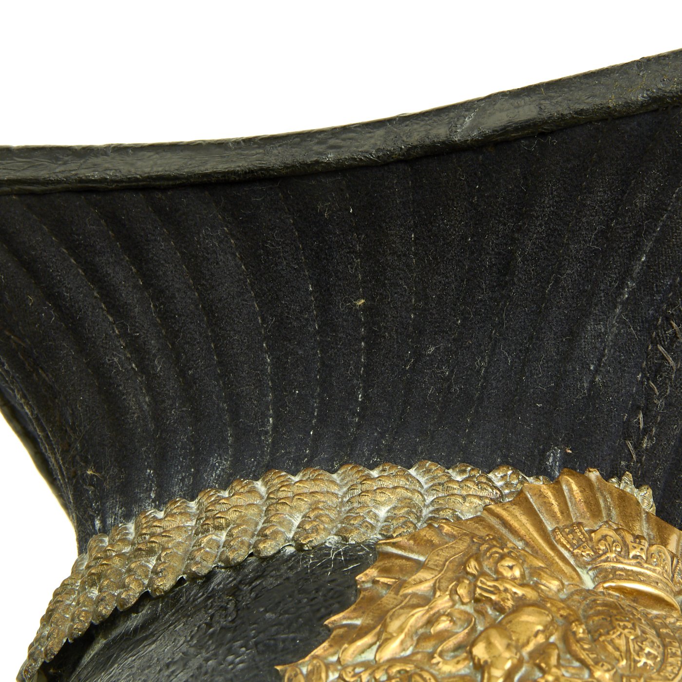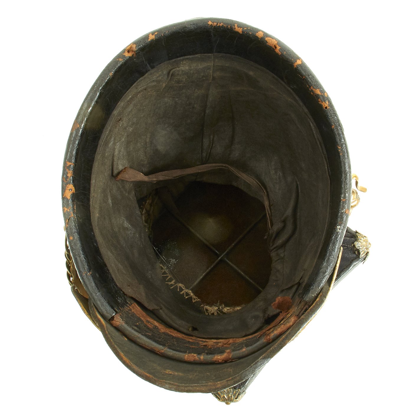 Original Item: Only One Available. British 19th Century Victorian 9th Royal Lancers Other Ranks Helmet Tschapka Lance Cap. The leather body has minor crazing for the period of the helmet. The Lance Cap has the correct skull and peak with correct brass rope effect waist. The rear has the correct brass ring & hook. The sides are covered in black facing cloth. Brass piping with ornate finials extends down the 4 angles. The cap has the correct brass rosette with Crown and ‘9’ (9th Lancer’s) brass button and Lion’s head bosses with correct leather backed link brass chain. Regrettably the horse hair plume is not present. The cap is fitted with correct rayed plate and badge comprising the Queens's Crown Royal arms, Queen Adelaide ‘AR’ Royal cypher and Battle honors. The cap is complete with original leather sweat band and cotton lining. It is approximate US size 6 1/2.