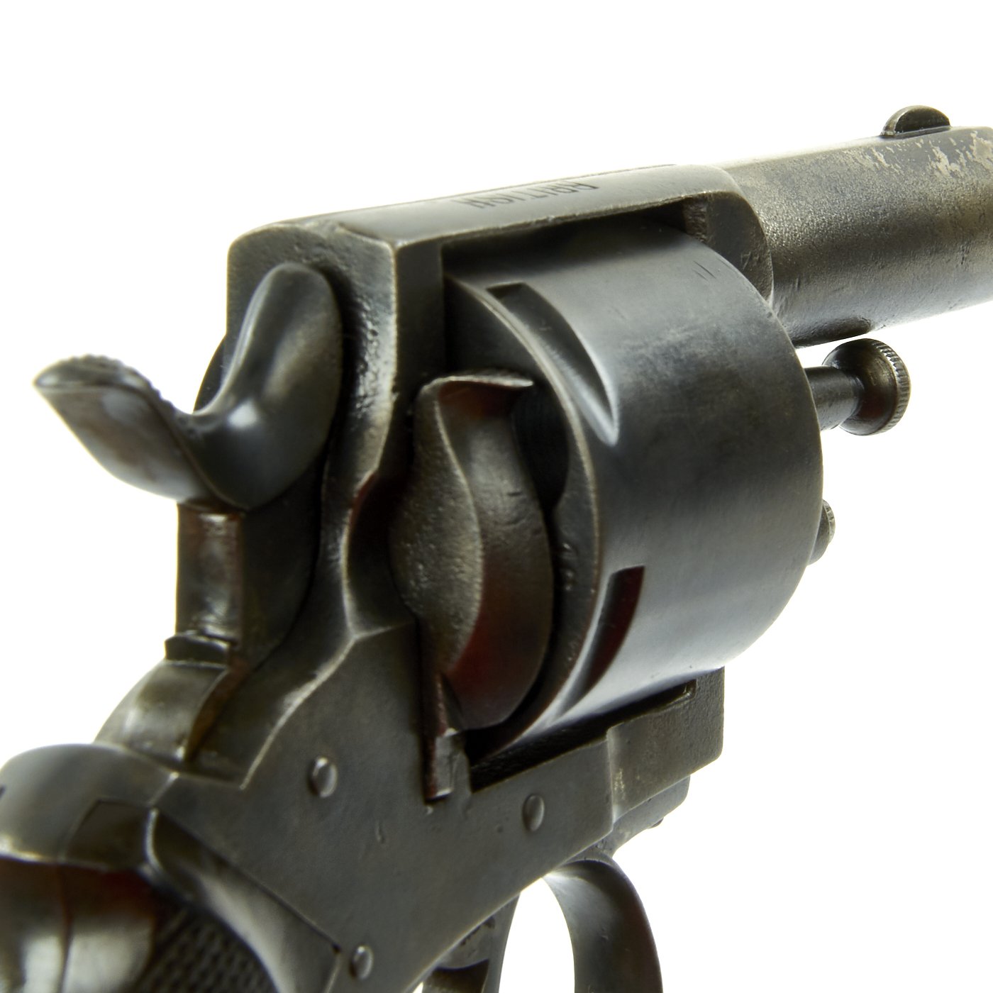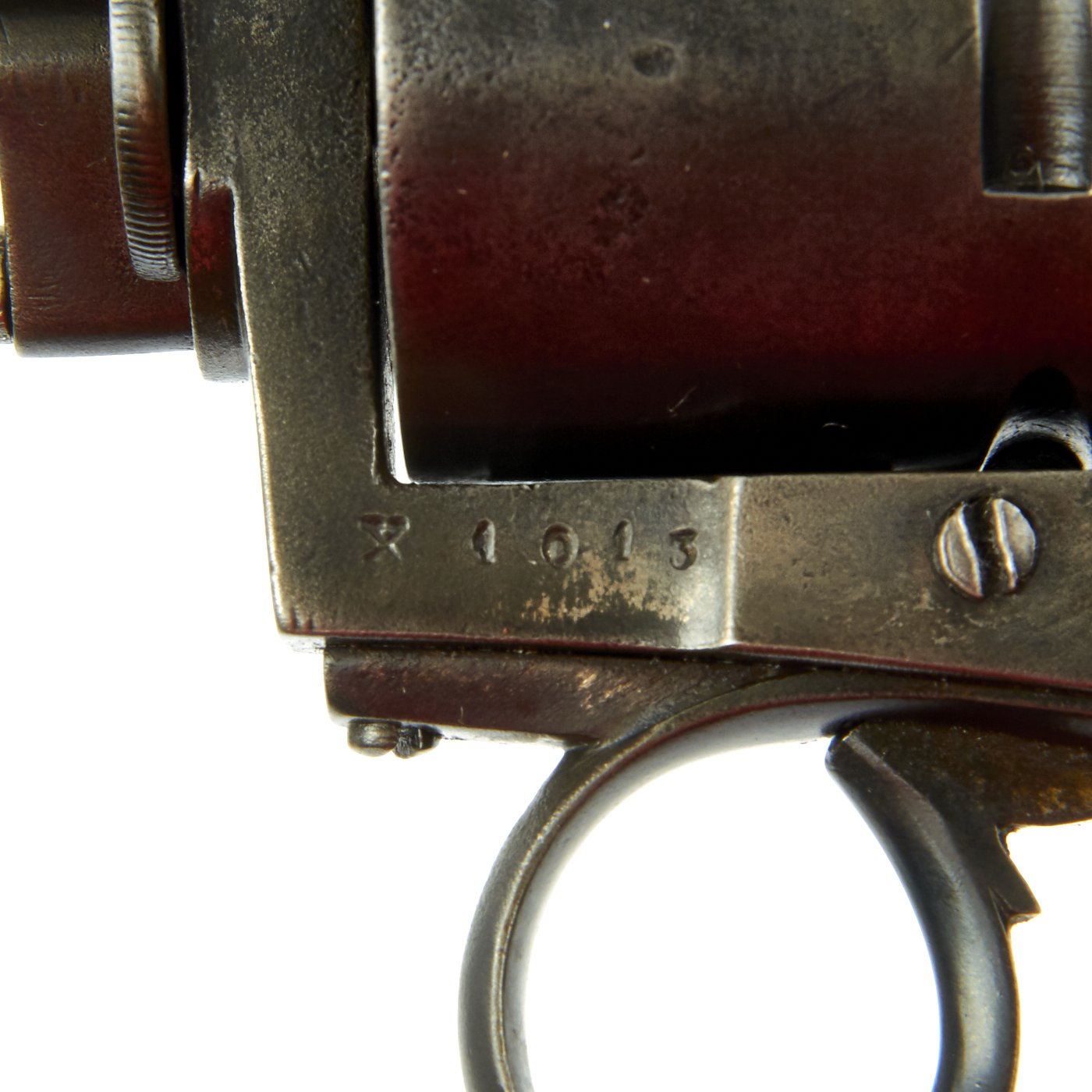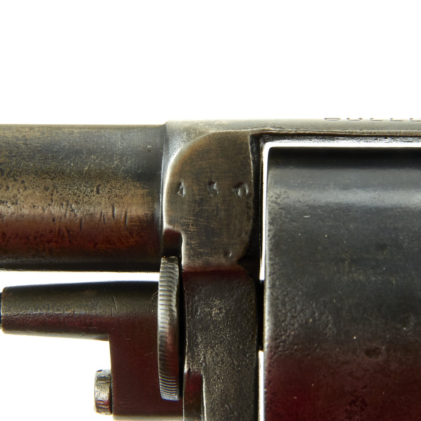 The top strap over the cylinder is stamped BRITISH / BULLDOG, with the frame marked with serial number X 1013. The Cylinder and frame bear Belgian Proof marks, including E / LG / * in an oval, indicating production in the city of Liège for the British Market. The city was a powerhouse of arms production, taking in many government contracts, as well as contracts to private arms companies. The frame by the barrel is marked 450, indicating chambering in the very large .450 Adams / .450 Boxer Mk I cartridge. It was probably also designed to accommodate other similar black powder cartridges.