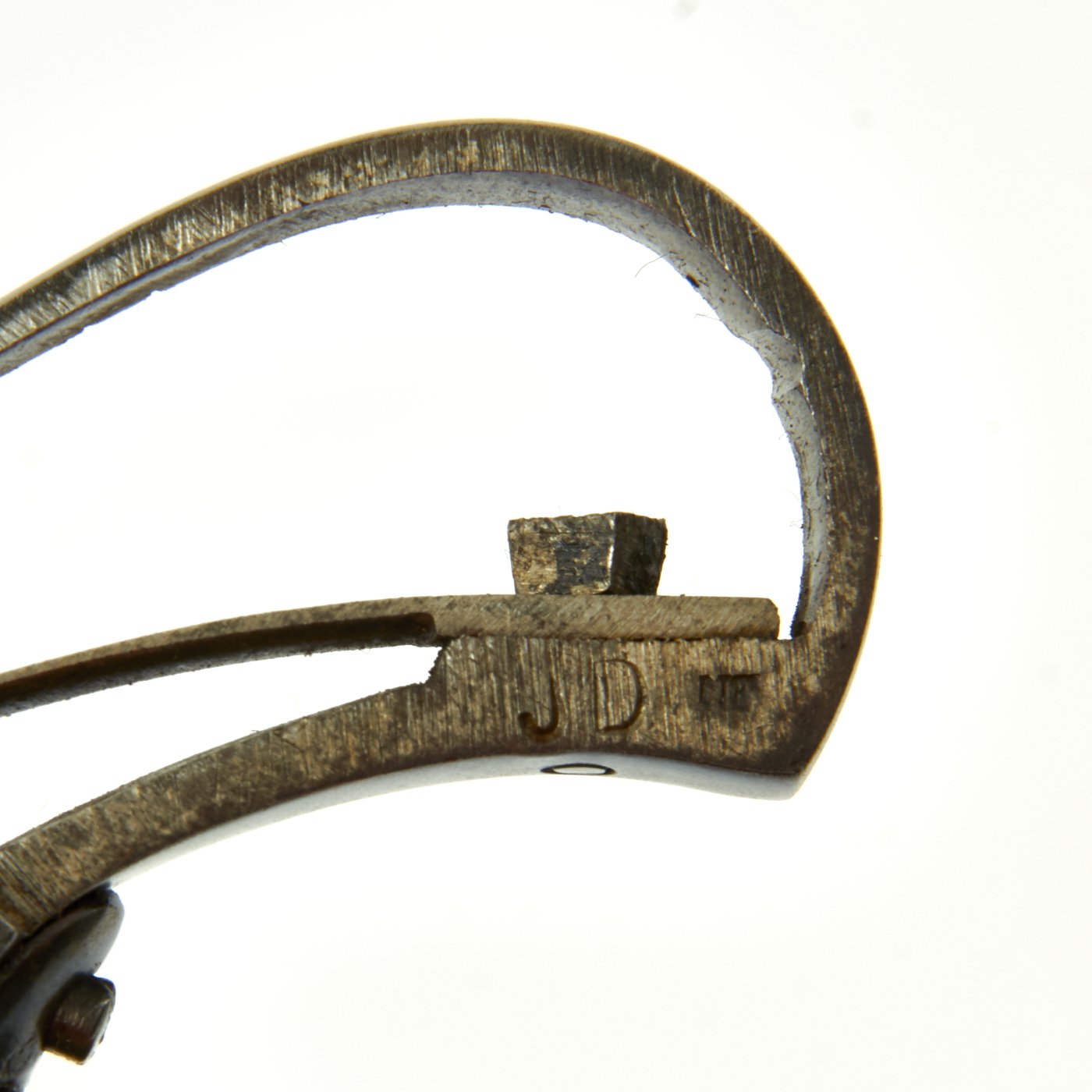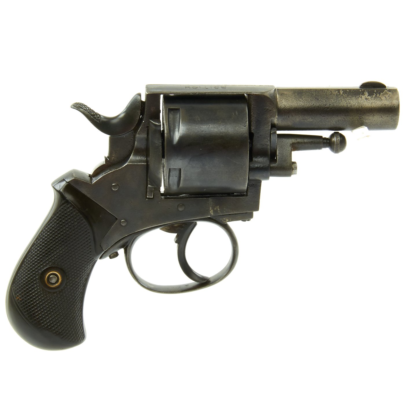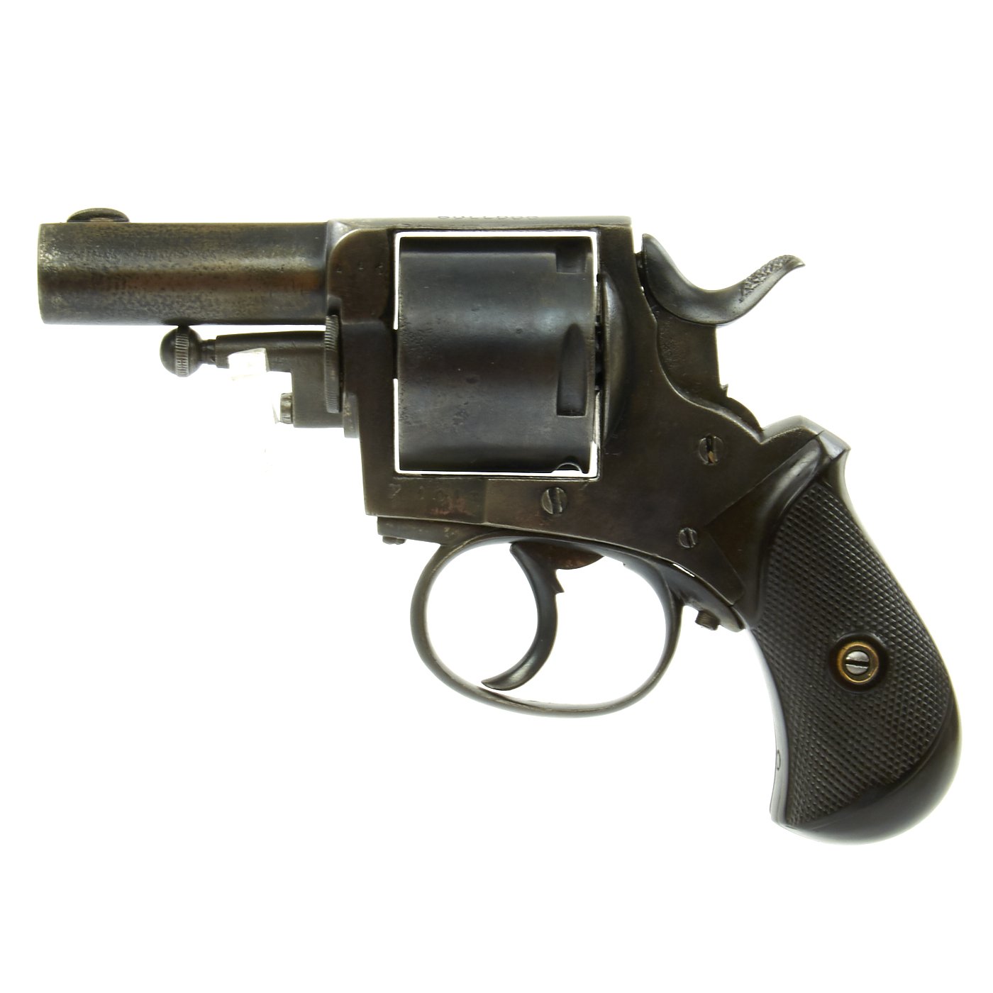 The top strap over the cylinder is stamped BRITISH / BULLDOG, with the frame marked with serial number X 1013. The Cylinder and frame bear Belgian Proof marks, including E / LG / * in an oval, indicating production in the city of Liège for the British Market. The city was a powerhouse of arms production, taking in many government contracts, as well as contracts to private arms companies. The frame by the barrel is marked 450, indicating chambering in the very large .450 Adams / .450 Boxer Mk I cartridge. It was probably also designed to accommodate other similar black powder cartridges.