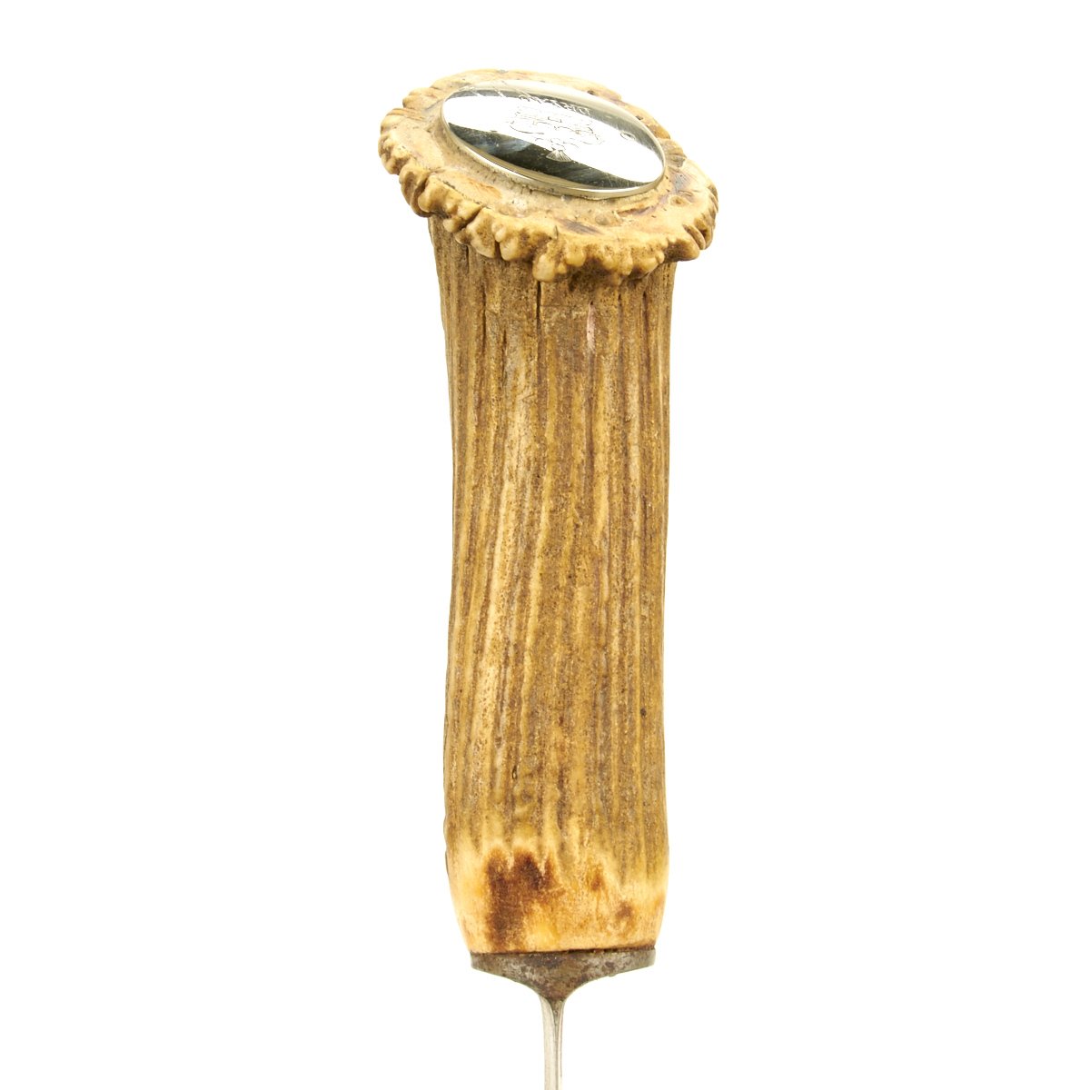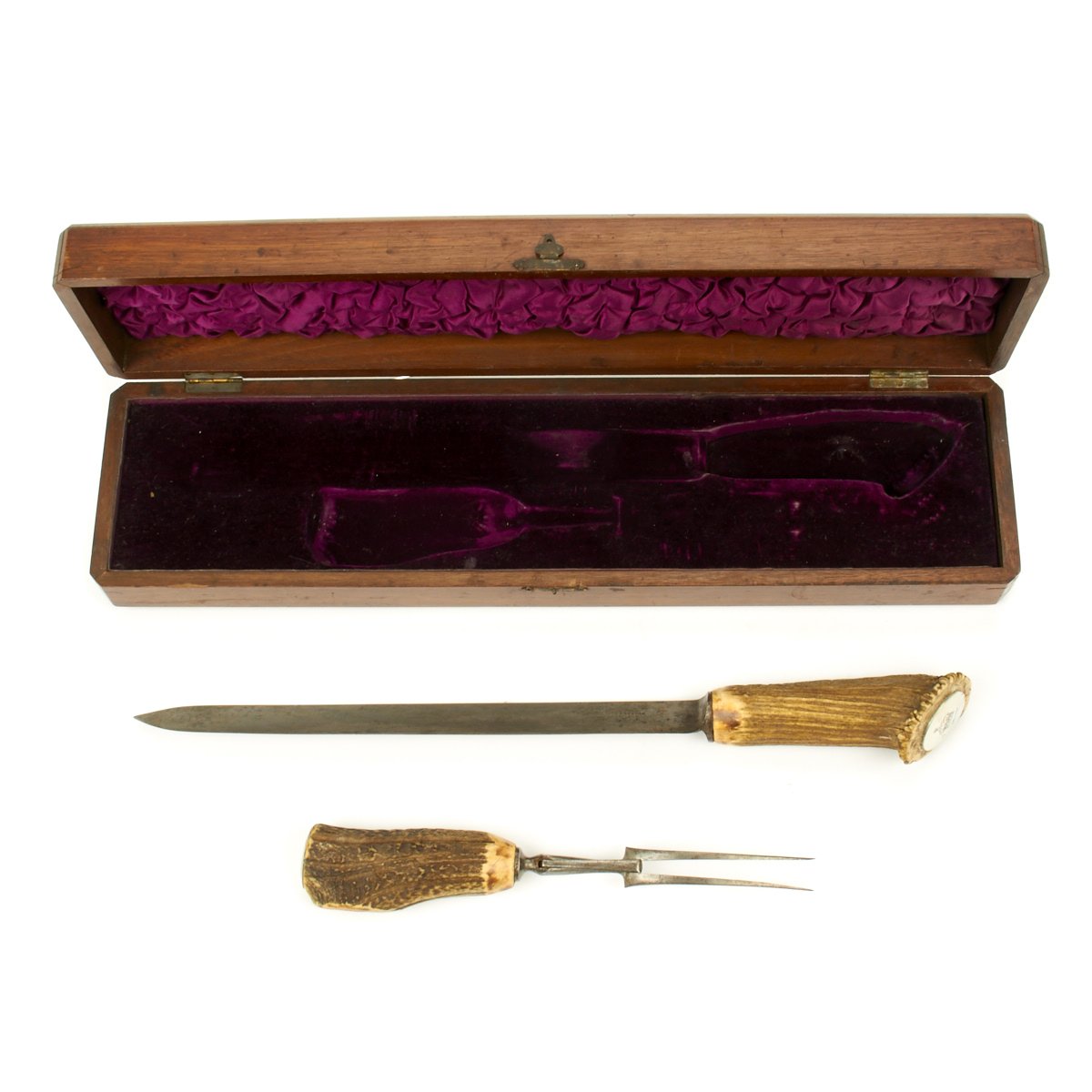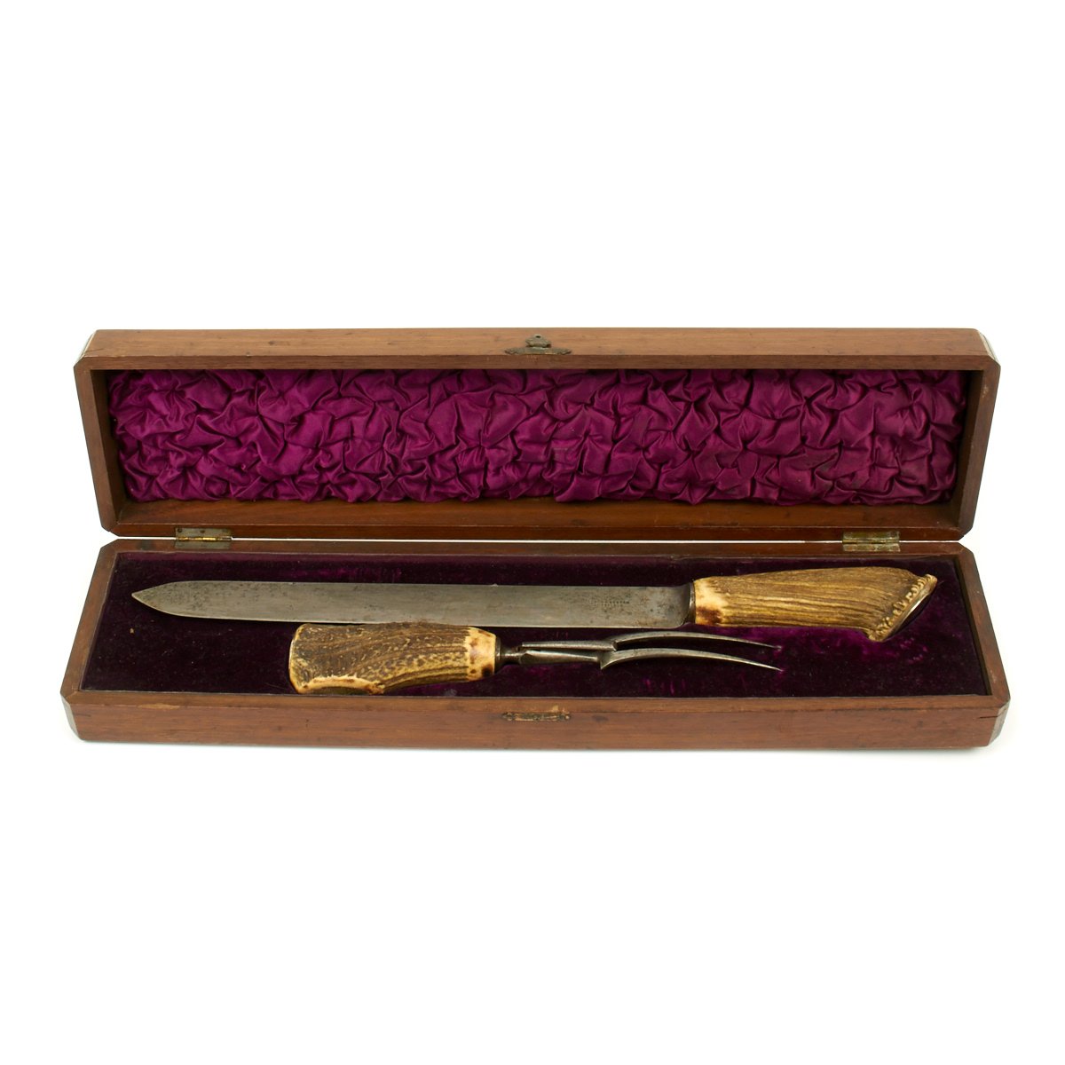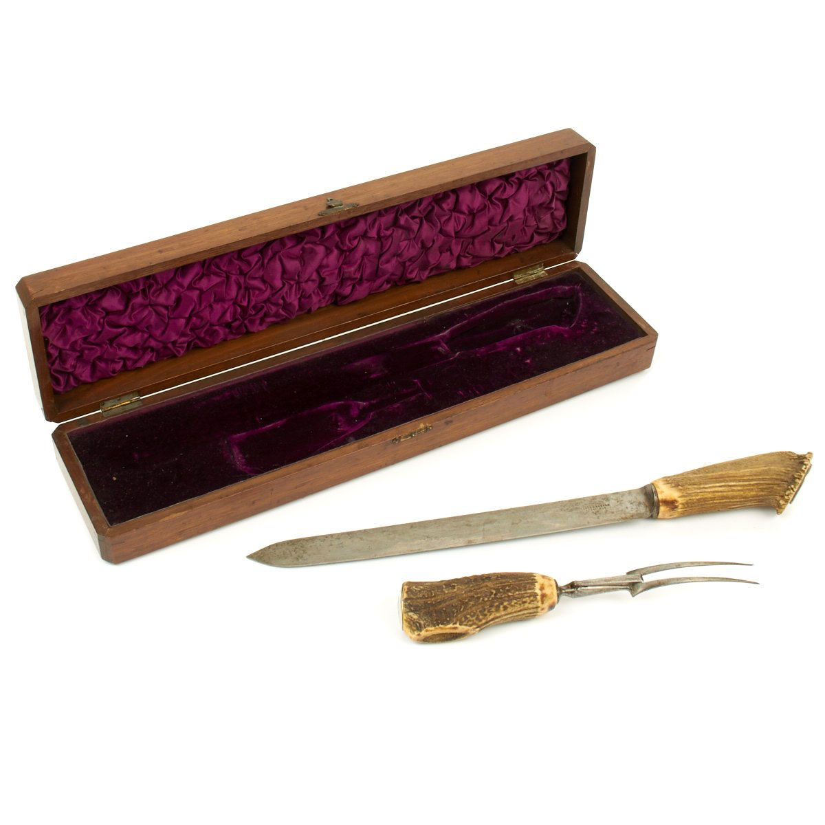 Original Items: One of a Kind. This is just about the largest Carving knife and fork set that we have ever encountered. They are truly MASSIVE. Beautifully presented in a in a Satin and Velvet lines wood case, each item is engraved on the Silver pommels with an Earl's CORONET over DRYAD. The handles are made from very large Antler horns, the knife blade alone measures a full 14", 21" with the handle. The fork is 12" long, with tines just over 4" in length, and a guard to prevent the knife from sliding up the fork. The quality wood case measures 22 1/2" long X 5 1/2" deep and over 3" tall. The fork has no maker marks, but the knife is marked with: