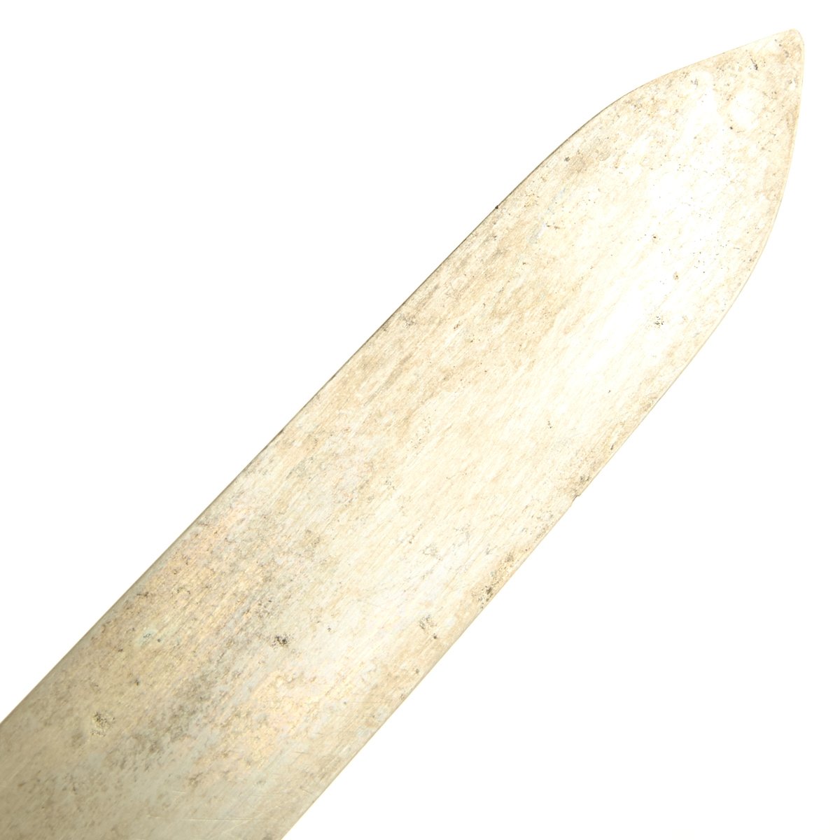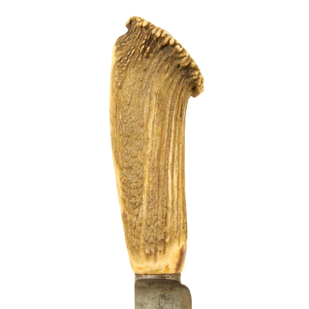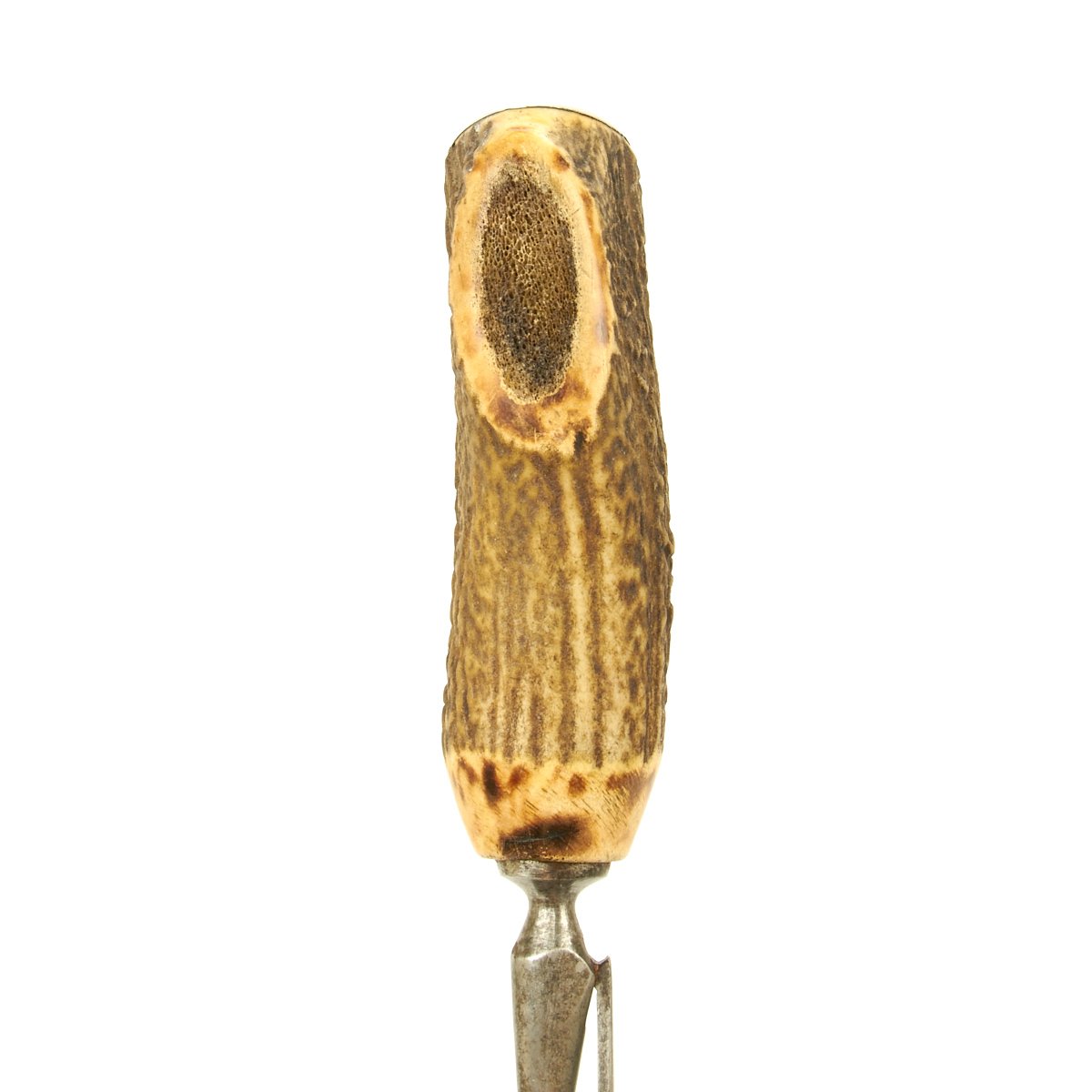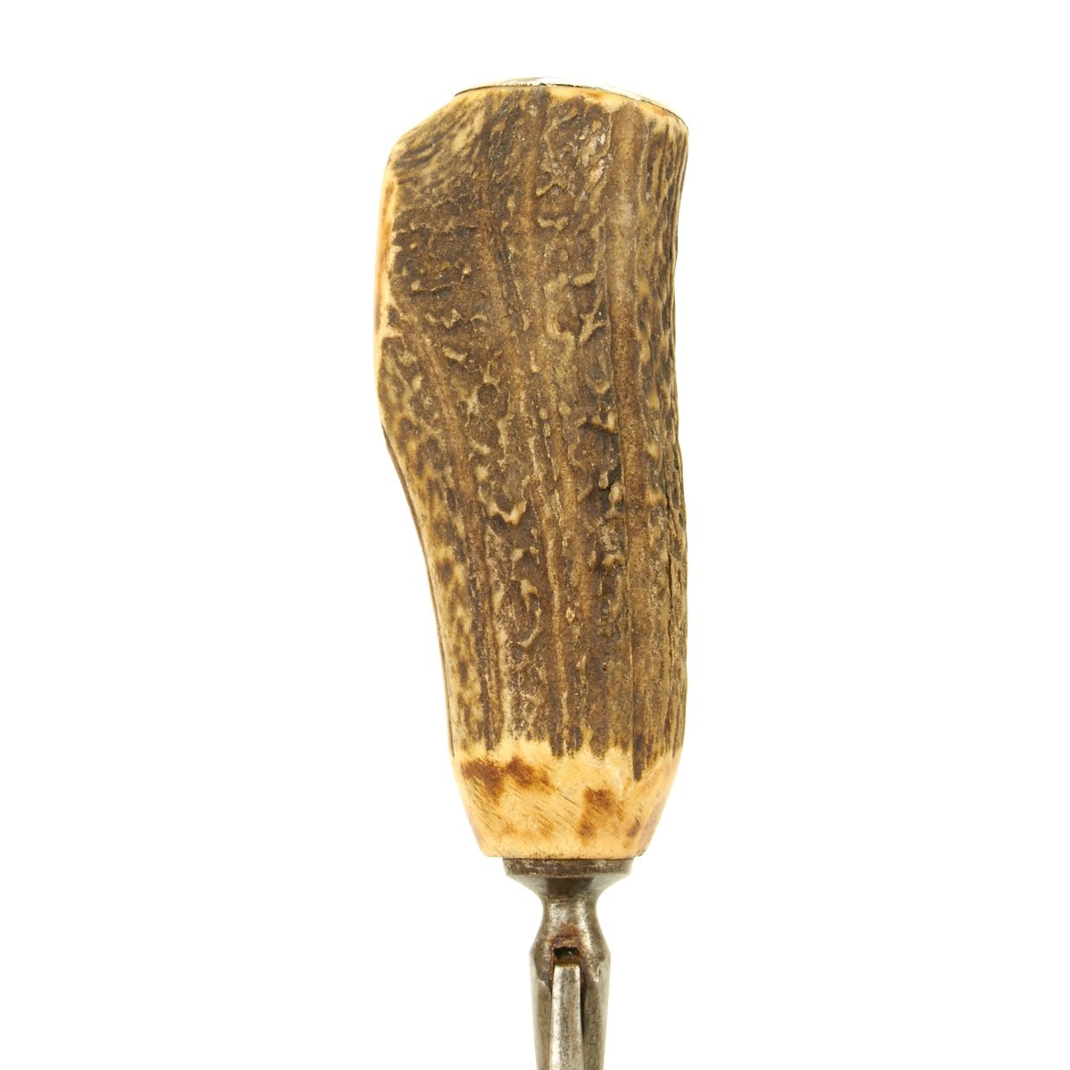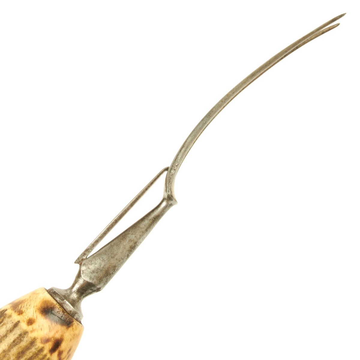 Original Items: One of a Kind. This is just about the largest Carving knife and fork set that we have ever encountered. They are truly MASSIVE. Beautifully presented in a in a Satin and Velvet lines wood case, each item is engraved on the Silver pommels with an Earl's CORONET over DRYAD. The handles are made from very large Antler horns, the knife blade alone measures a full 14", 21" with the handle. The fork is 12" long, with tines just over 4" in length, and a guard to prevent the knife from sliding up the fork. The quality wood case measures 22 1/2" long X 5 1/2" deep and over 3" tall. The fork has no maker marks, but the knife is marked with: