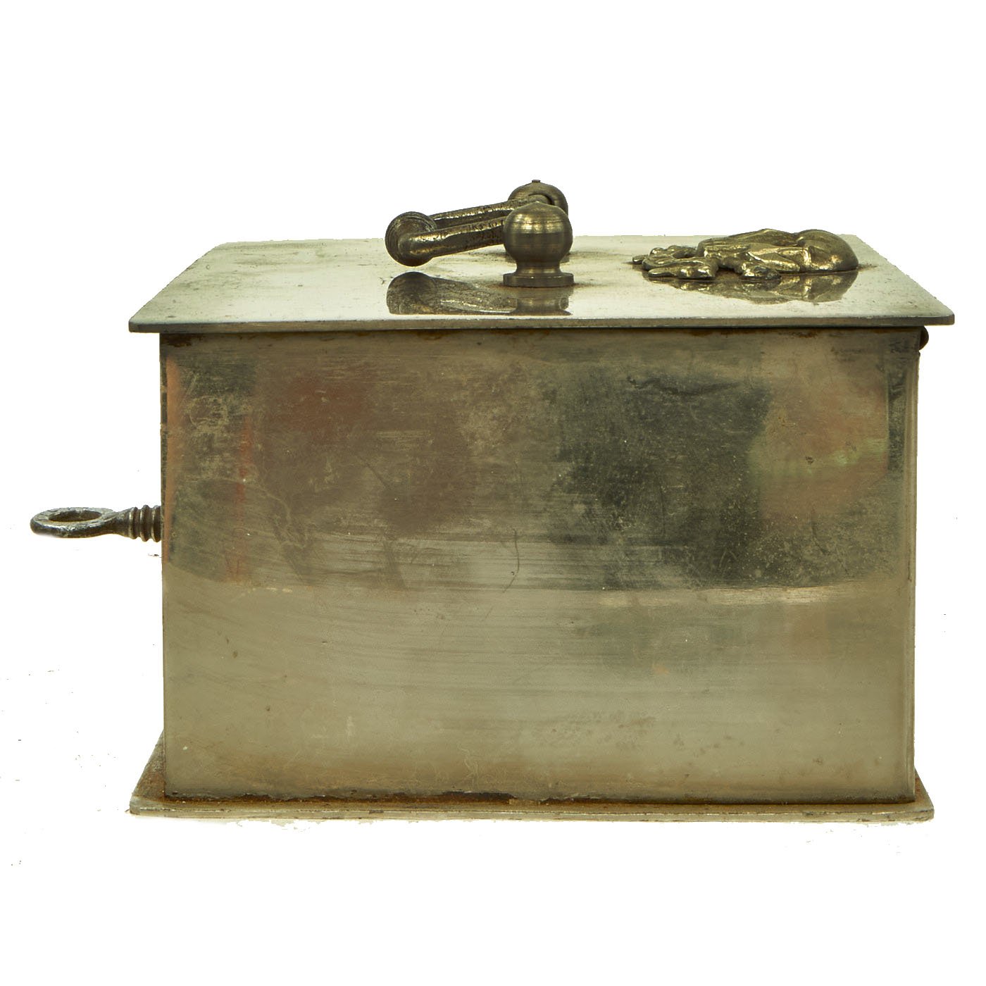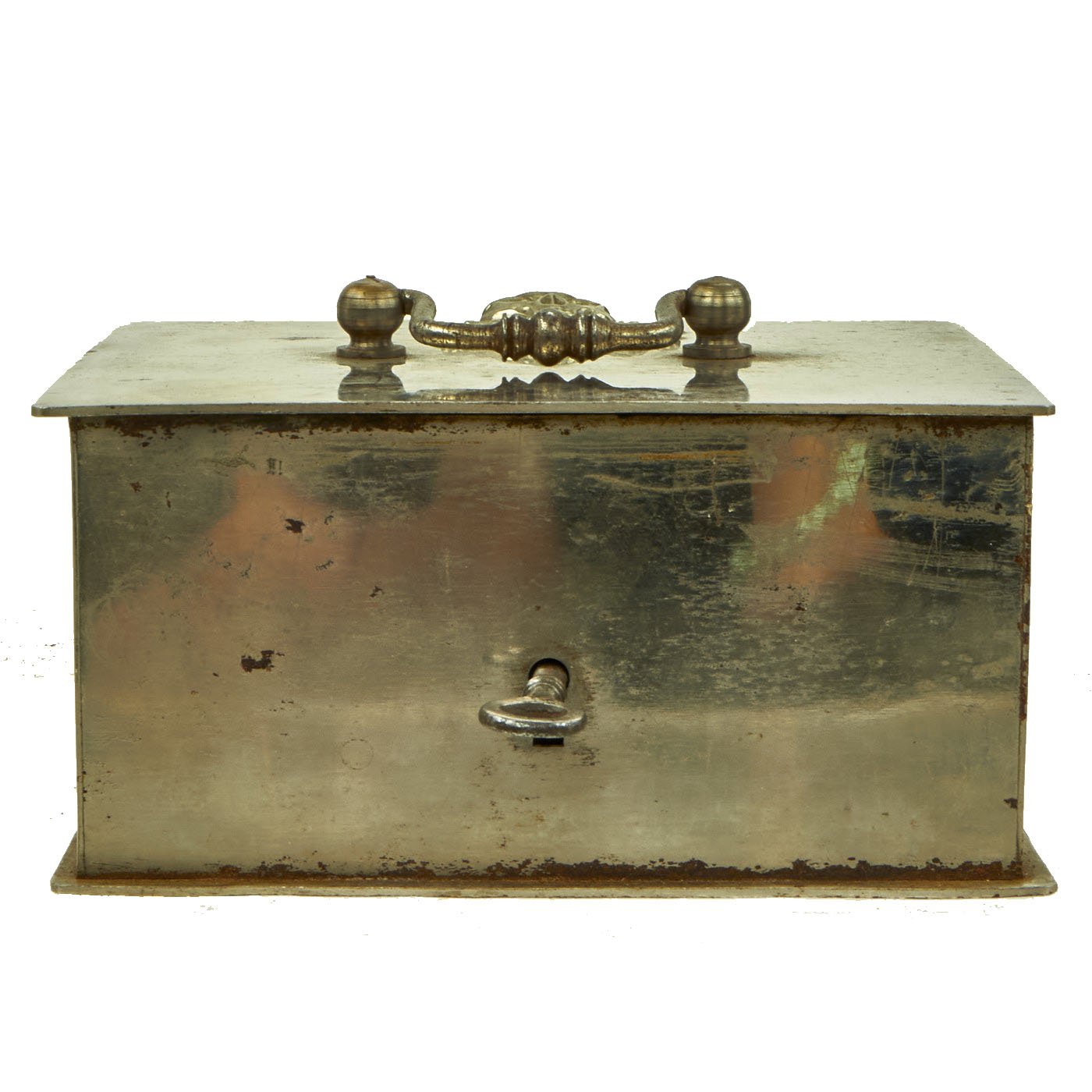 Original Item: One of a Kind. Here we have a very fine Victorian Era officer's mess cash box with key, marked to the 17th Lancers Regiment. The box is of all steel construction, with old nickel plating, still very well retained. It has a handle on the top lid, and above this is a large "Skull and Crossed Bones over Glory" device, the regimental insignia of the 17th Lancers, whose motto was "Death or Glory".