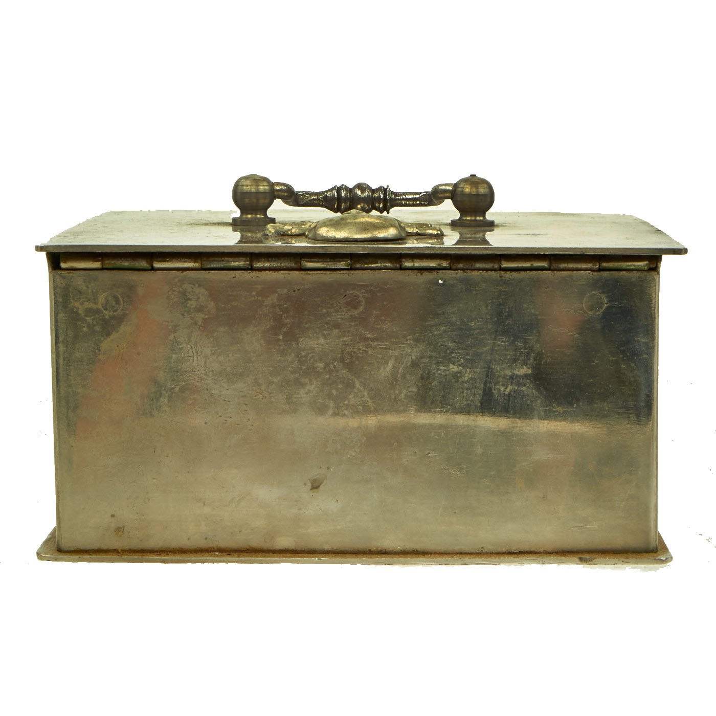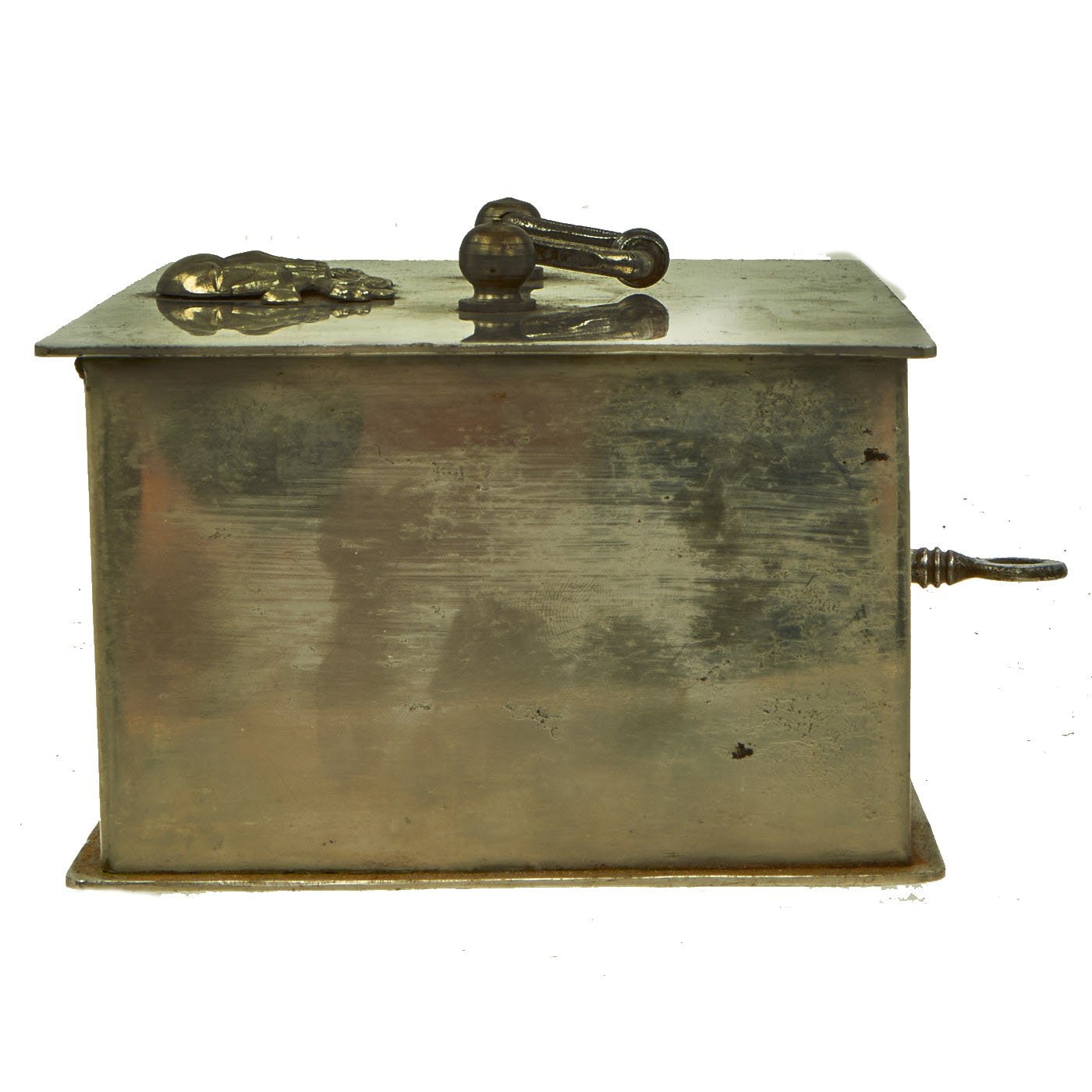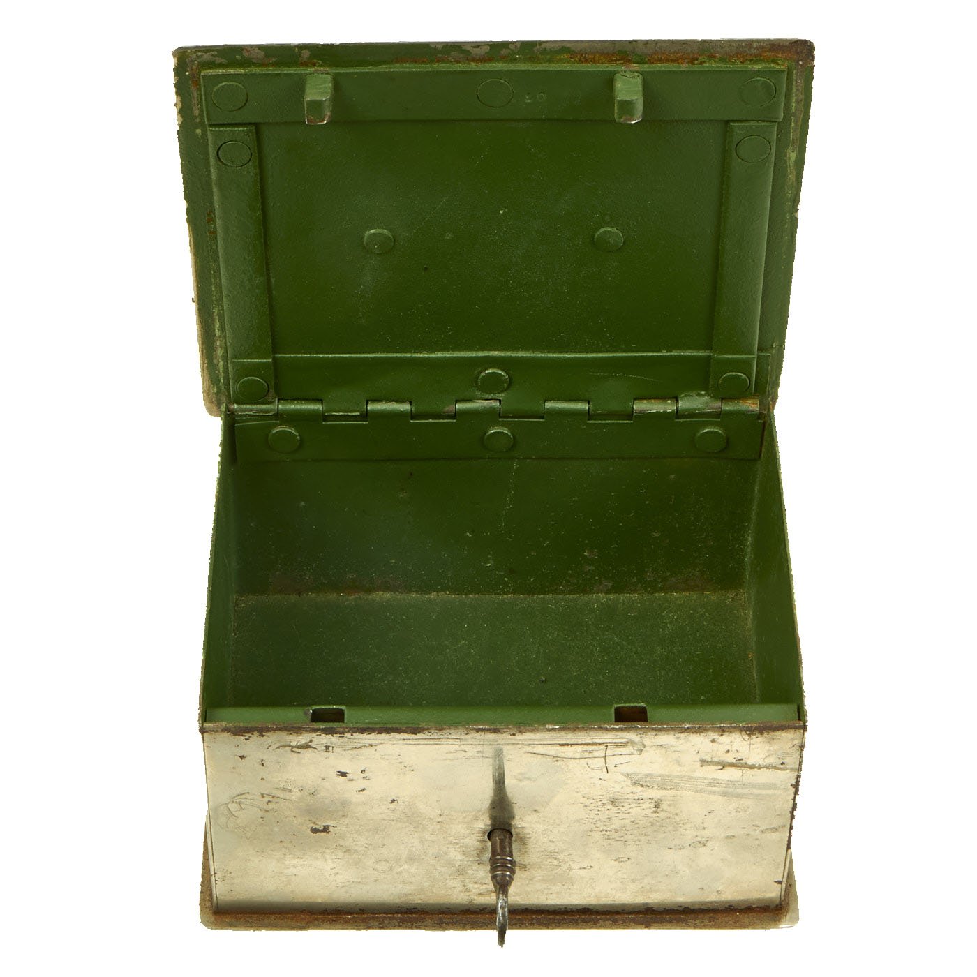 This most appealing cash box measures 6 1/2" wide x 5" deep x 3 1/4" tall. Unfortunately now empty but in truth mostly ever contained officer's I.O.U.'s for their mess bills.