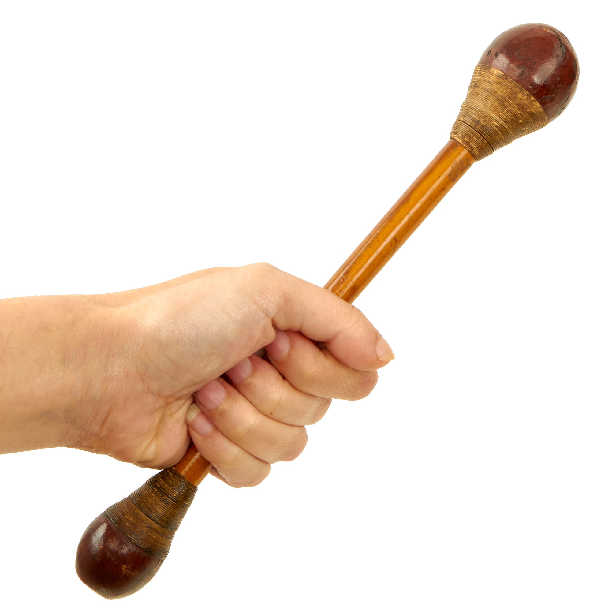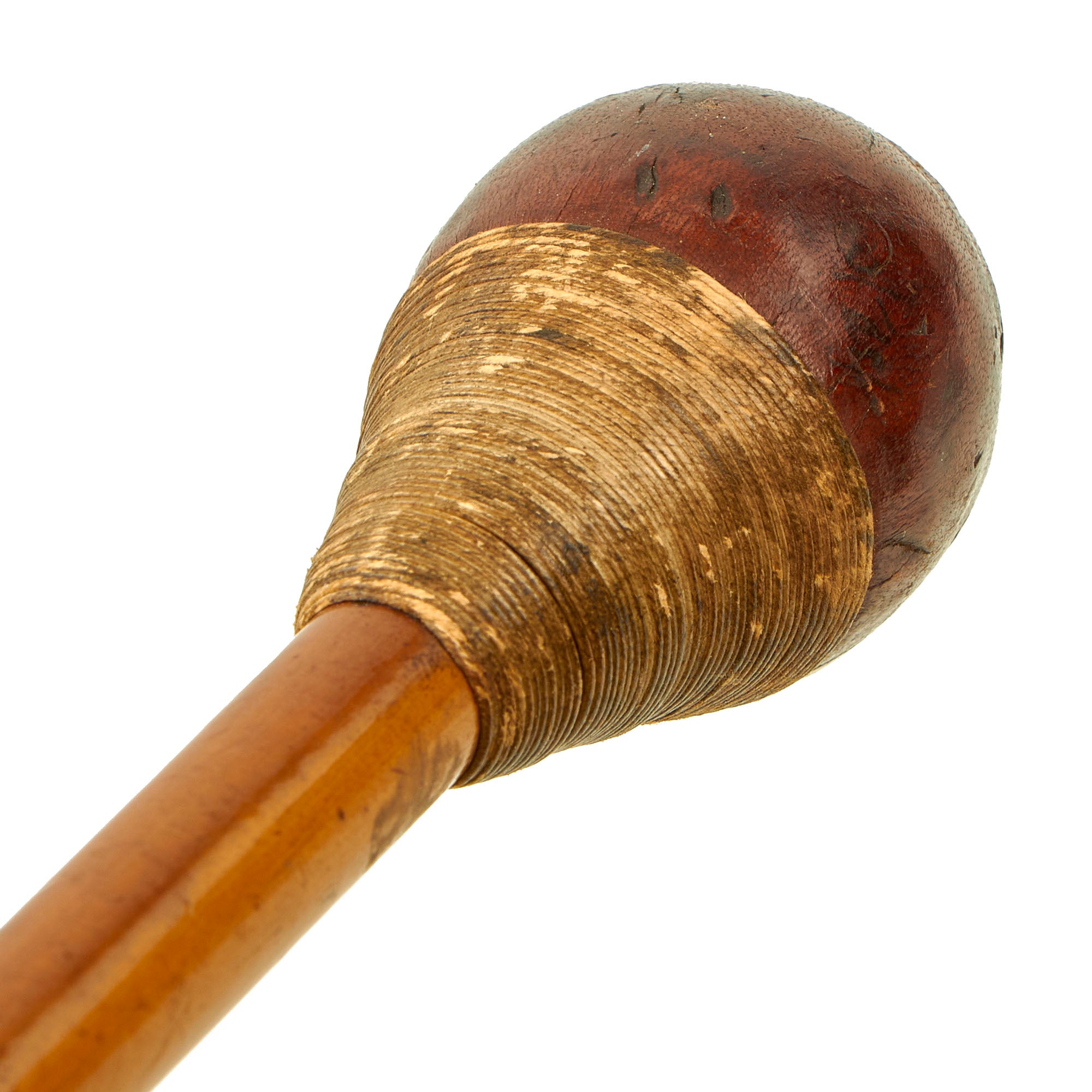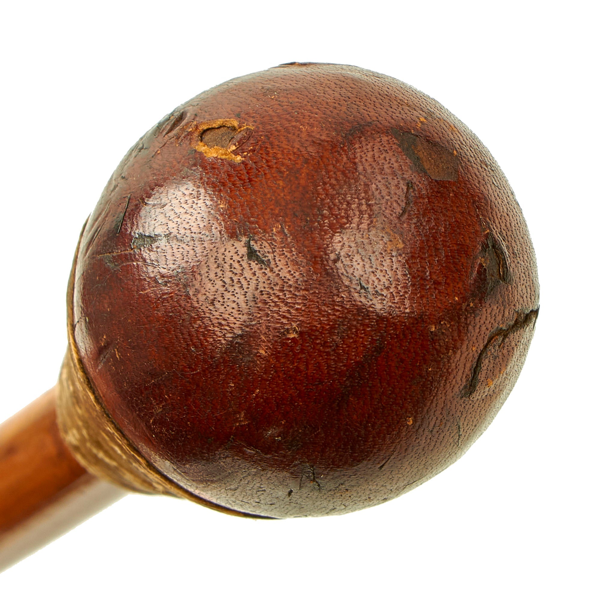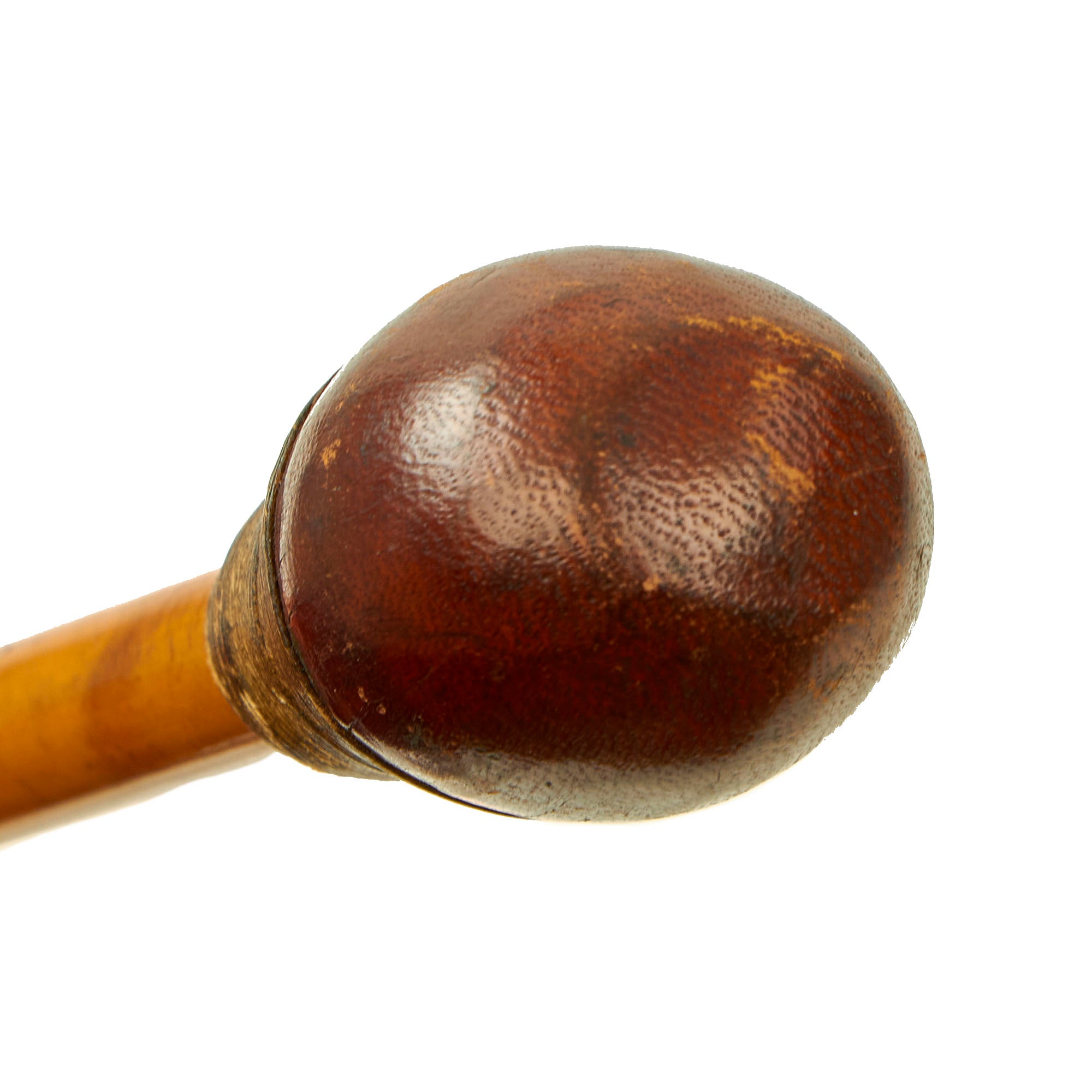 This small cudgel, truncheon, or club is a finely manufactured example with doubled heads. Deigned to be concealed in a pocket it measures only 10 inches in overall length and features two leather wrapped lead cast heads, with bamboo haft. The small size was perfect for an officer to carry in his uniform pocket or for a gentleman walking the dark streets of London. The top of the club is marked on a brass disk: