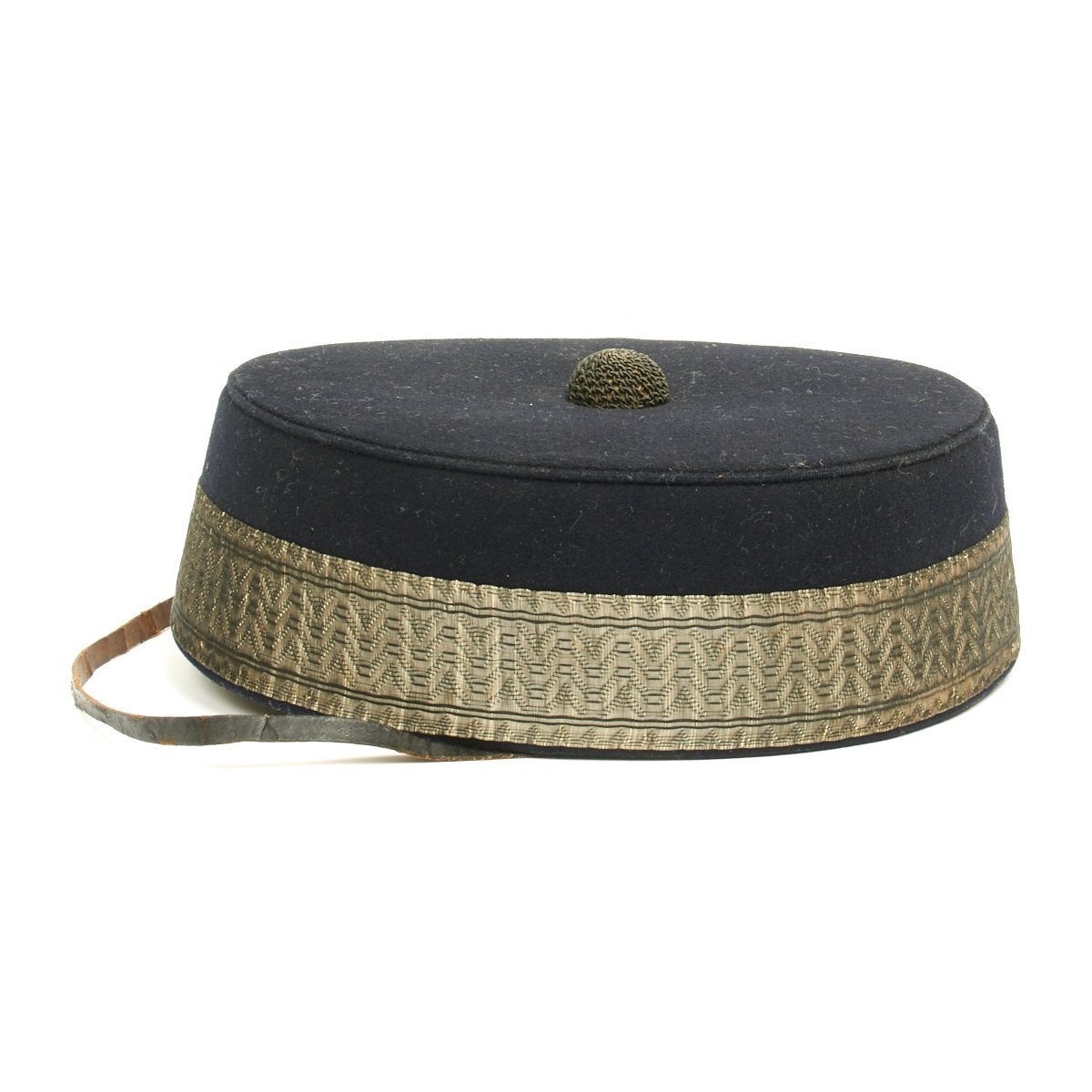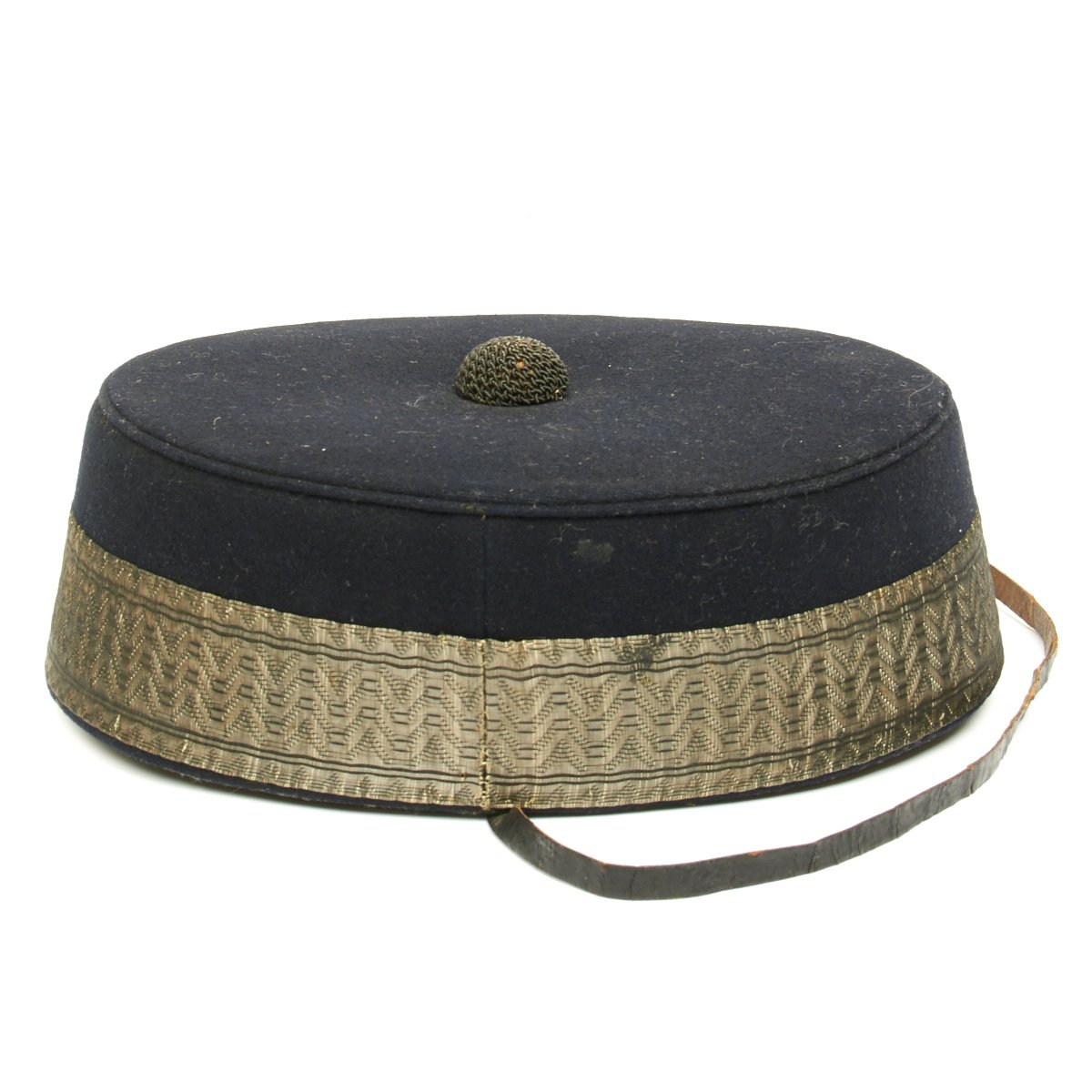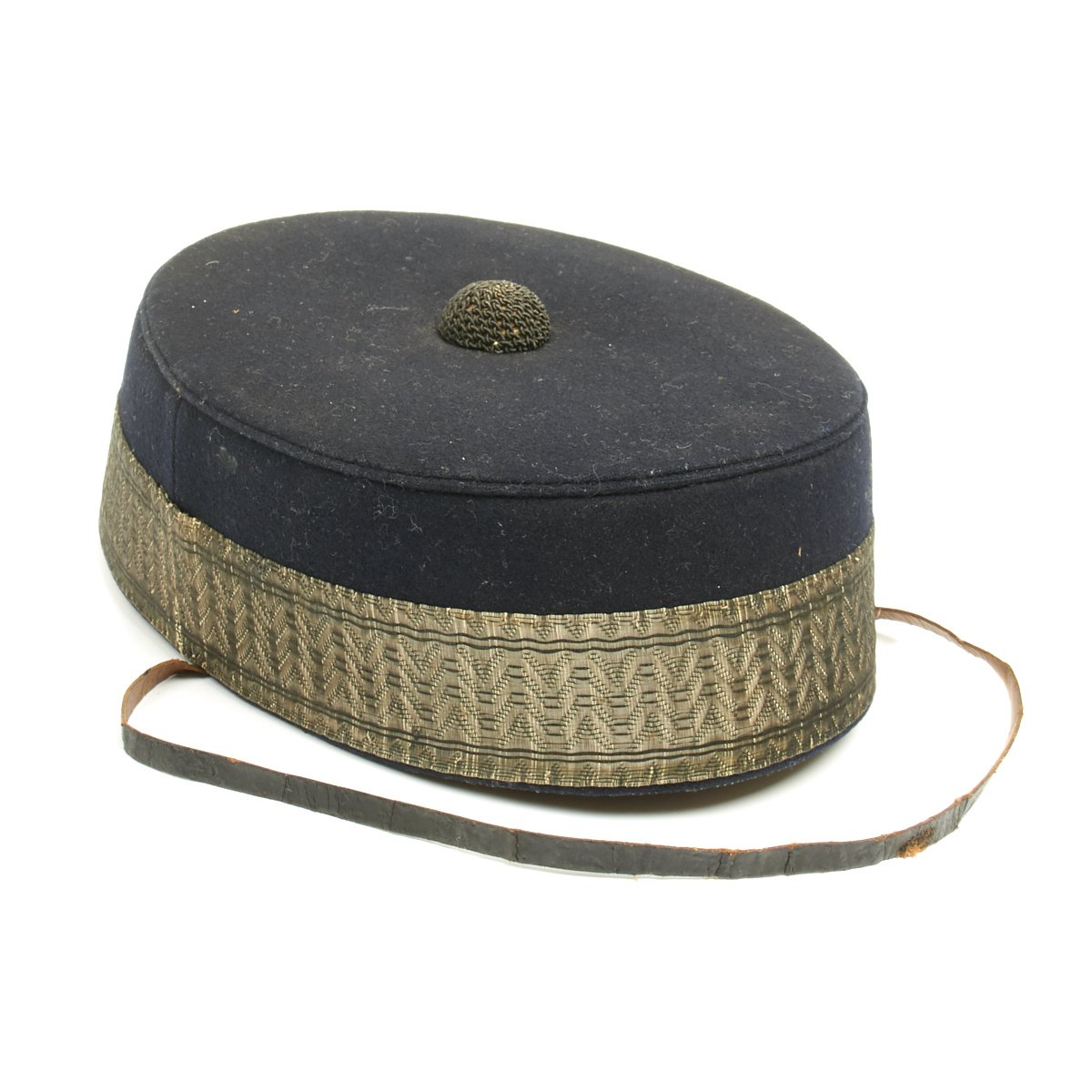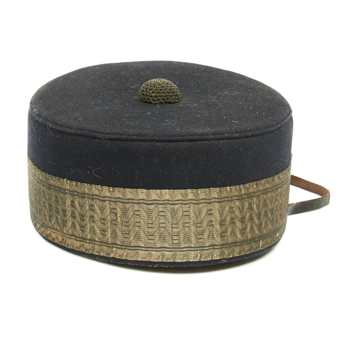 This is an Other Ranks hat dating somewhere from 1800 to 1900. Beautifully constructed of navy blue Melton cloth and handsomely decorated with embroidered dome cap and gilt tape border.