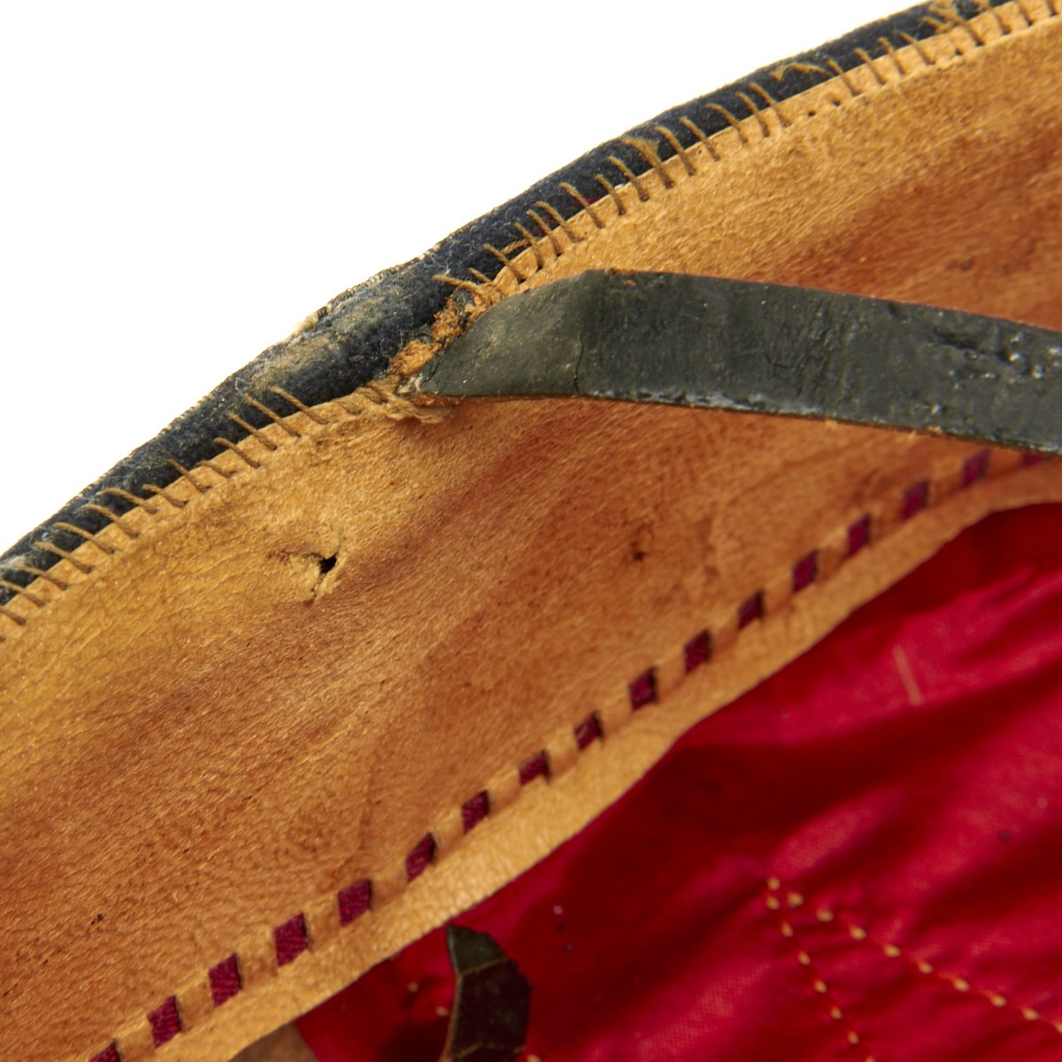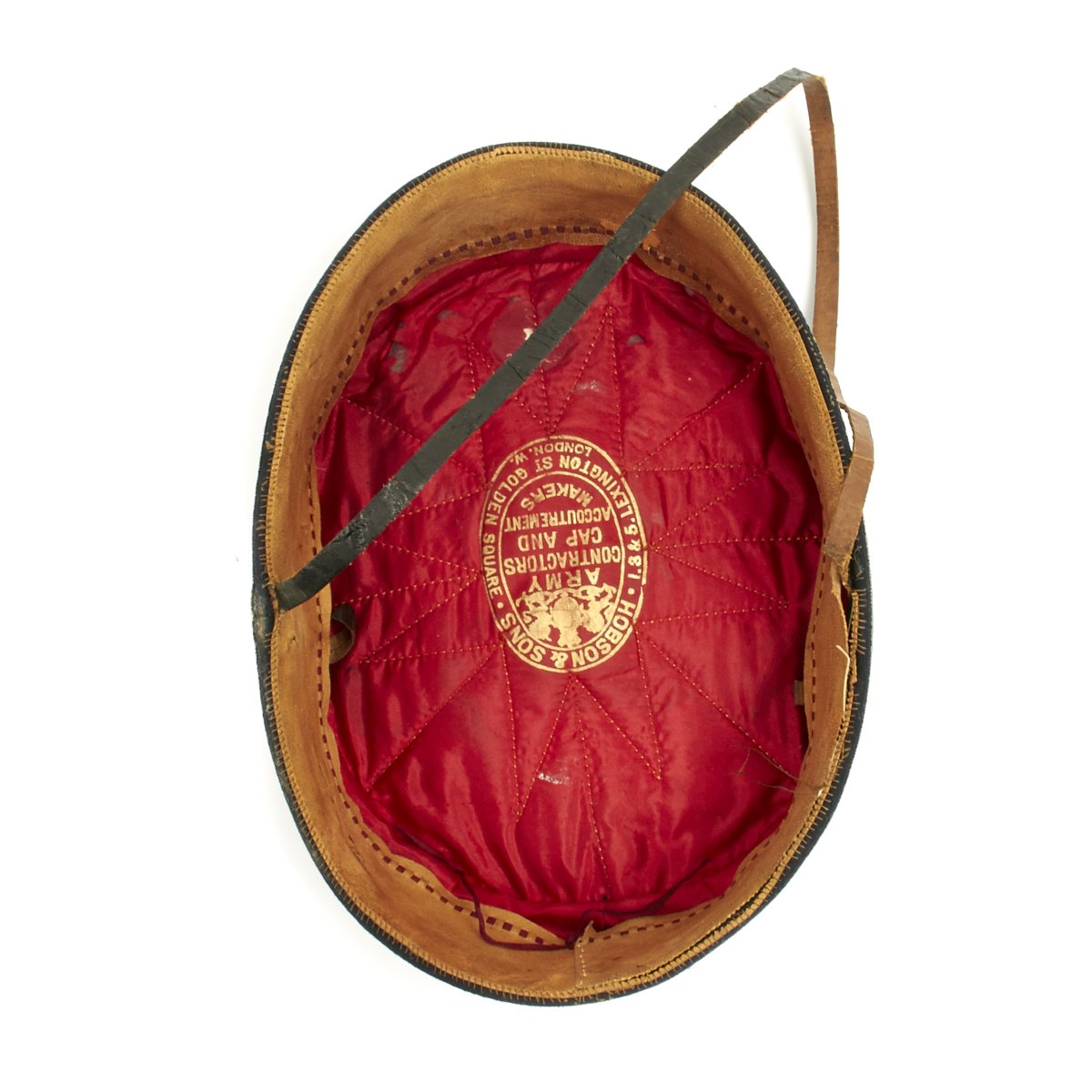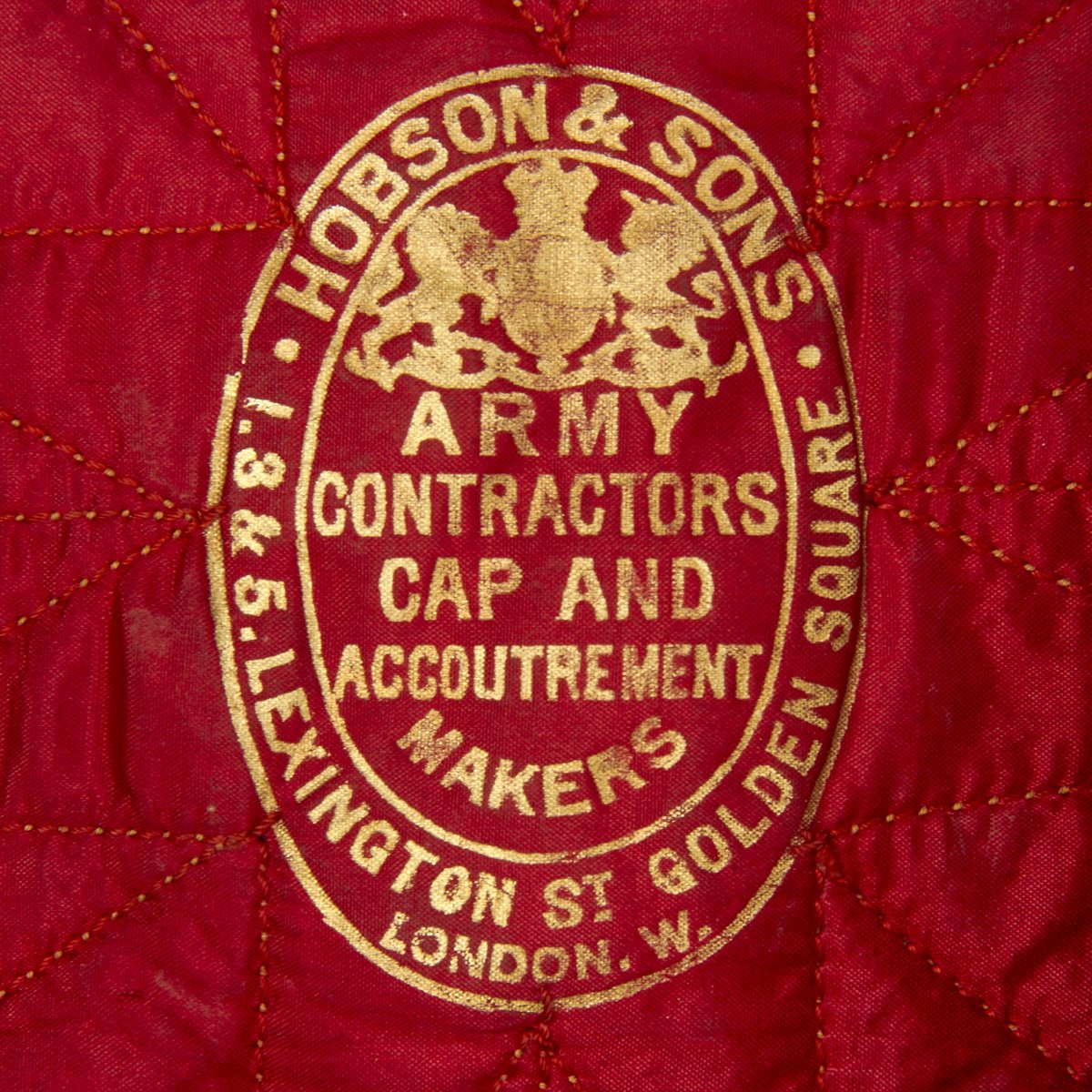 Leather head band remains as does the interior rich red silk lining. The lining is nicely gold embossed HOBSON & SONS, ARMY CONTRACTORS CAP AND ACCOUTREMENT MAKERS, 1.3. & 5. Lexington St. Golden Square London W.