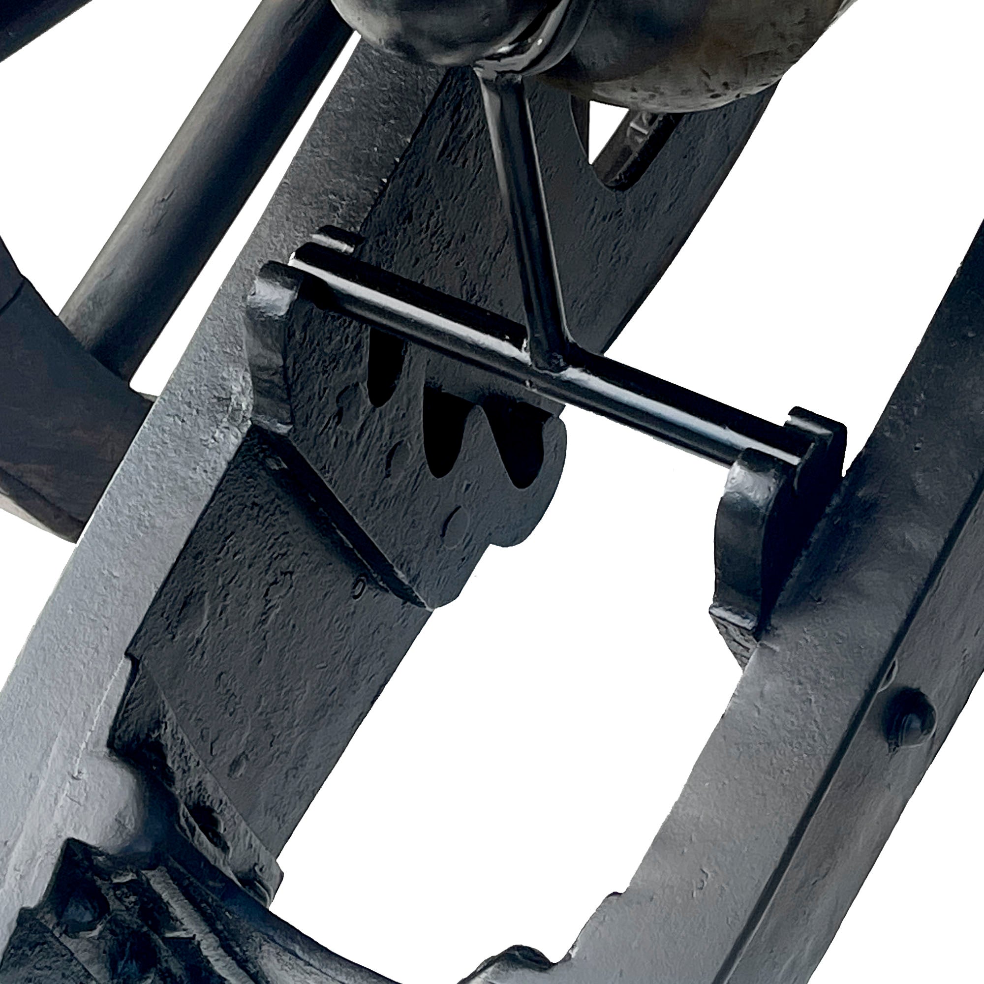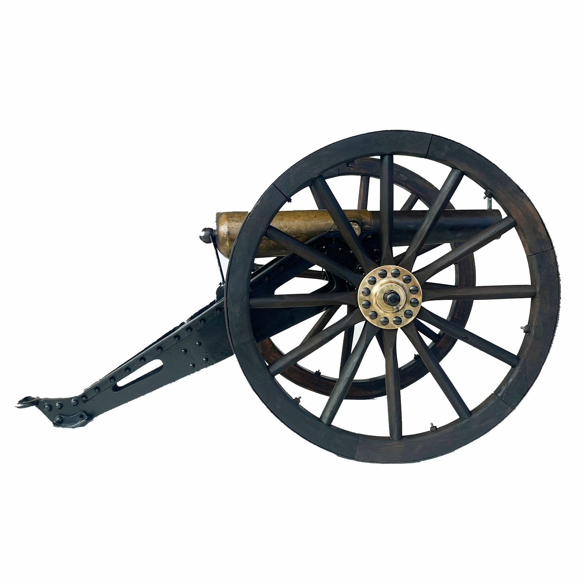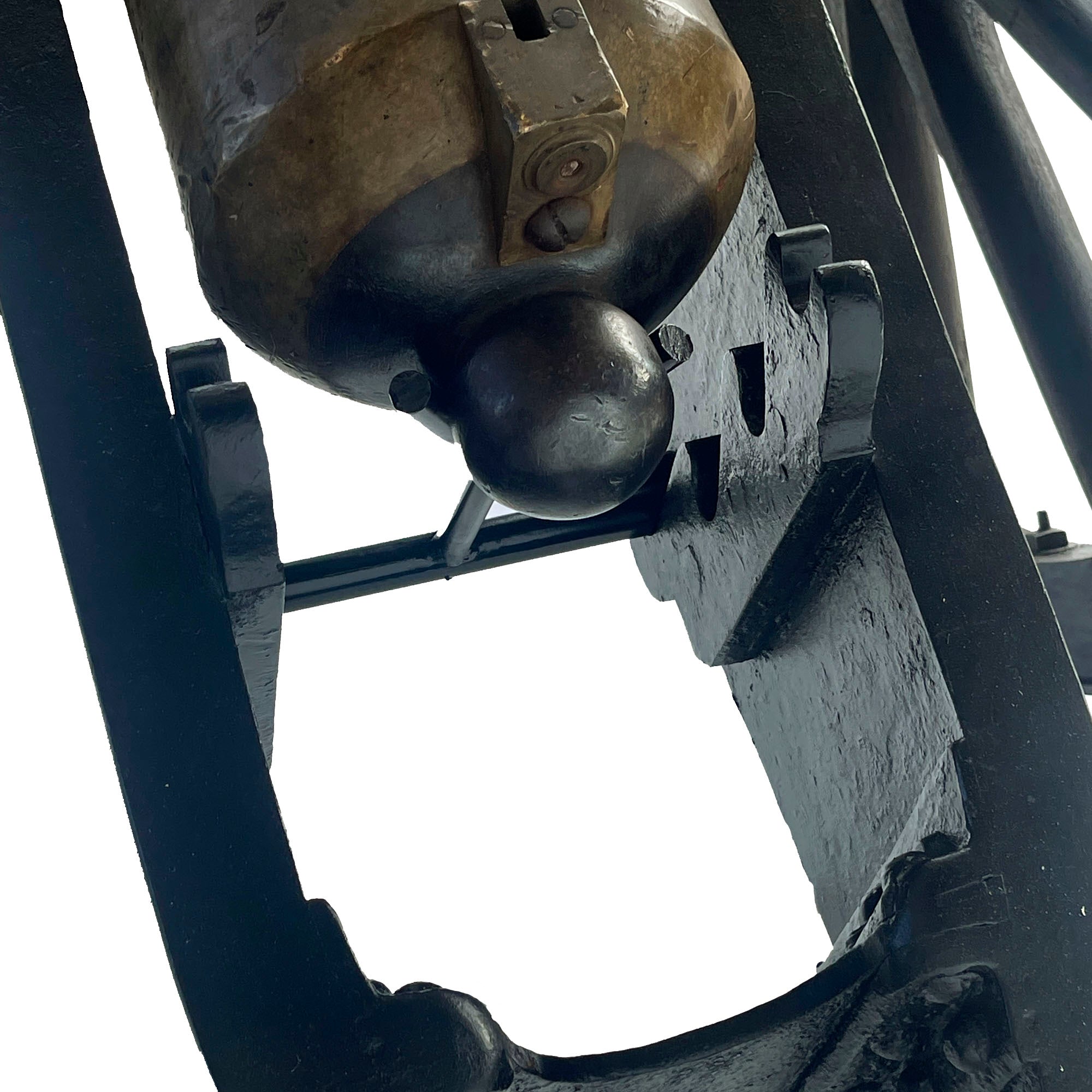 The tube or barrel is unmarked, with the exception of Negari symbol and measures 36" inches to the back to the barrel and 41" to the back of the cascabel. With tapering steel barrel and bronze two stage barrel, mounted for sights with a removable replacement front sight and rifled with three deep grooves, the breech has no traces of original British markings. Knob-shaped bronze cascabel, with bronze sturdy trunnions. Fully restored totally original riveted iron cut-out carriage without new made elevation mechanism, one side with applied brass plaque stamped:
