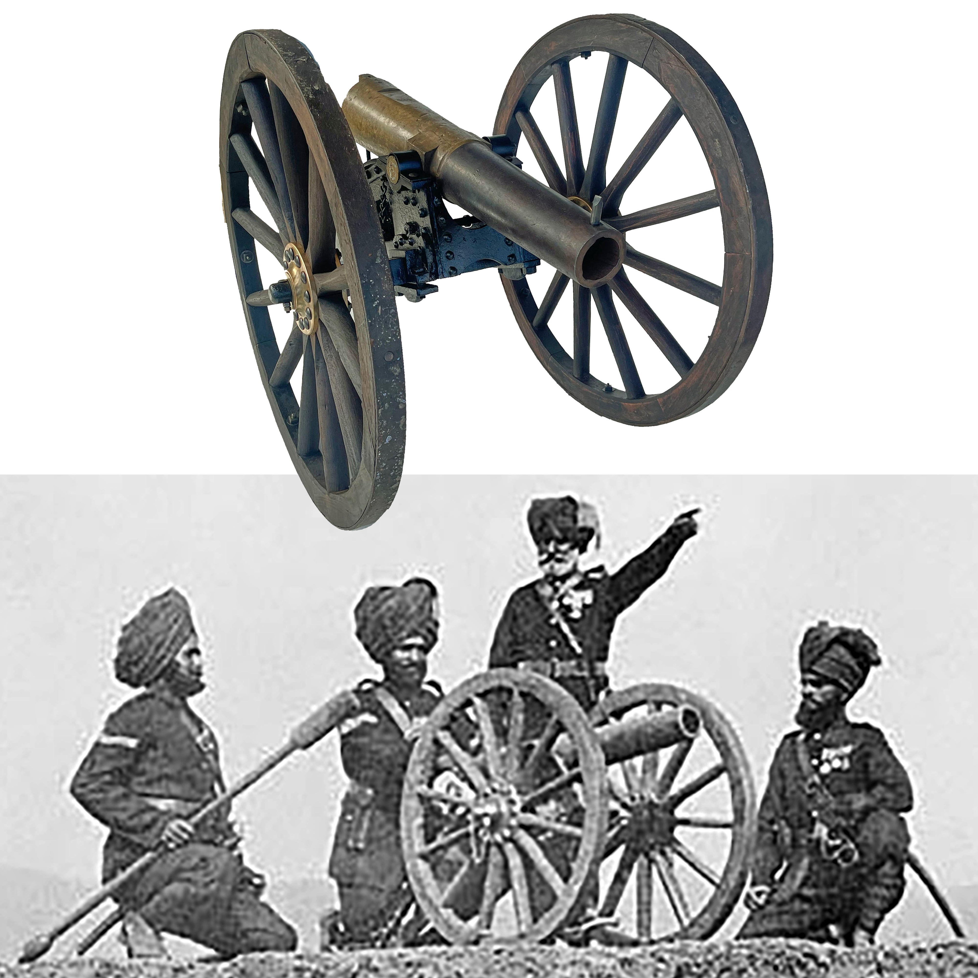 Original Item: Only One available. This is a stunning example of a later 19th century mountain cannon used by colonial British troops in India officially called The Ordnance RML (Rifled Muzzle Loading) 7-pounder Mk IV "Steel Gun" rifled muzzle loading mountain gun. 7-pounder referred to the approximate weight of the shell it fired.