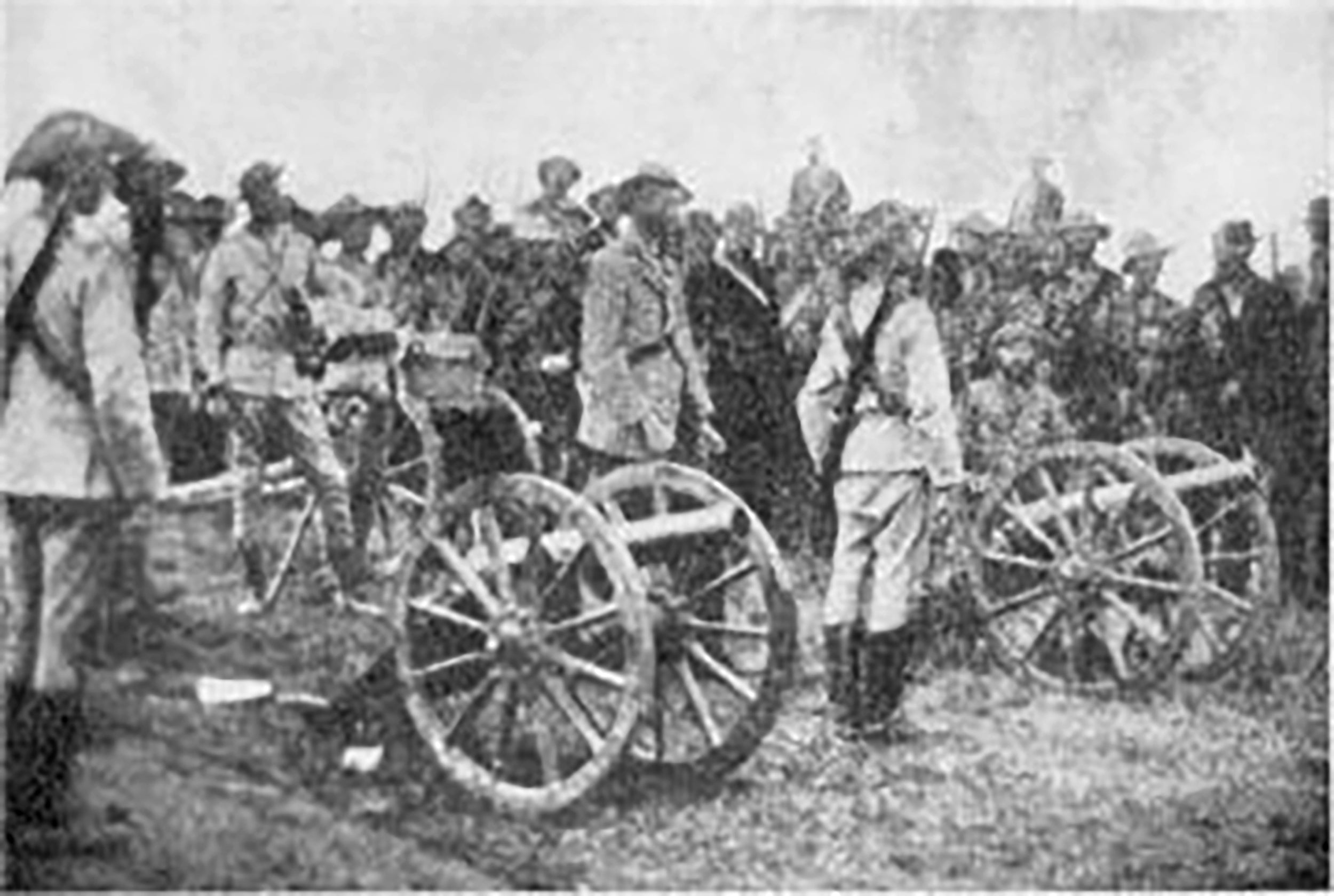 Boers with guns on mountain carriages captured at Kraaipan at the beginning of the war