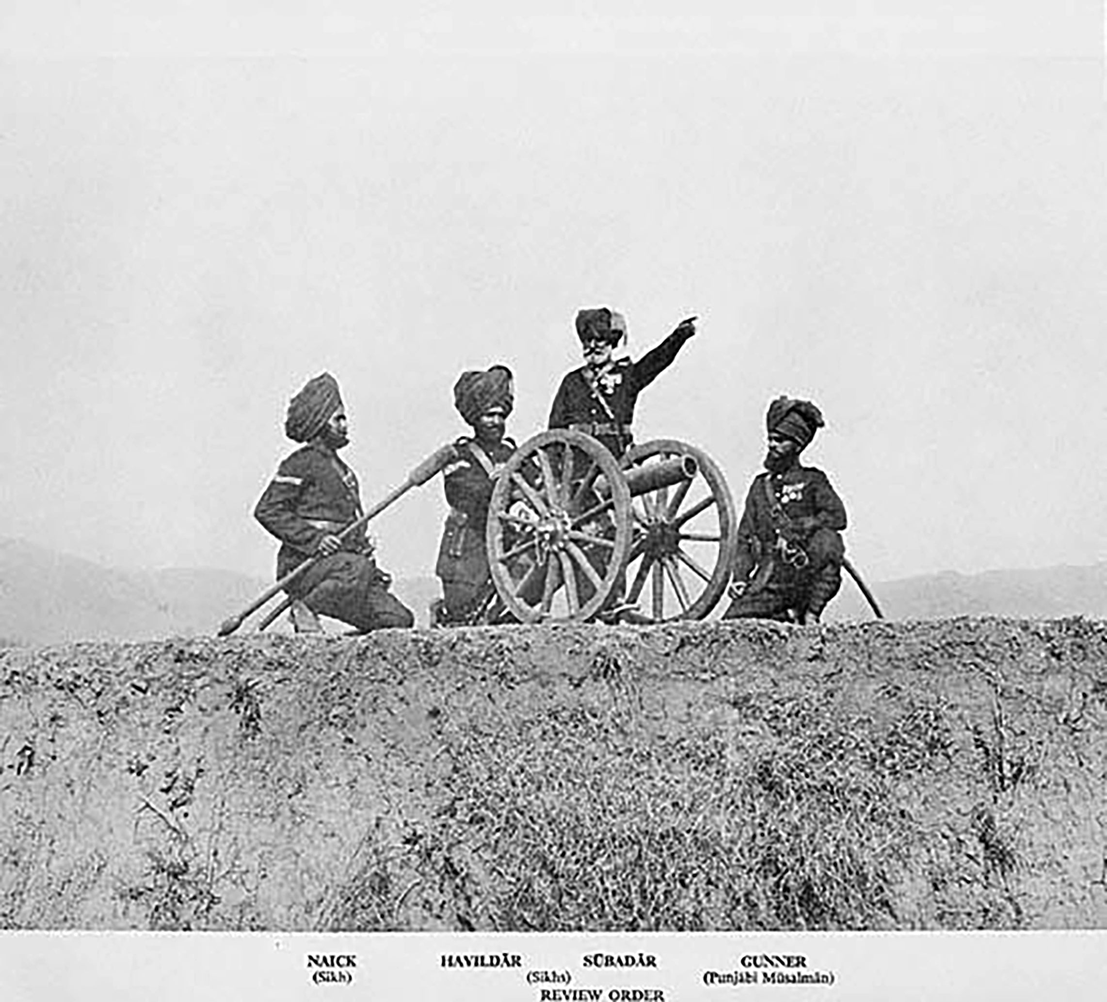 Titled "Dignity & Impudence" for stereotypic personality traits of elephants and mules respectively, this photograph by John Burke (photographer) shows an elephant and mule battery during the Second Anglo-Afghan War. The mule team would have hauled supplies or towed the small field gun, while the elephants towed the larger gun. The gun appears to be a Rifled Muzzle Loader (RML) 7-pounder mountain gun. The men in the photograph are a mix of British soldiers and Indian sepoys. The group kneeling around the smaller, muzzle-loaded field gun is preparing to fire after the soldier at front left has used the ramrod to jam the charge down into the gun. The gun at right, towed by elephants, appears to be a Rifled breech loader (RBL) 40-pounder Armstrong (RBL 40-pounder Armstrong gun)