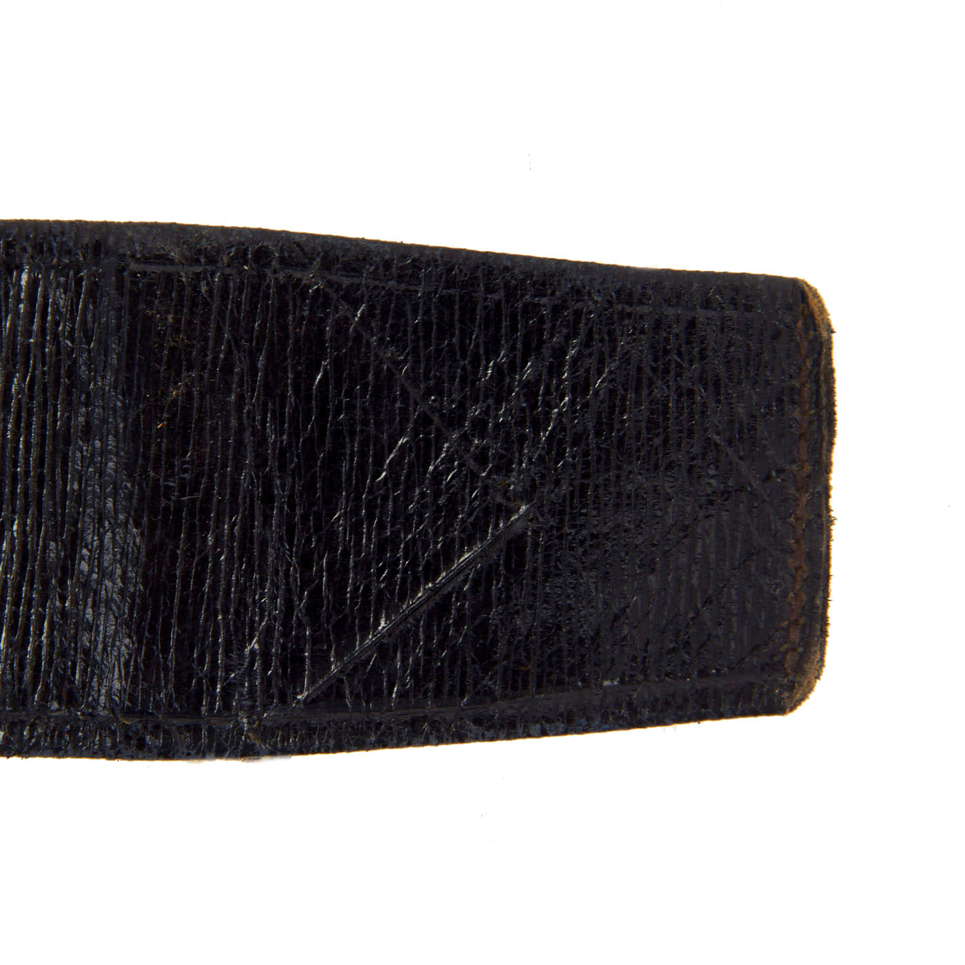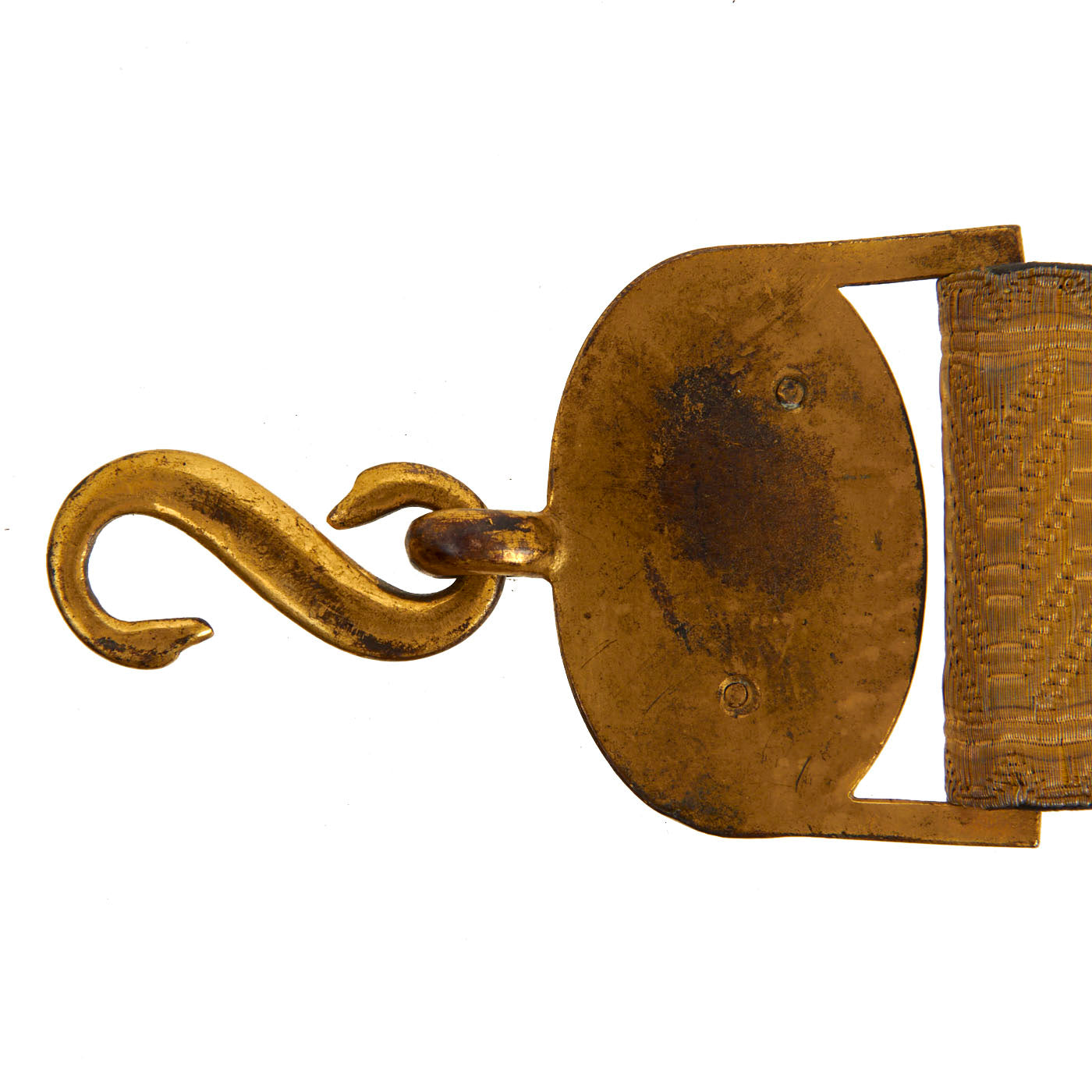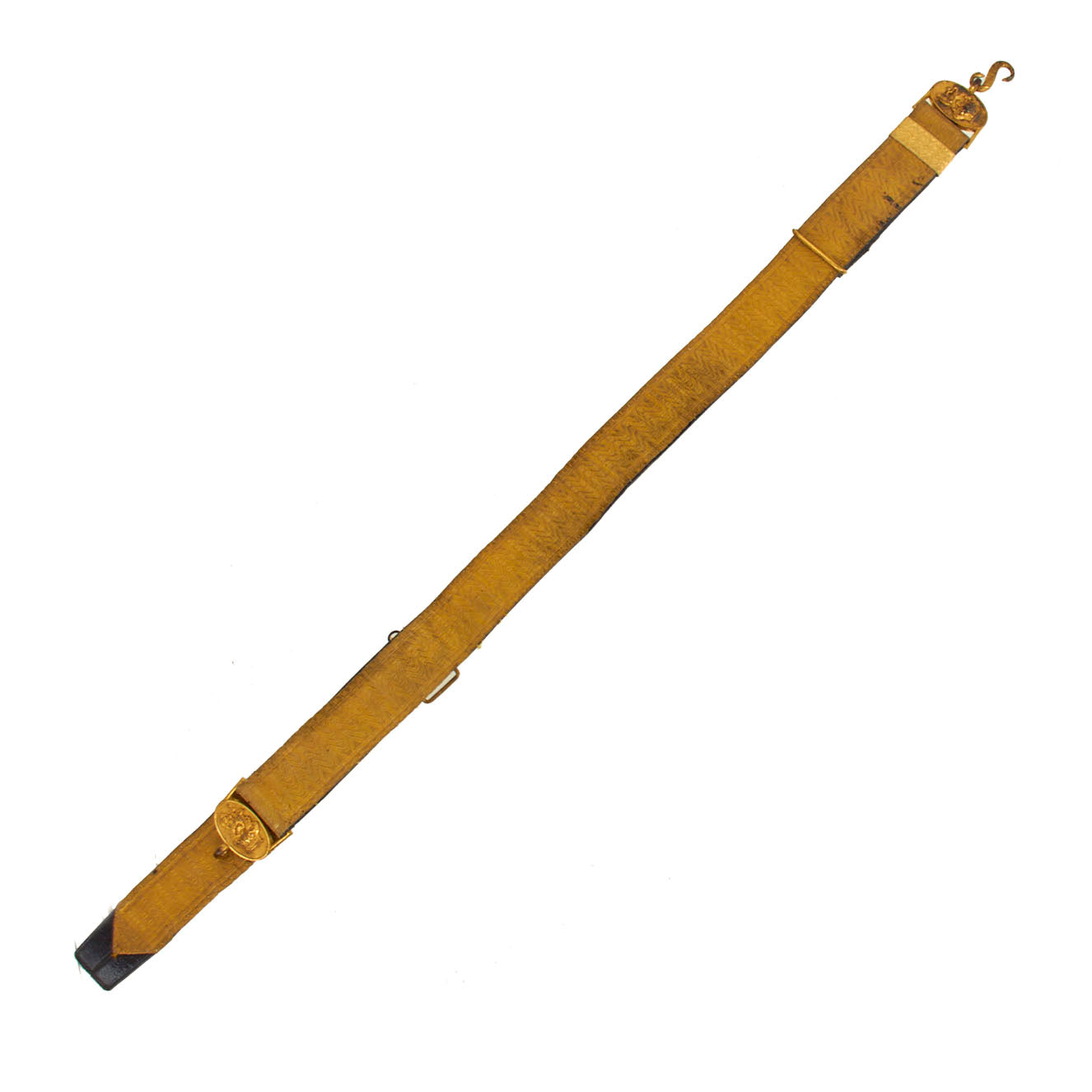 Like most "Gimp" belts, it is constructed of a folded leather body with gold "gimped" embroidery attached to the front. The belt its gold buckles and sliders in place, however the gold embroidered cloth portion has had the edge seams pop on part of the belt, so it is separated from the leather backing. In the current setup it measures approximately 30 inches from the hook to the other buckle, but looks like it probably extend about another 5 inches.