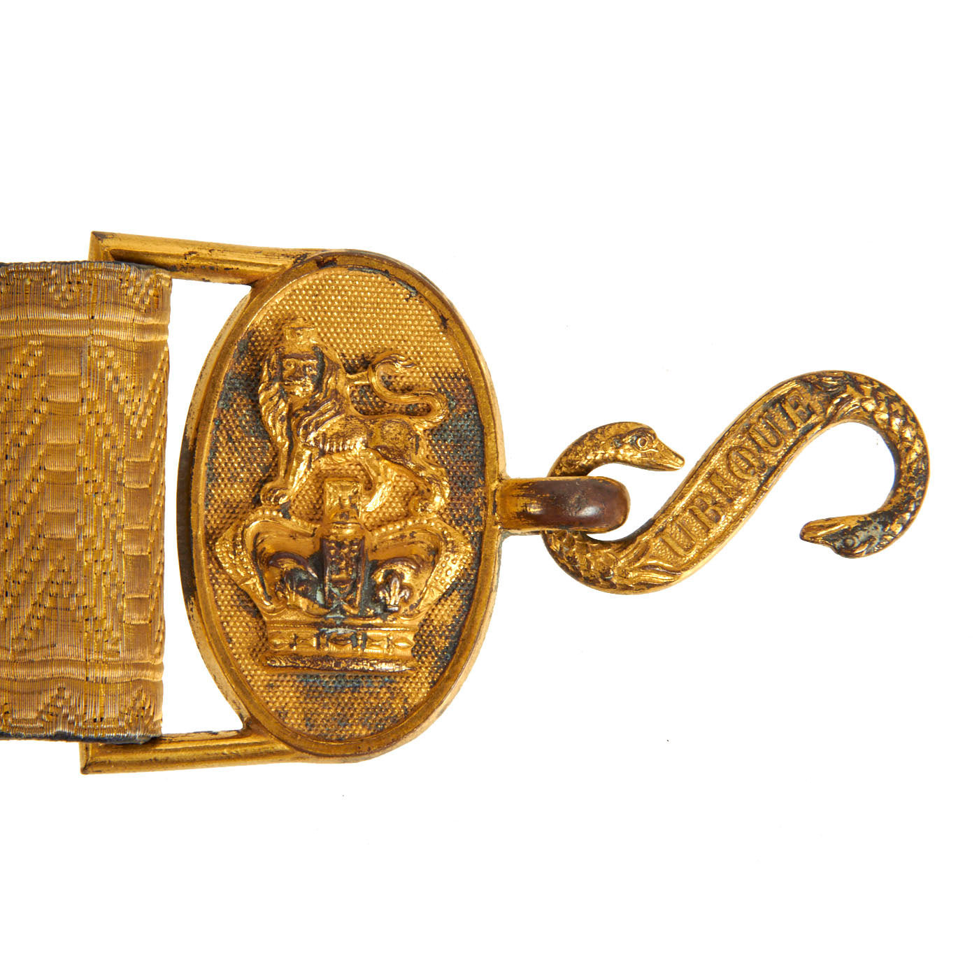 Original Item: One Set Only. Directly out of the attic! This is an original Victorian era Officer's "Gimp" Belt from the Royal Artillery regiment of the British Army. It has two "Queen's Crown" buckles, joined by an "S-hook" embossed with UBIQUE (Everywhere), the short form of the Royal Artillery's Motto, Ubique Quo Fas Et Gloria Ducunt (Everywhere, Where Fate and Glory Lead).