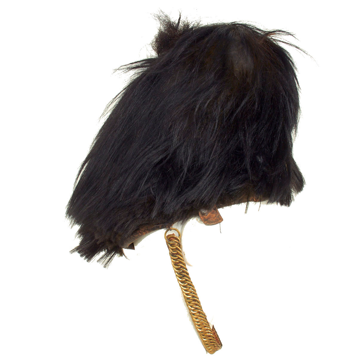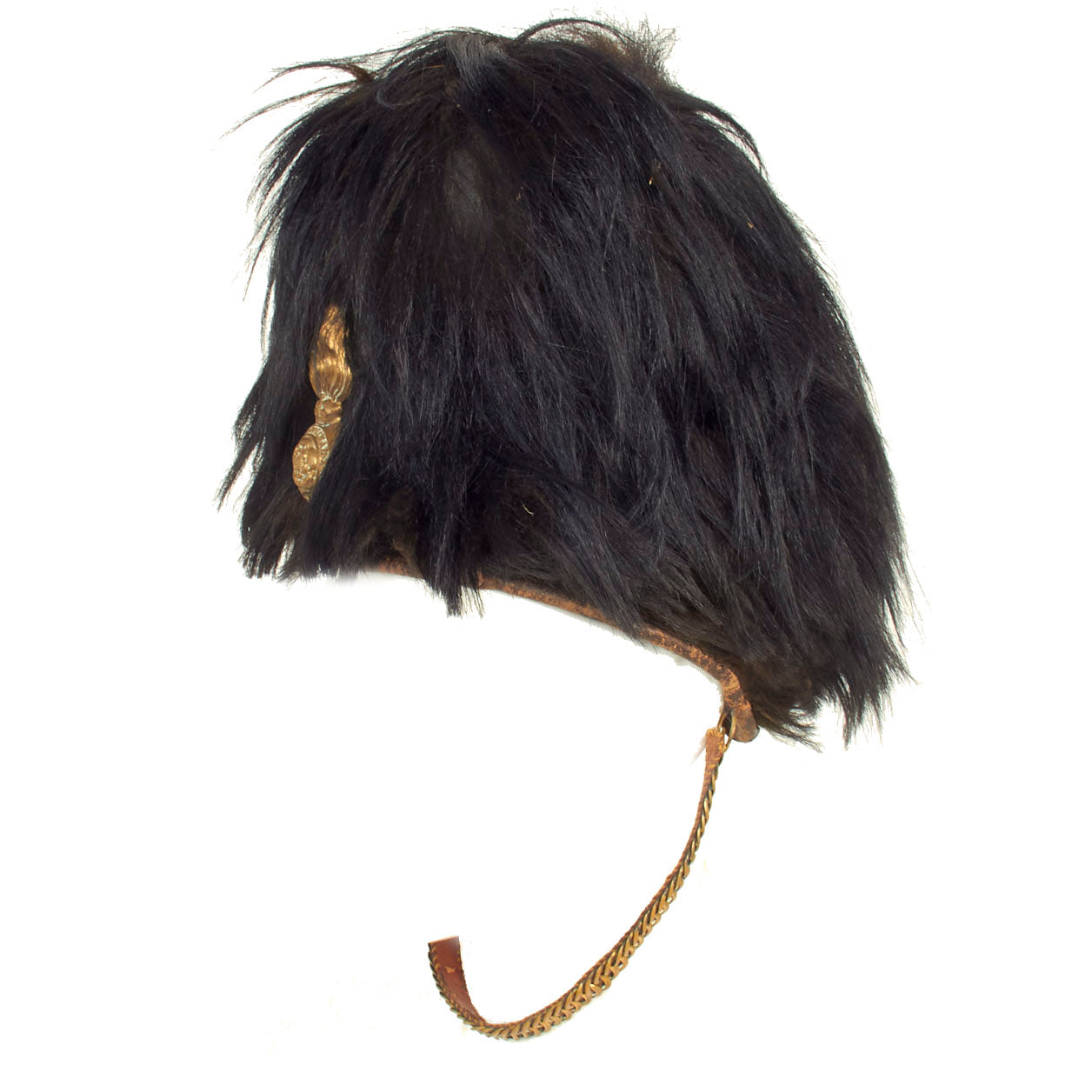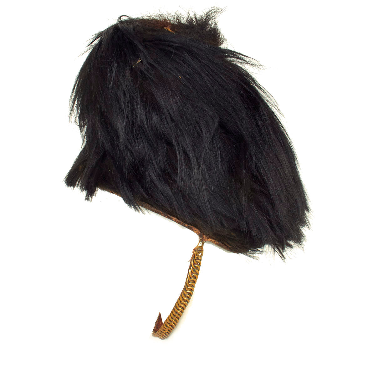 Original Item: Only One Available. In the United Kingdom busbies are of two kinds: (a) the hussar busby, cylindrical in shape, with a bag; this is worn by hussars and the Royal Horse Artillery; (b) the rifle busby, a folding cap of astrakhan (curly lambswool) formerly worn by rifle regiments, in shape somewhat resembling a Glengarry but taller. Both have straight plumes in the front of the headdress. The headdress is worn with full dress by the Waterloo Band of The Rifles, the Royal Horse Artillery and ceremonial detachments at regimental expense. In its hussar version it is now made of black nylon fur, although Bandmasters still retain the original animal fur. The busby should not be mistaken for the much taller bearskin cap, worn most notably by the five regiments of Foot Guards of the Household Division (Grenadier, Coldstream, Scots, Irish and Welsh Guards). Around 1900 the word "busby" was used colloquially to denote the tall bear and racoonskin "caps" worn by foot guards and fusiliers and the feather bonnets of Highland infantry. This usage is now obsolete.