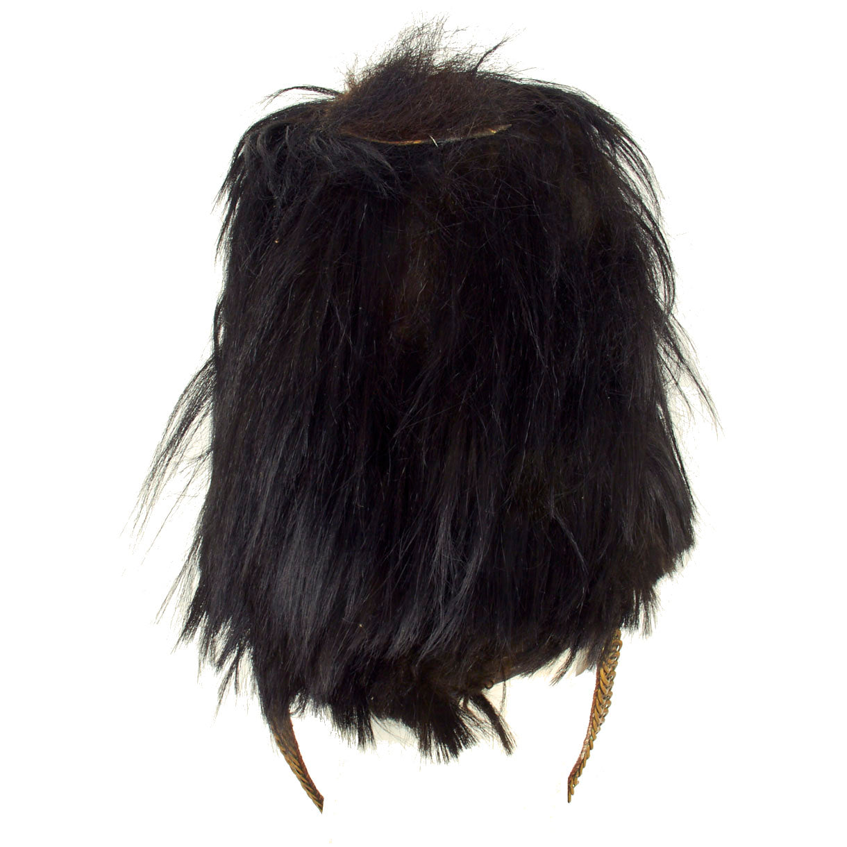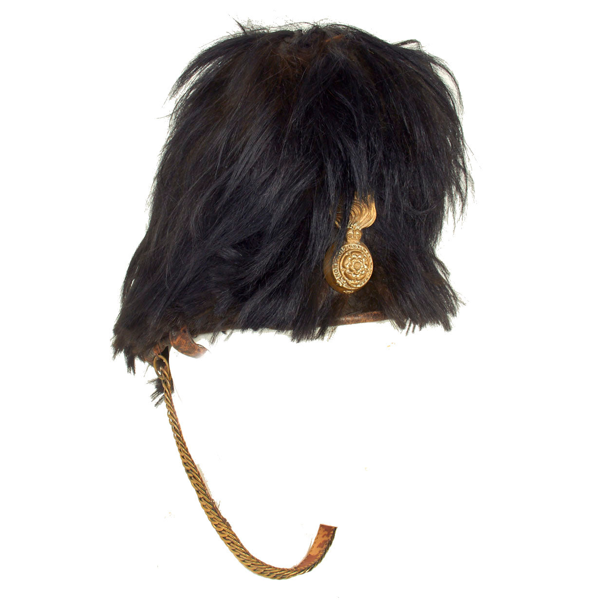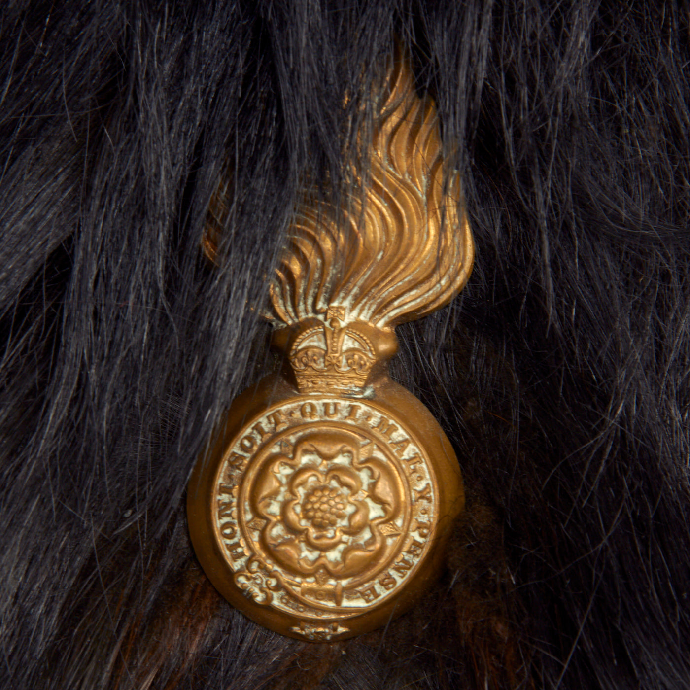 Original Item: Only One Available. In the United Kingdom busbies are of two kinds: (a) the hussar busby, cylindrical in shape, with a bag; this is worn by hussars and the Royal Horse Artillery; (b) the rifle busby, a folding cap of astrakhan (curly lambswool) formerly worn by rifle regiments, in shape somewhat resembling a Glengarry but taller. Both have straight plumes in the front of the headdress. The headdress is worn with full dress by the Waterloo Band of The Rifles, the Royal Horse Artillery and ceremonial detachments at regimental expense. In its hussar version it is now made of black nylon fur, although Bandmasters still retain the original animal fur. The busby should not be mistaken for the much taller bearskin cap, worn most notably by the five regiments of Foot Guards of the Household Division (Grenadier, Coldstream, Scots, Irish and Welsh Guards). Around 1900 the word "busby" was used colloquially to denote the tall bear and racoonskin "caps" worn by foot guards and fusiliers and the feather bonnets of Highland infantry. This usage is now obsolete.