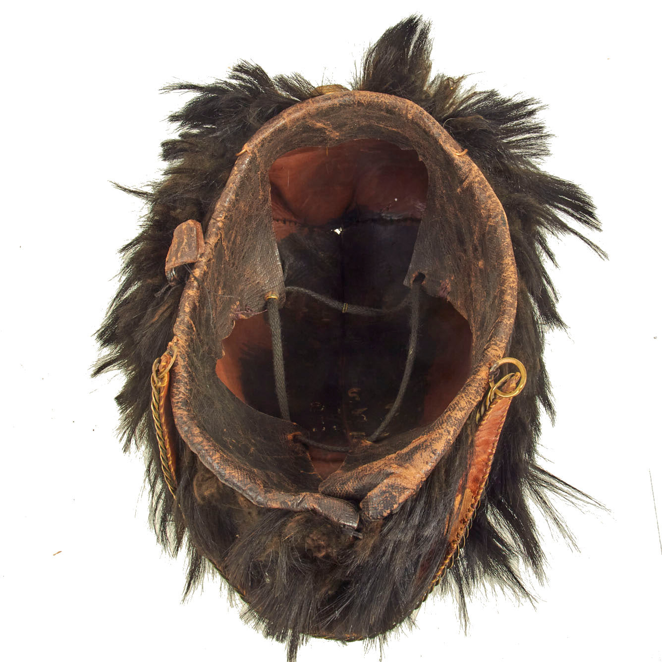 The busby is in good, service worn condition. Almost all of the original fur is still present though there are areas of loss. The chin strap is still completely attached though you should use caution as it is only attached by a few threads. The front badge is in great condition and displays the Honi soit qui mal y pense motto around the central part. Honi soit qui mal y pense is a maxim in the Anglo-Norman language, a dialect of Old Norman French spoken by the medieval ruling class in England, meaning "shamed be whoever thinks ill of it", usually translated as "shame on anyone who thinks evil of it" It is the motto of the British chivalric Order of the Garter, the highest of all British knighthoods, except in Scotland.