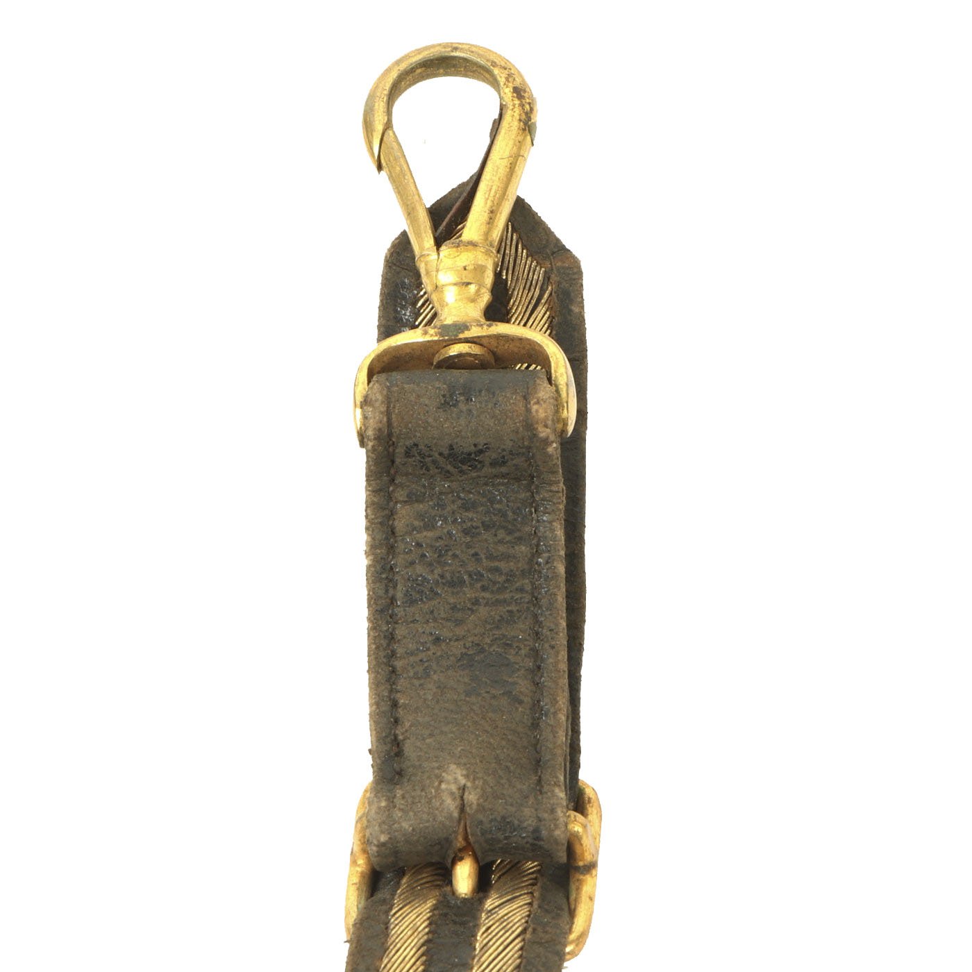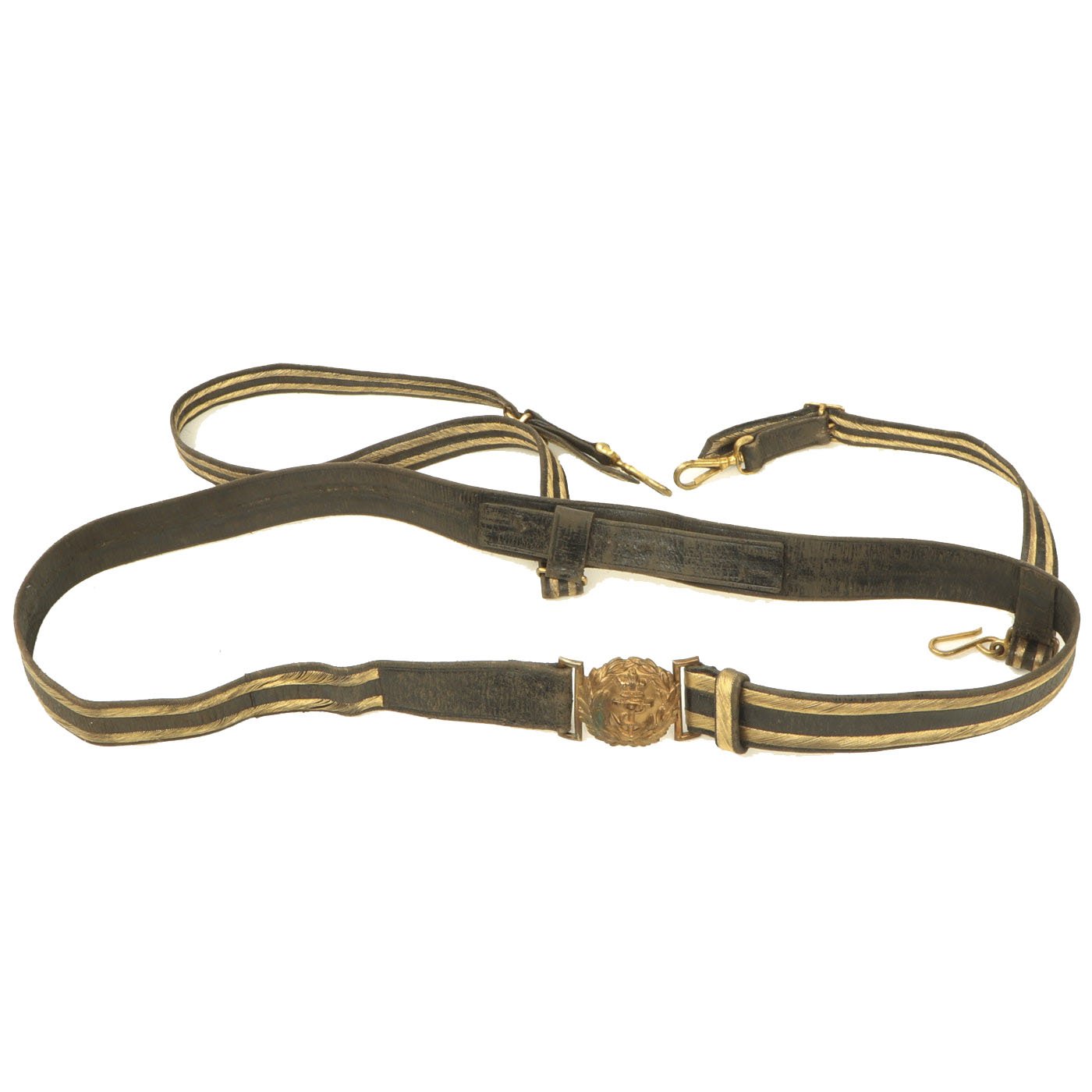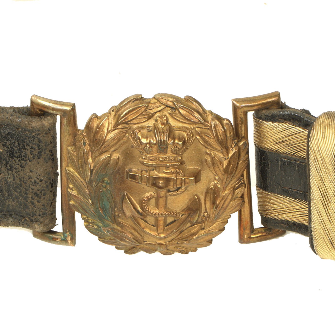 Original Item: Only One Available. Directly out of the attic! This is an original Victorian Era Leather and brass bullion covered sword belt, as used by Officers in the Royal Navy. The belt measures approximately 48 inches in overall length, so this was probably for a rather sizeable officer. It has the correct "fouled anchor" on the belt buckle, topped with the "Queen's Crown" for Queen Victoria. There are two removable straps for attaching to the sword's scabbard. There is also the usual hook next to one hanger, for holding the sword vertical when needed.