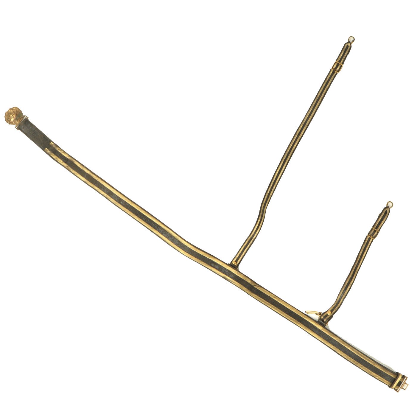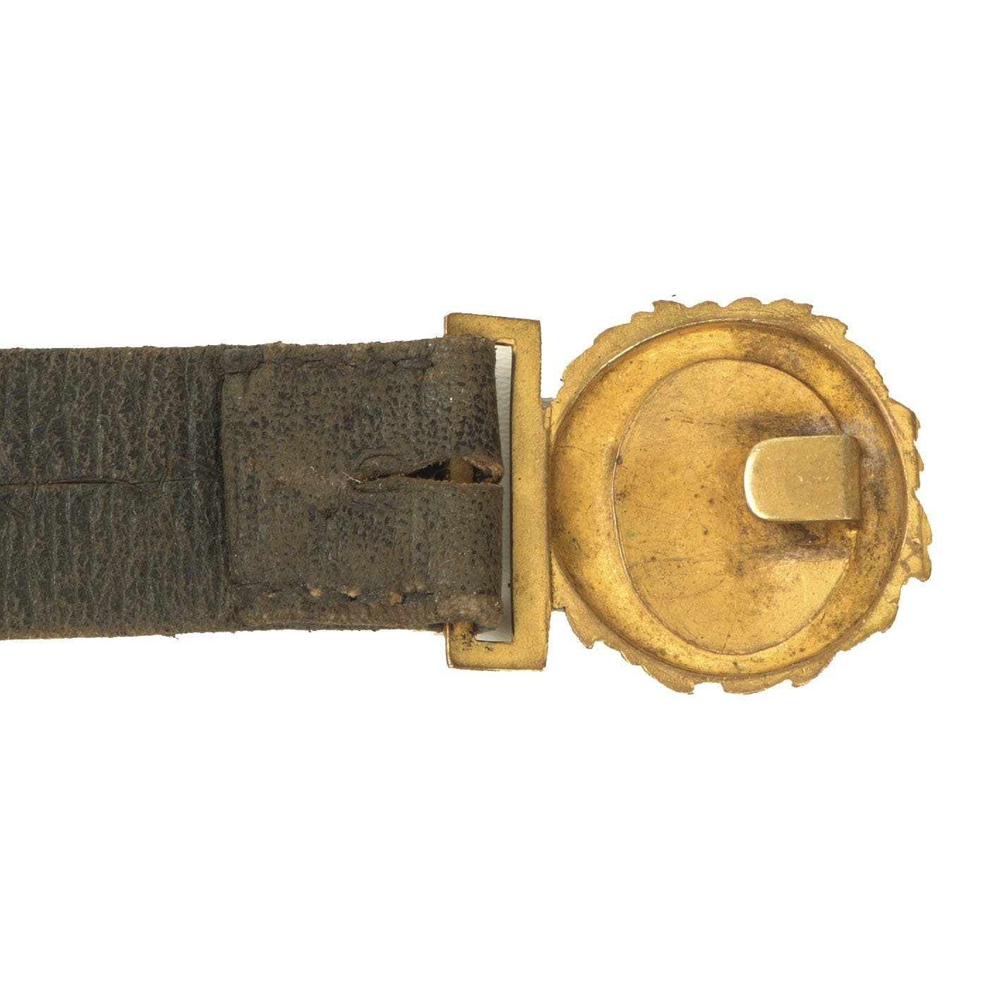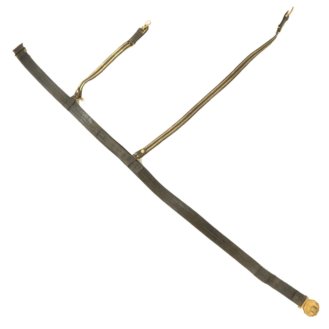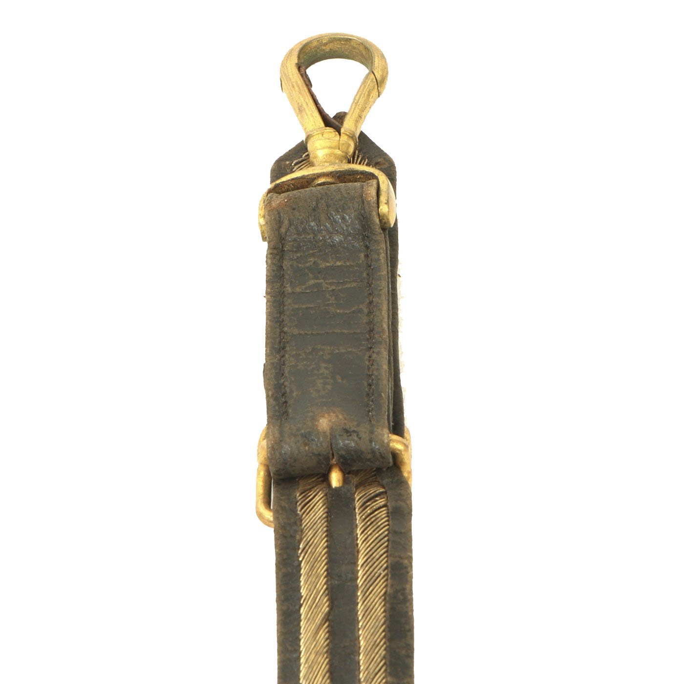 Original Item: Only One Available. Directly out of the attic! This is an original Victorian Era Leather and brass bullion covered sword belt, as used by Officers in the Royal Navy. The belt measures approximately 48 inches in overall length, so this was probably for a rather sizeable officer. It has the correct "fouled anchor" on the belt buckle, topped with the "Queen's Crown" for Queen Victoria. There are two removable straps for attaching to the sword's scabbard. There is also the usual hook next to one hanger, for holding the sword vertical when needed.