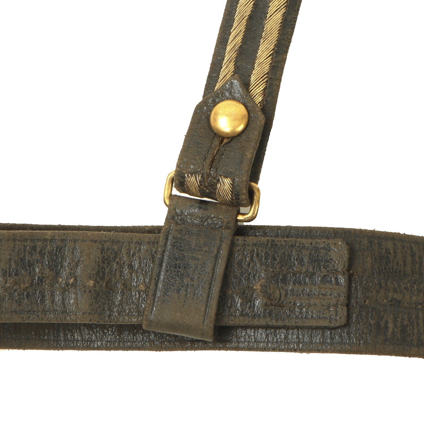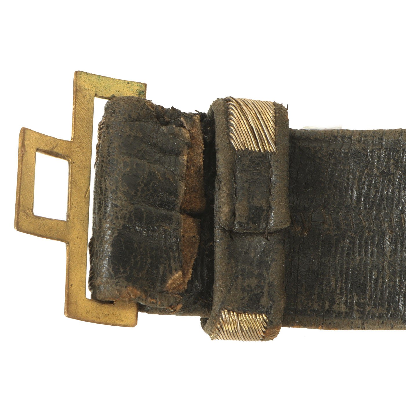 The belt is constructed of leather and bullion over fabric, and is in very good shape considering the age. There is some wear, but no structural damage, and all the hooks and buckles are intact. A lovely old belt, well over 100 years of age. Ready to display, or even wear!