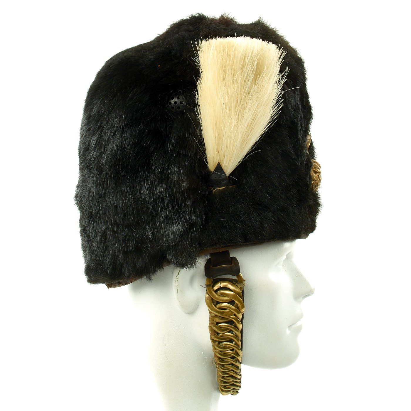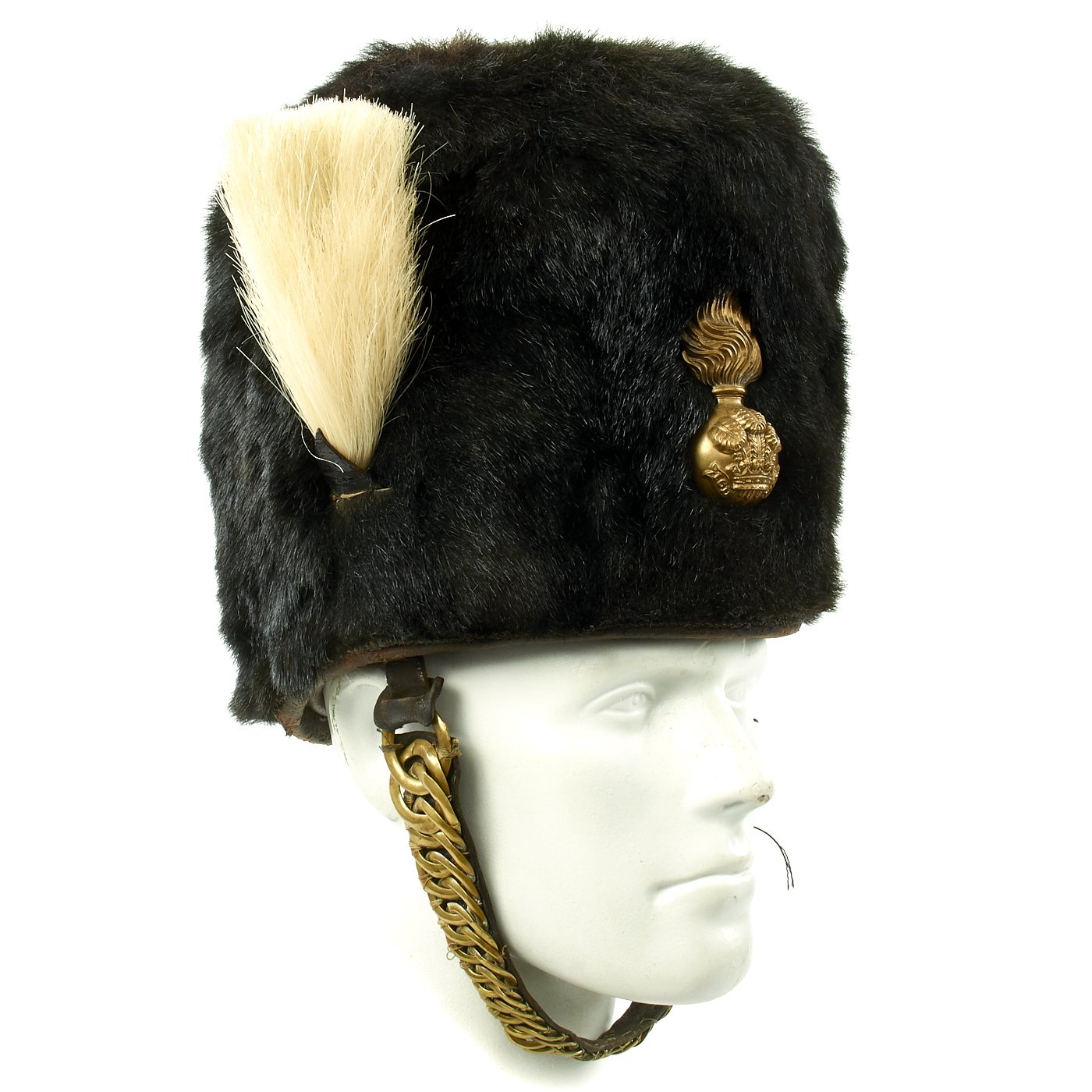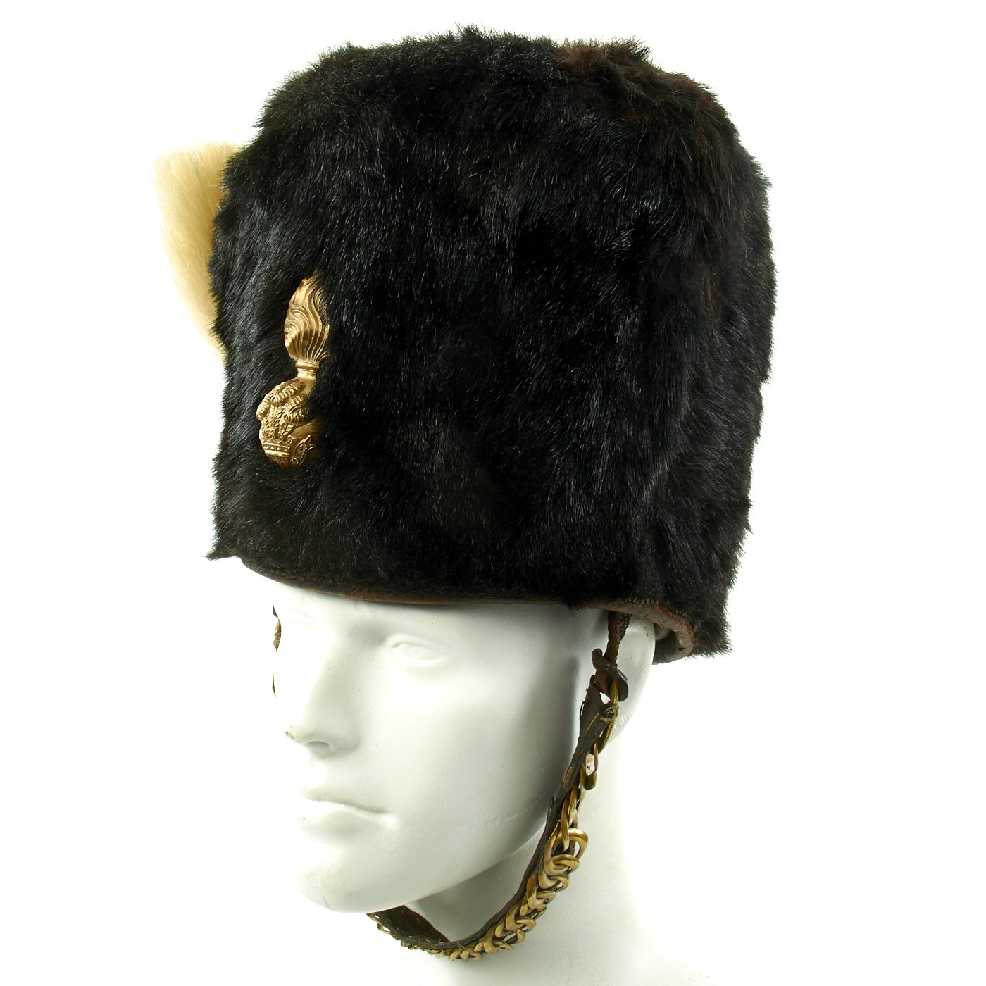 Original Item: Only One Available. Royal Welsh Fusiliers pattern Bearskin helmet fitted white hacker and correct original grenade badge of the Royal Welsh Fusiliers. The busby is complete with the linked chain scales chinstrap. Body of the busby remains in good overall condition. Size is approximately a US 7 (56cm).
