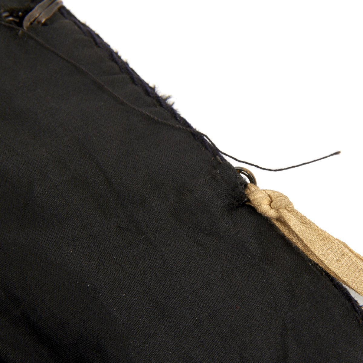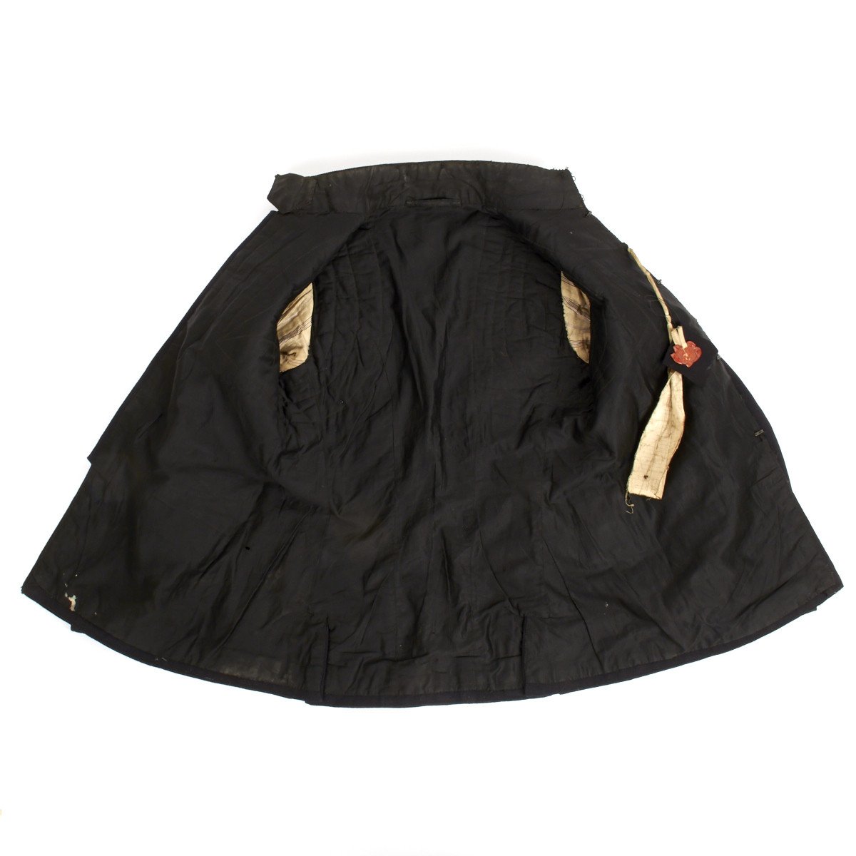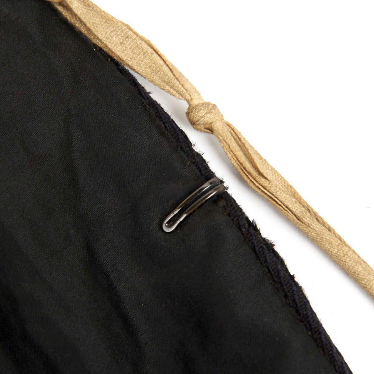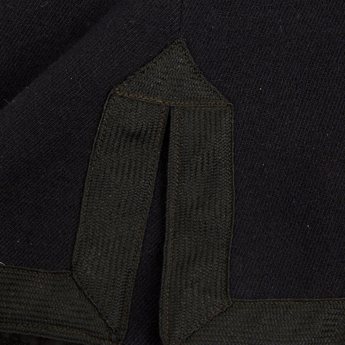 Here is a "sealed pattern" Victorian Patrol Jacket. The Patrol Jacket was an every day work tunic used by the military, in this case a cavalryman. It is black wool with heavy mohair trimming referred to as "French braid" around the pockets and hems. It has no buttons and closes at the front with internal hooks.