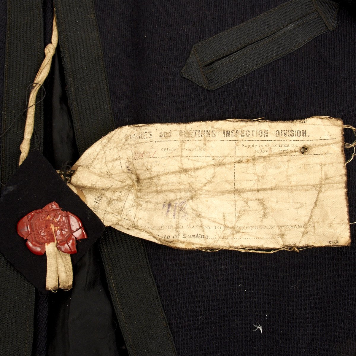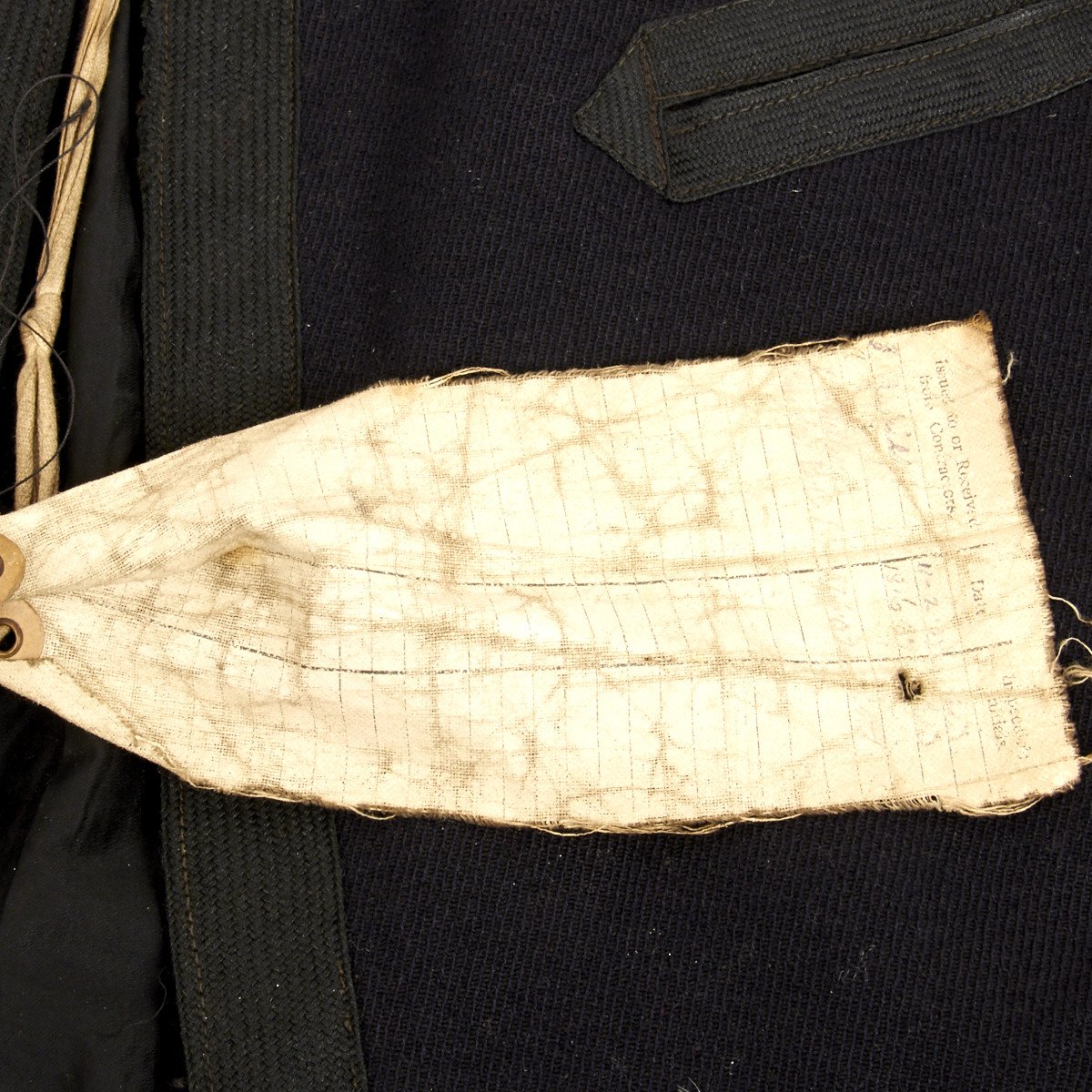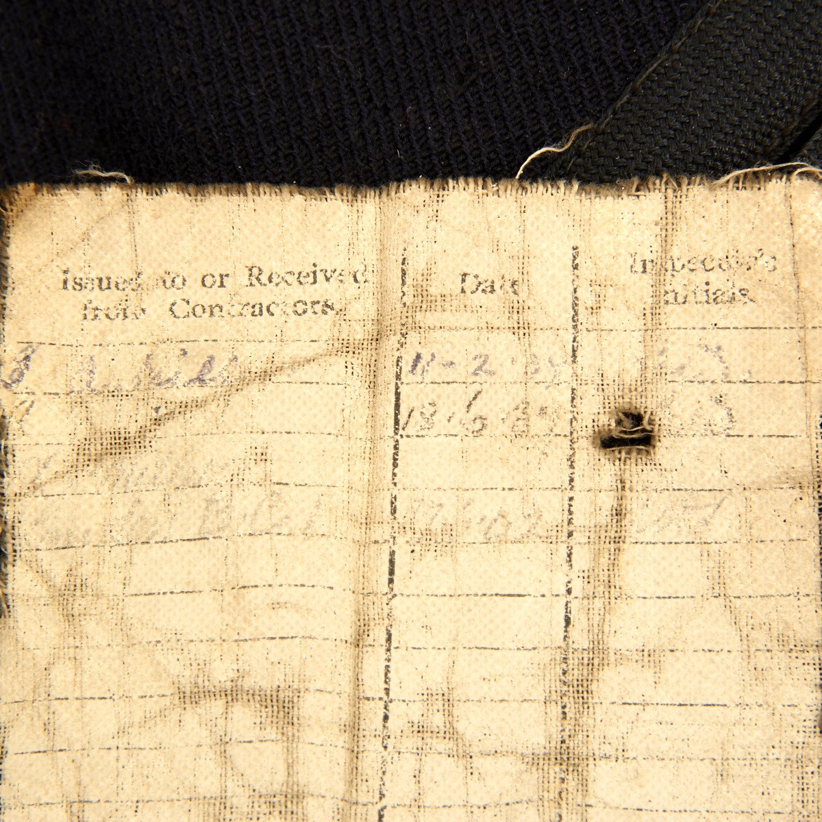 The label, a form of printed cloth is understandably worn being about 130 years old and one can still make out SPARES AND CLOTHING DIVISION. The rear of the label shows dates, in this case just two entries, when the garment was released to a manufacturer. The faint dates appear to be in the 1889. The garment is fully lined in black and the lining of the sleeves is what appears to be mattress ticking.